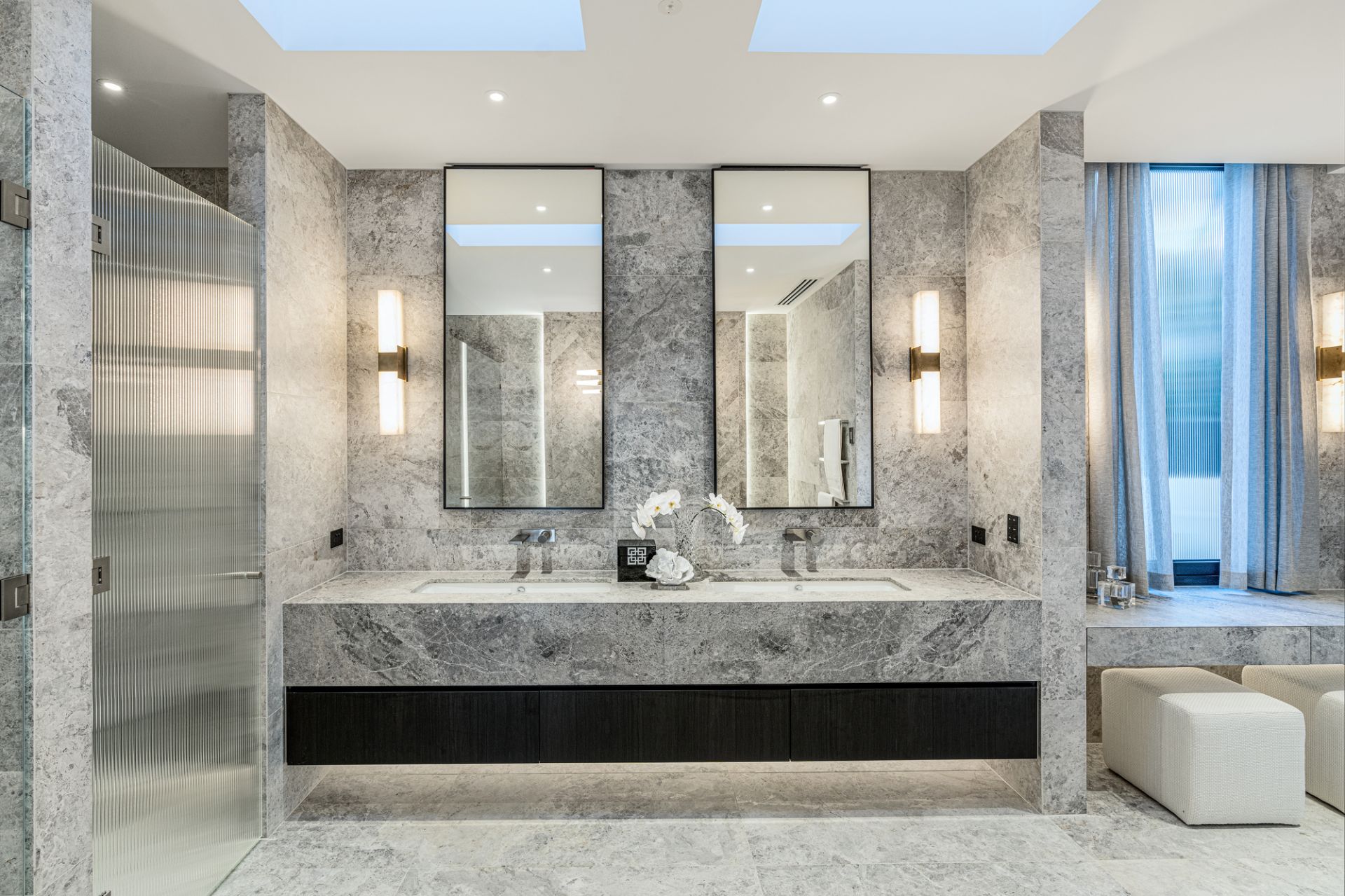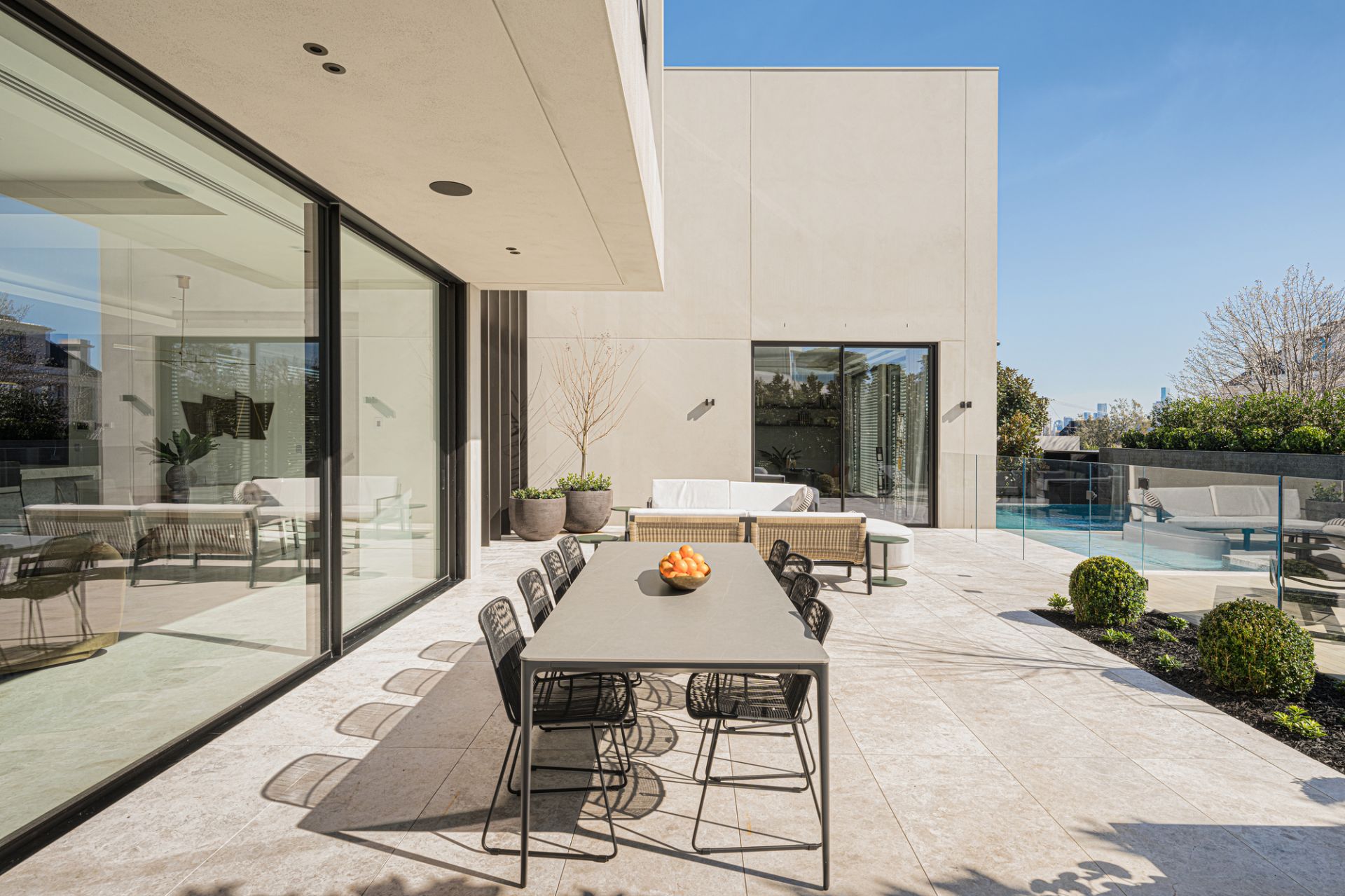 At the rear, a breathtaking formal living and dining zone is an entertainer's dream flowing on to another tranquil courtyard. Or, alternatively, take your guests up to the second floor where a lounge and bar area with a striking marble island opens on to a balcony with panoramic city views.