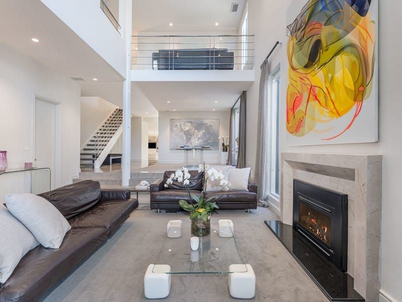 Entering the handsome home through the impressive oversized entry, soaring 6.1 metre ceilings immediately set the tone for the sublime interiors which categorise this exceptional offering. A serene formal living and dining space with striking double-height window and marble fireplace with gas fire provides an elegant spot to entertain guests or relax in during the winter months.