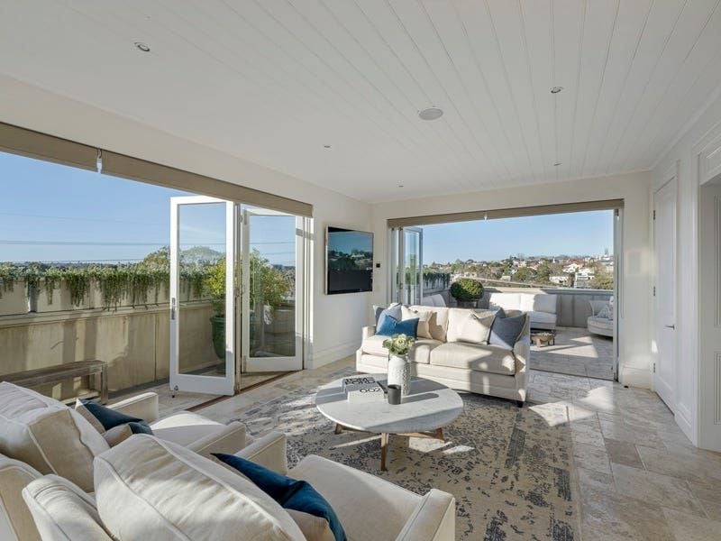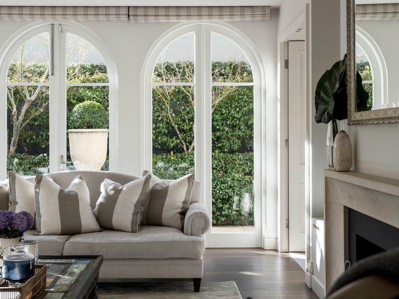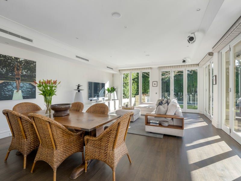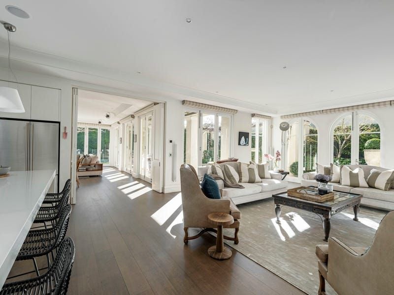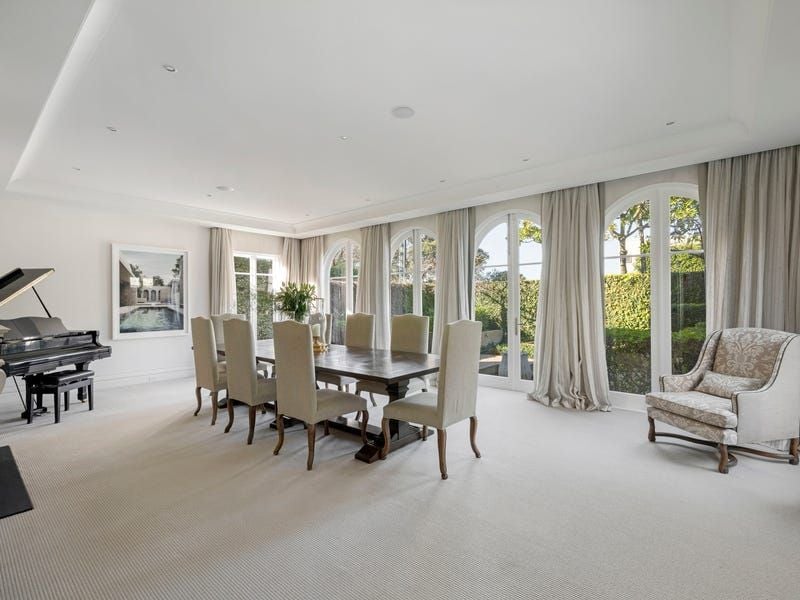 Picturesque Paul Bangay gardens set the tone for the magnificently private interior, introduced by a ceiling of wisteria and formal gardens that spill seamlessly from the formal dining room with an ambient gas fireplace. Northwestern sun encases the ground floor, flowing into the open-plan living, dining and family rooms, where bi-fold and French doors allow seamless access to the covered and heated terrace for poolside alfresco indulgence.