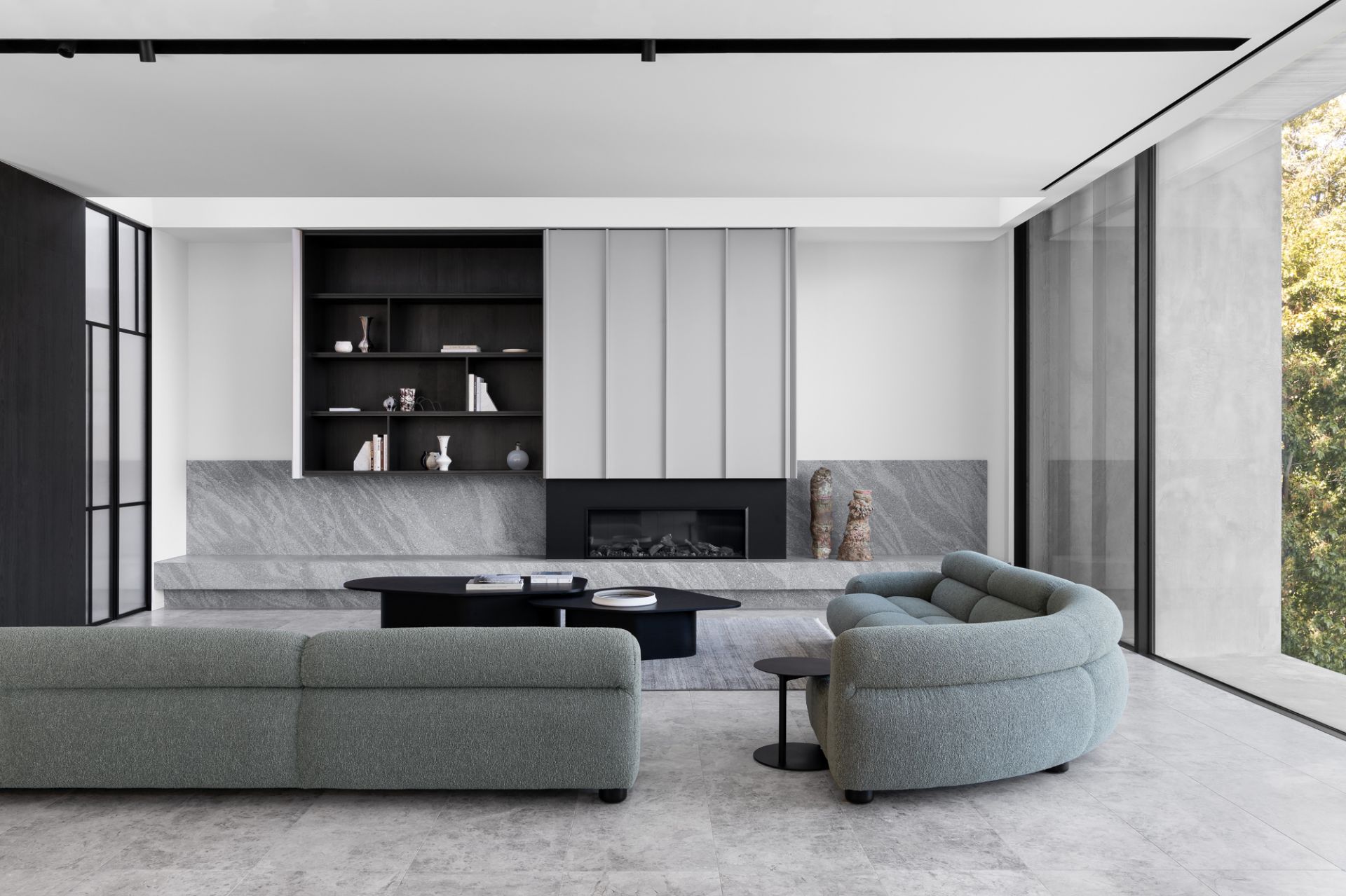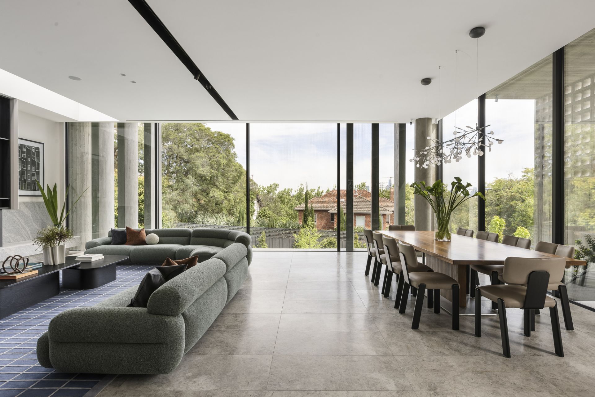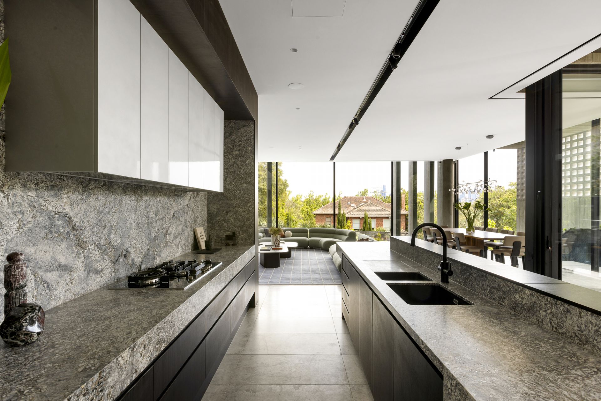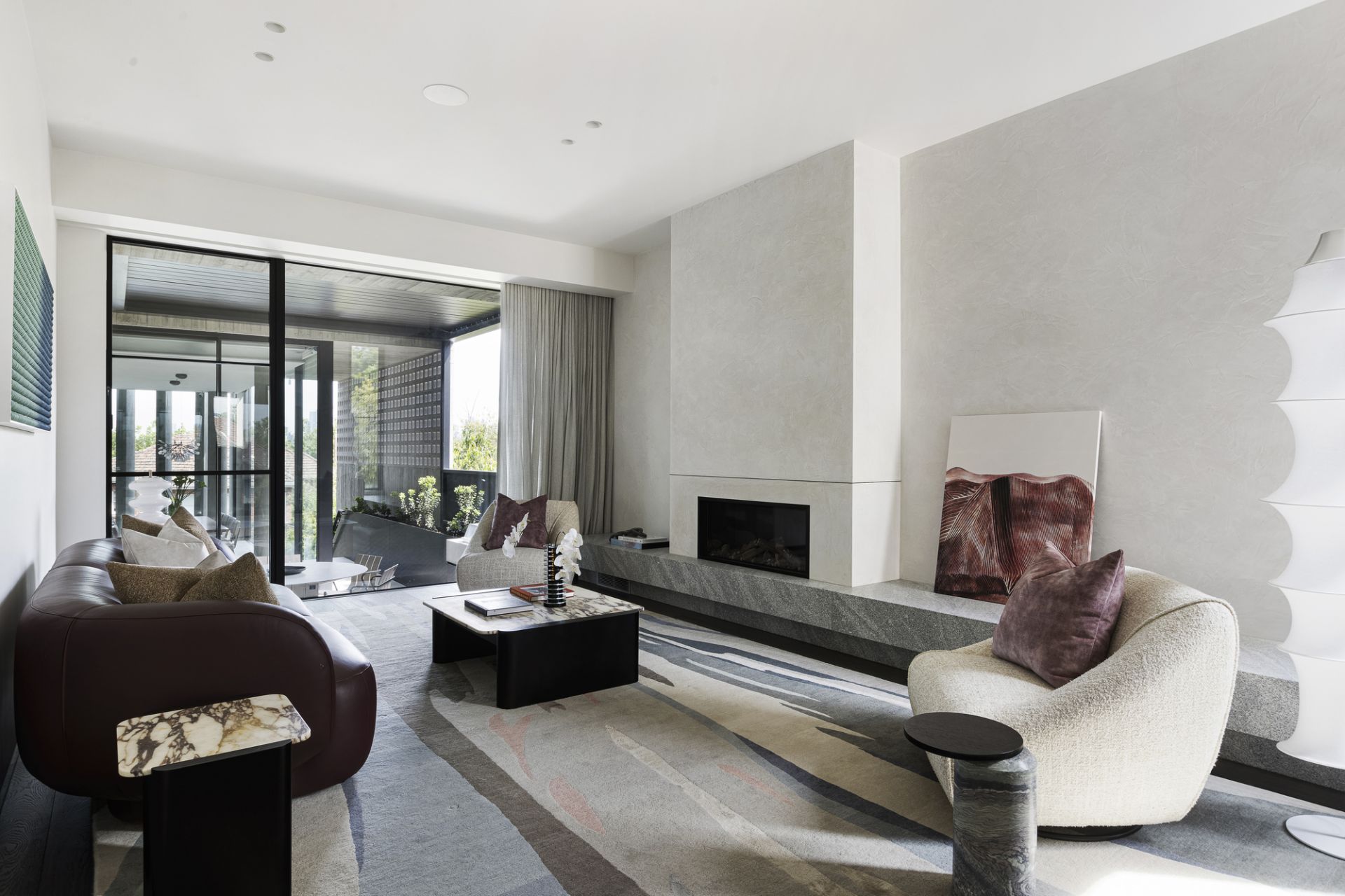 From the street, it makes a quiet yet commanding statement. Layers of board-formed concrete, brick, and breezeblock interplay with light and shadow, creating an exterior that’s both raw and refined. Inside, that same sense of drama continues, double-height ceilings open to vast living zones that flow seamlessly into landscaped gardens by Jack Merlo, where lush greenery softens the home’s sculptural edge.