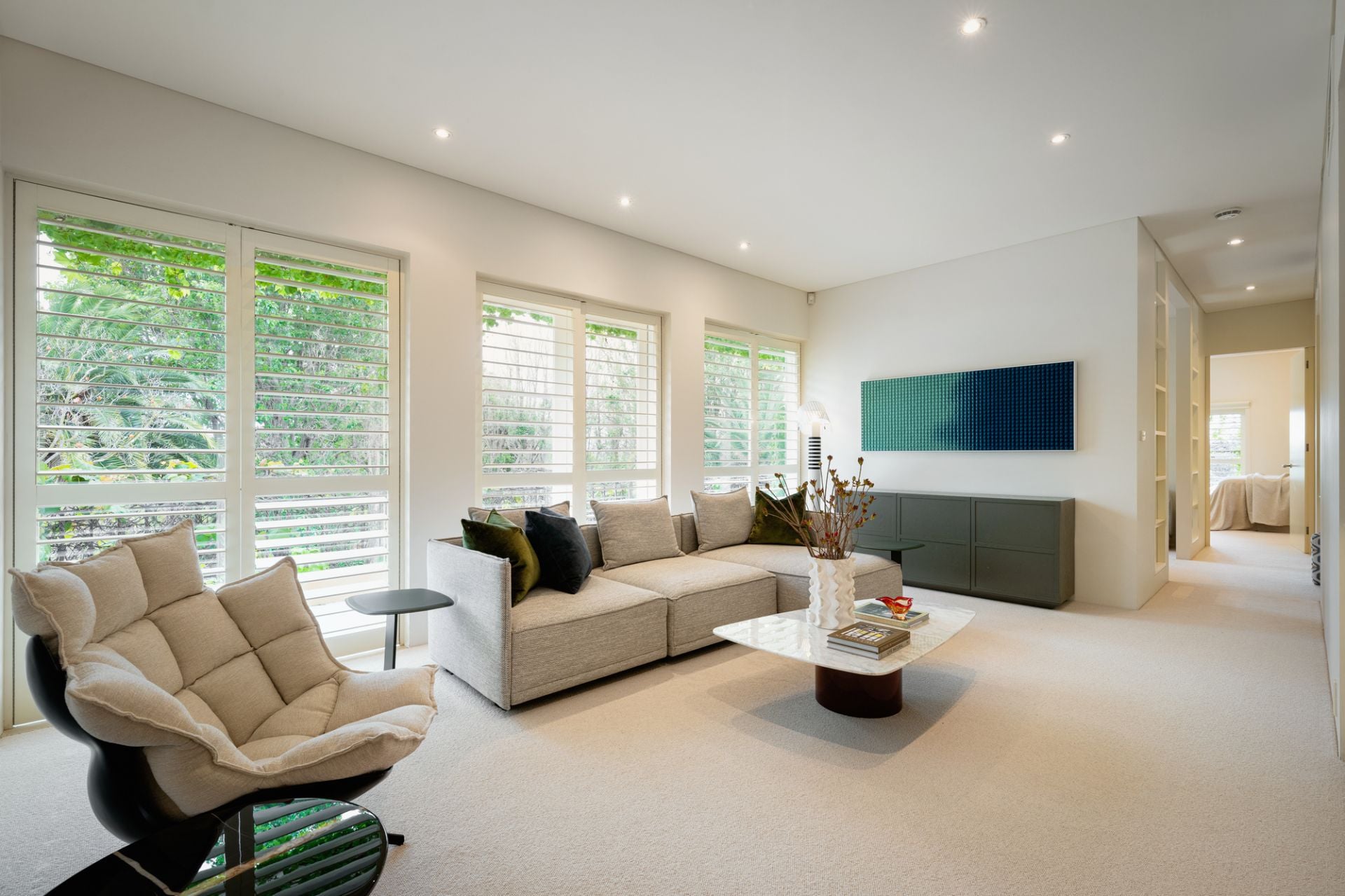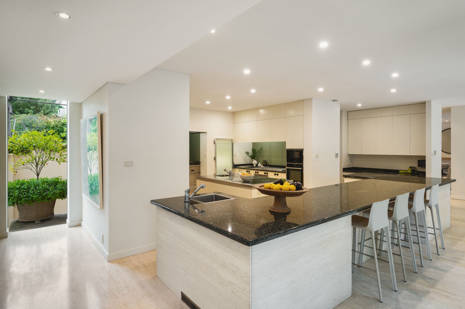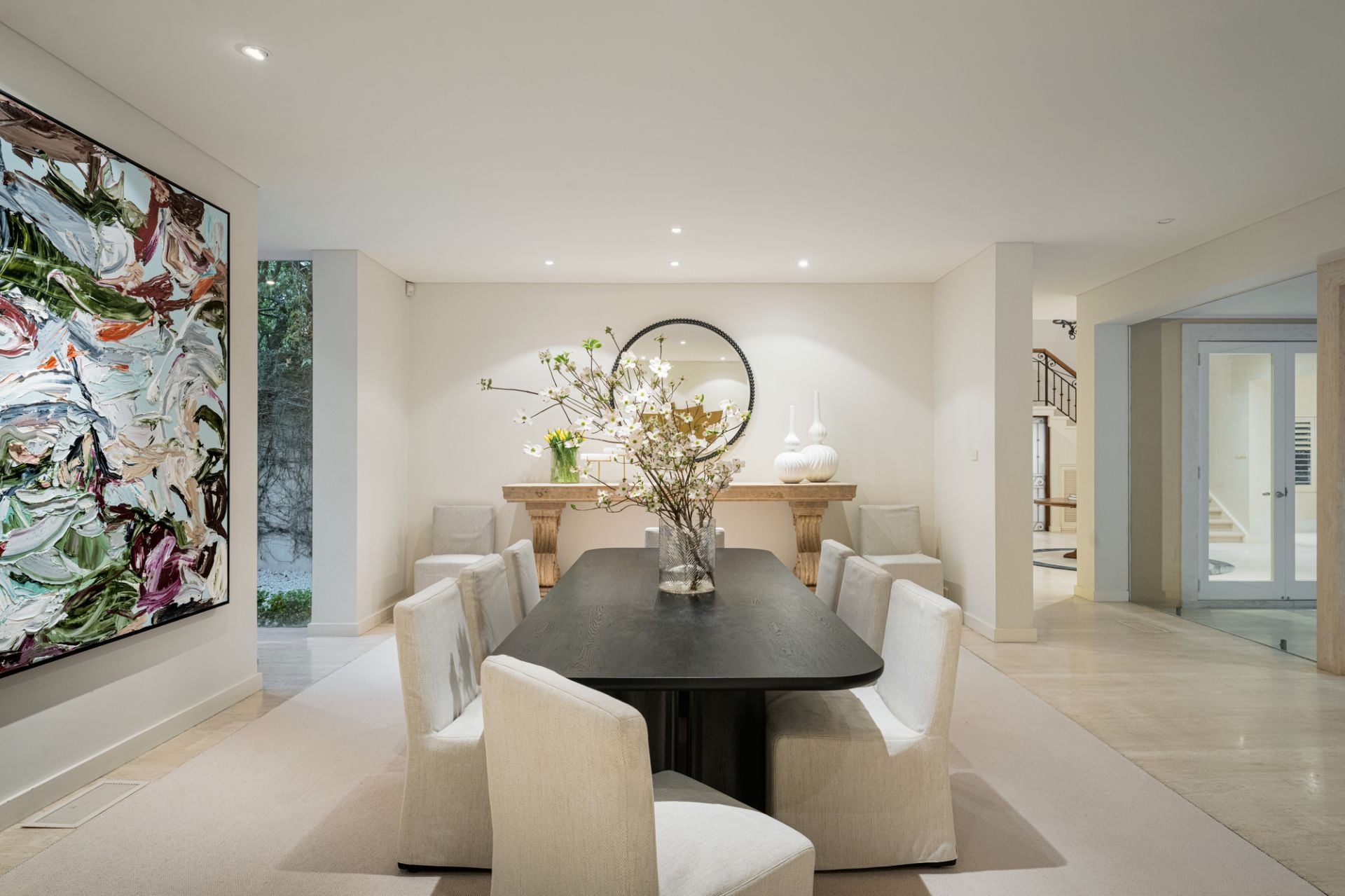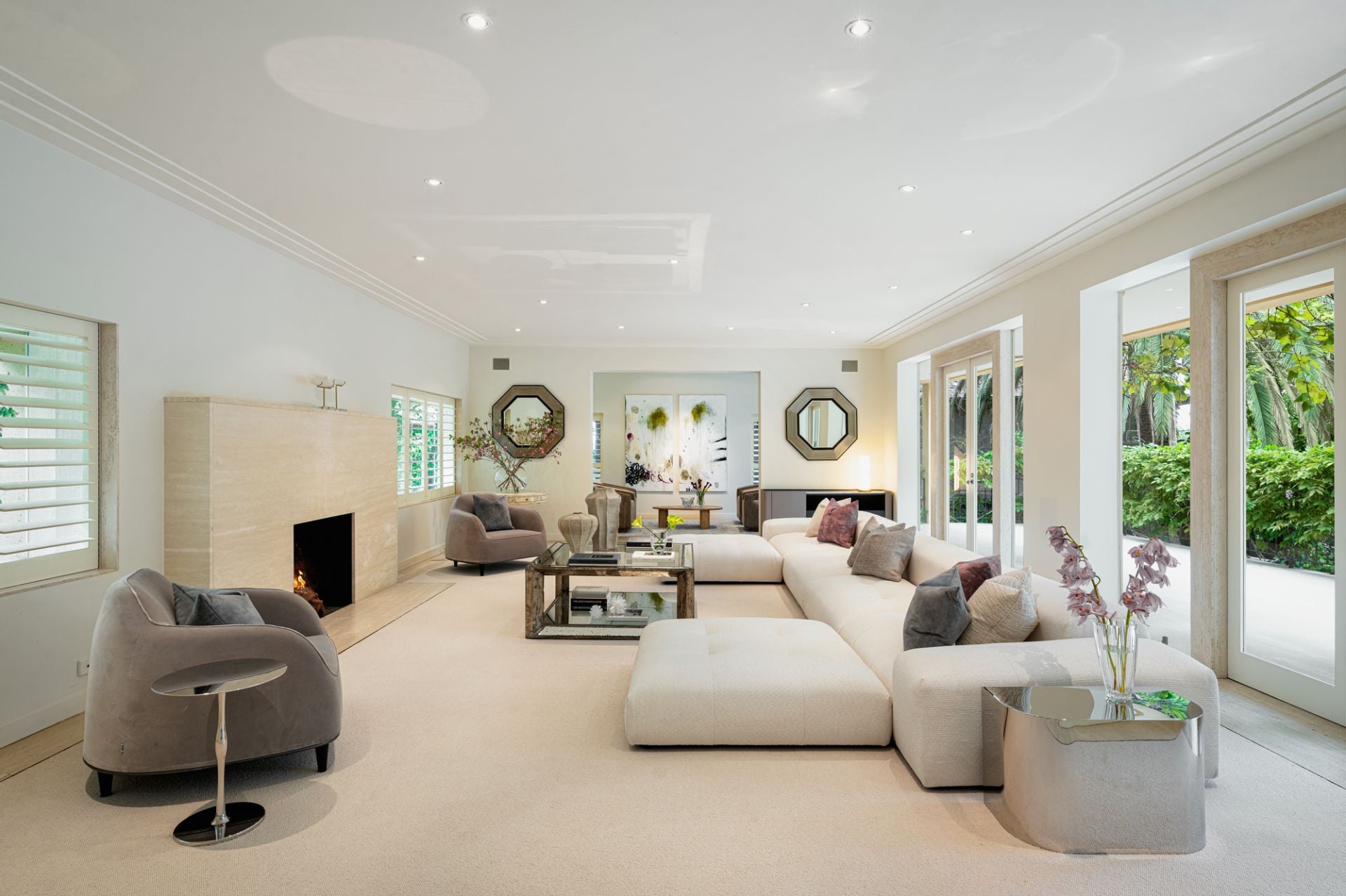 Stepping into the stunning home via a sweeping driveway and portico, a grand double-height travertine entry hall welcomes, offering the first view of the verdant gardens and outdoor entertaining precinct that the house has been designed to take full advantage of.