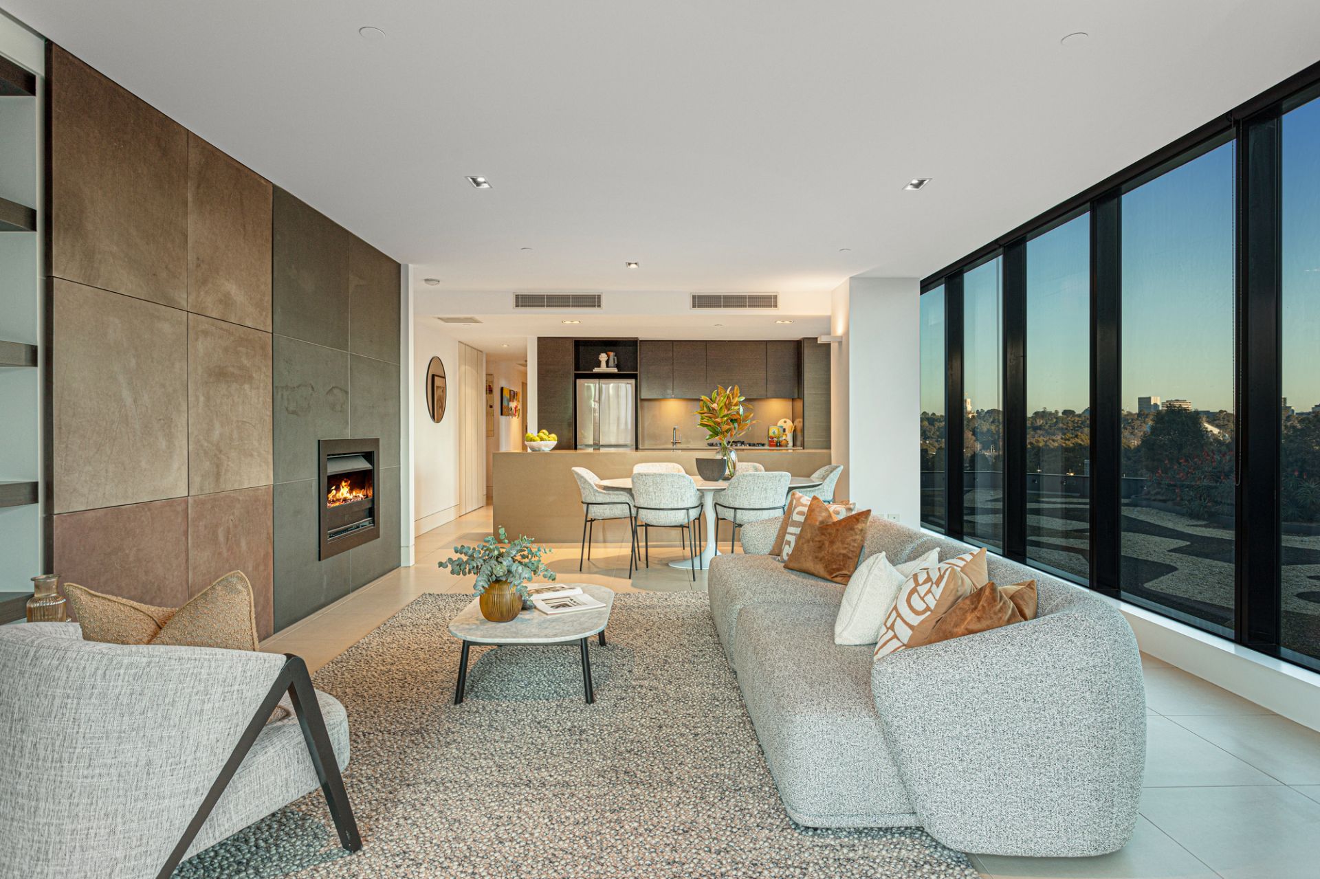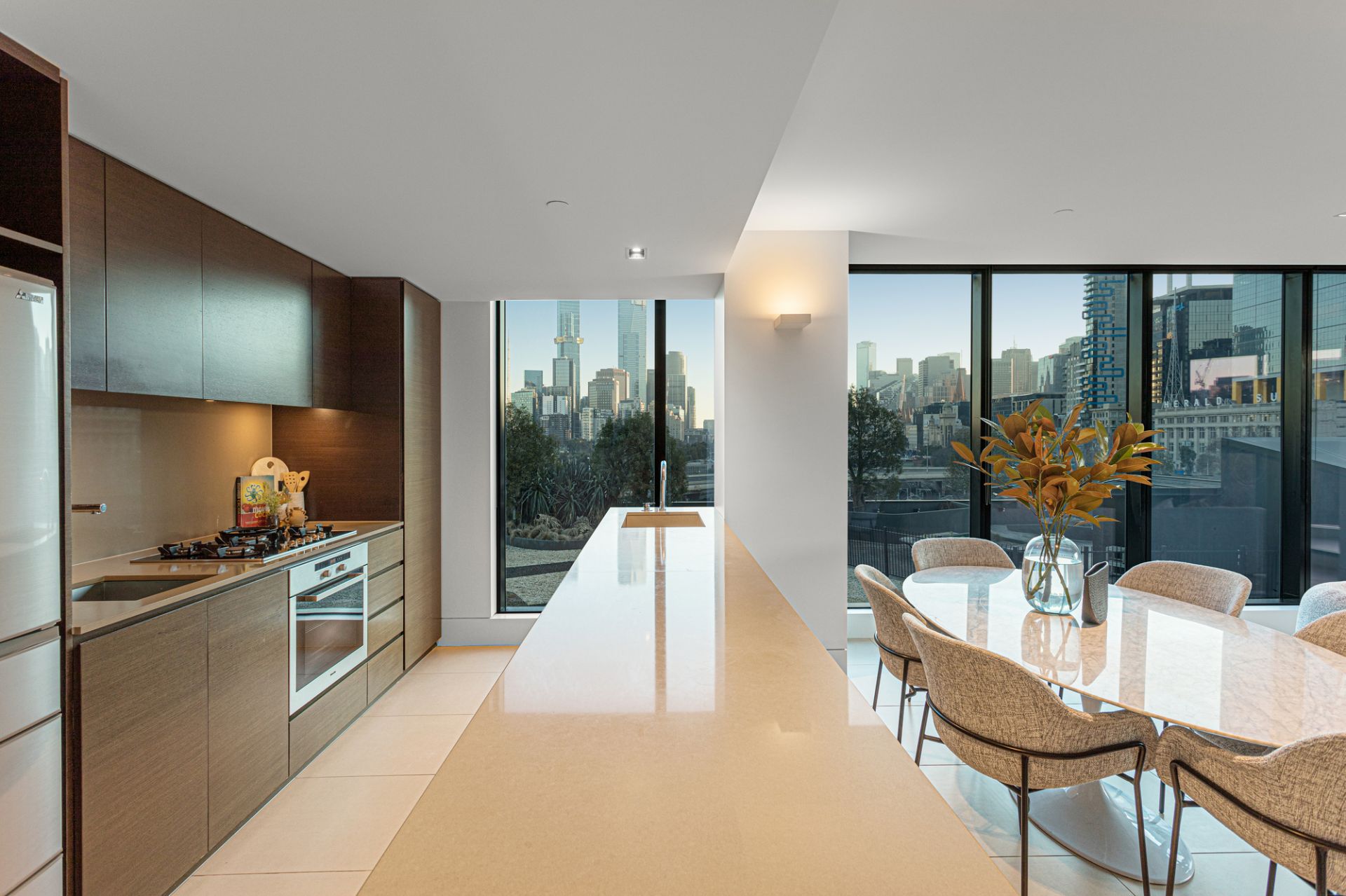 The chef-grade kitchen is equipped with European appliances, perfect for showcasing your culinary skills while guests admire the uninterrupted city views. The large, north-facing winter garden offers a sunlit space ideal for relaxation and entertaining.