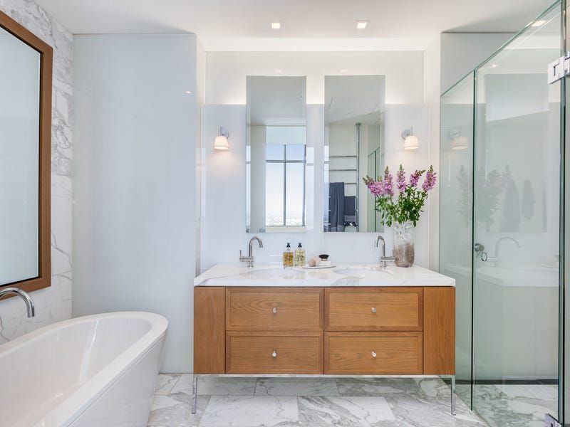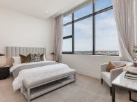 The tranquil master suite is positioned at the other end of the apartment and features a lavish walk-in robe/dressing room and palatial marble ensuite with double vanity and indulgent freestanding bath. A second bedroom with built-in robes also benefits from its own sparkling ensuite.