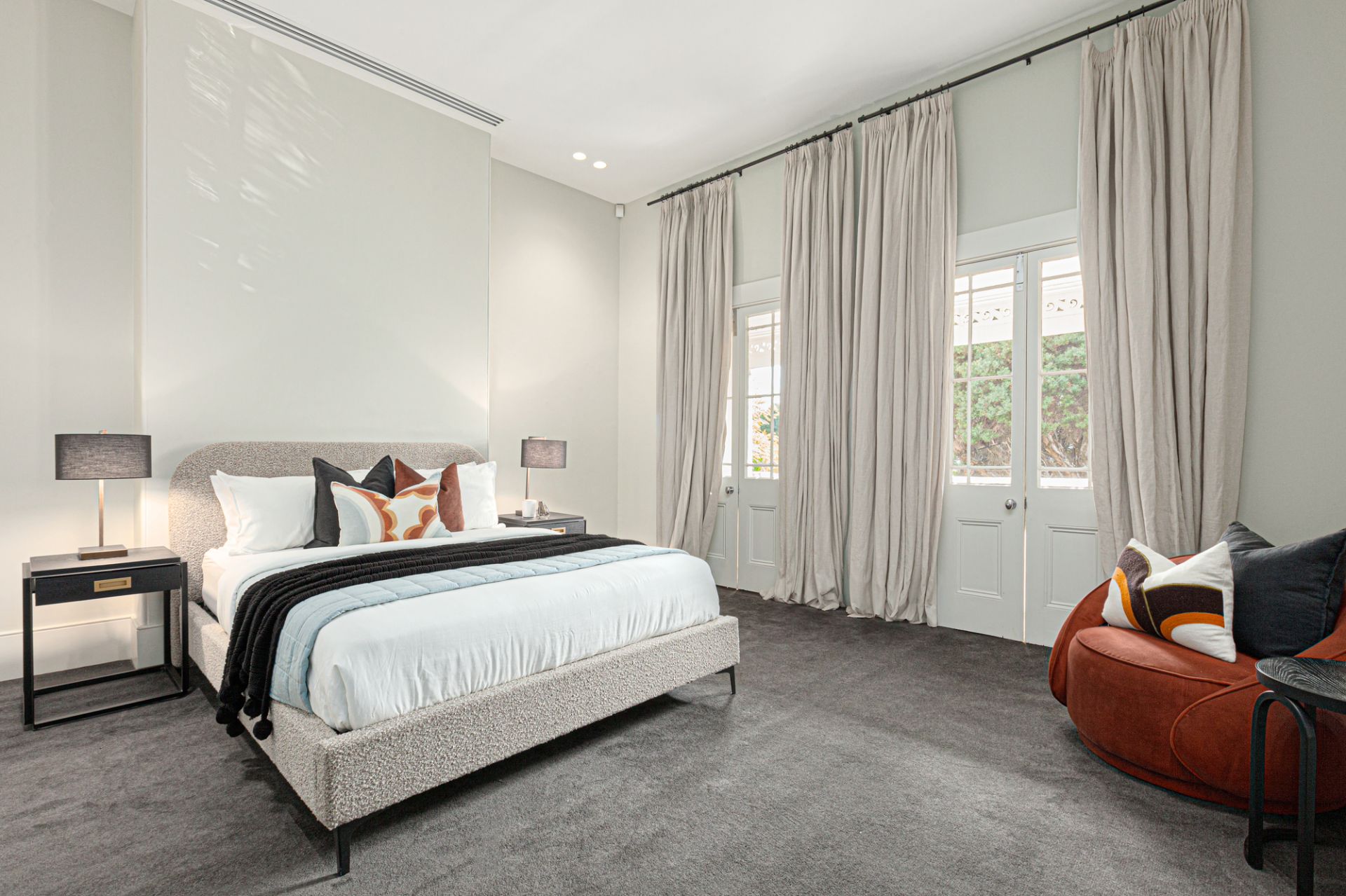 The generous open-plan informal living zone is made for entertaining with easy access to the back garden and outdoor dining area. The kitchen features marble benches, a marble island, stainless steel appliances, integrated Liebherr fridge/freezer and custom cabinetry. A mirrored cocktail bar and drinks cabinet is discreetly located in a wall of storage.