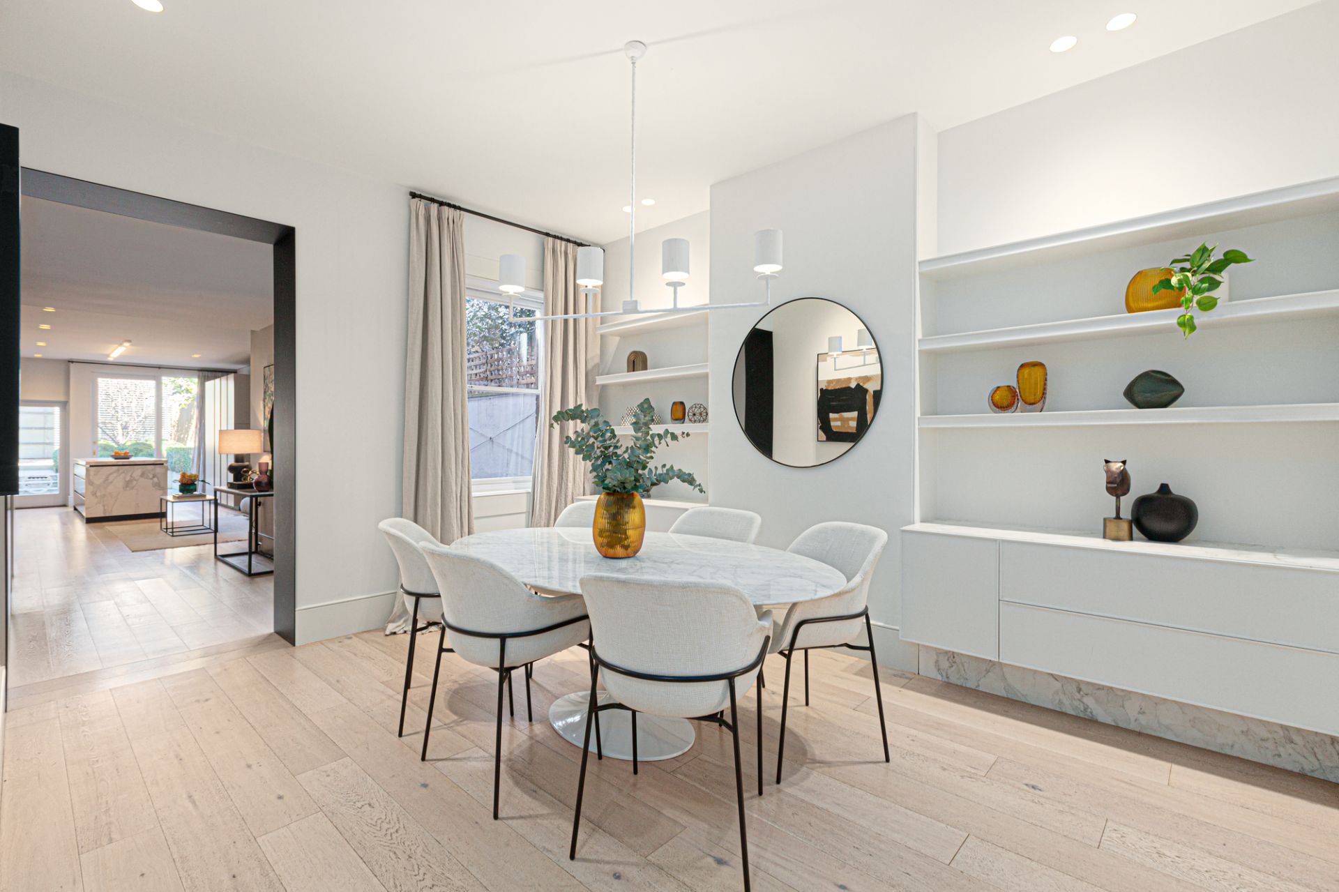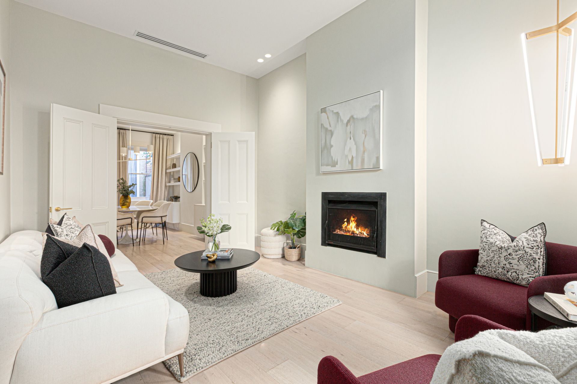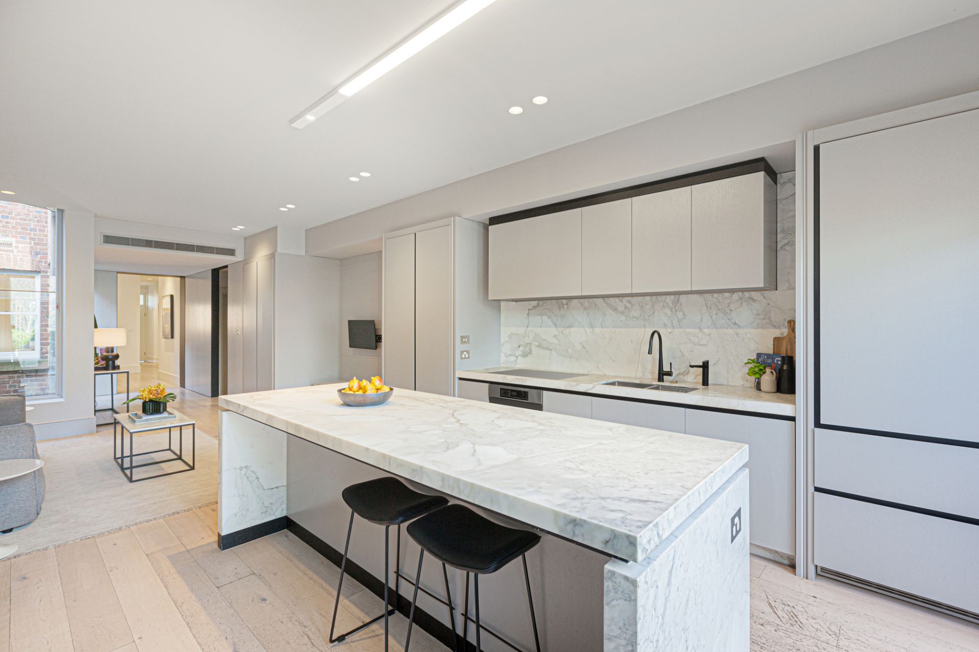 A monochrome palette, wide oak floorboards, stone and marble finishes, designer light fittings and abundant storage create a sense of understated luxury on both levels. The light-filled front room, with a fireplace, has a garden outlook and connects through double doors to the dining room or study where marble-topped shelving is ideal for displaying books or treasured objects.