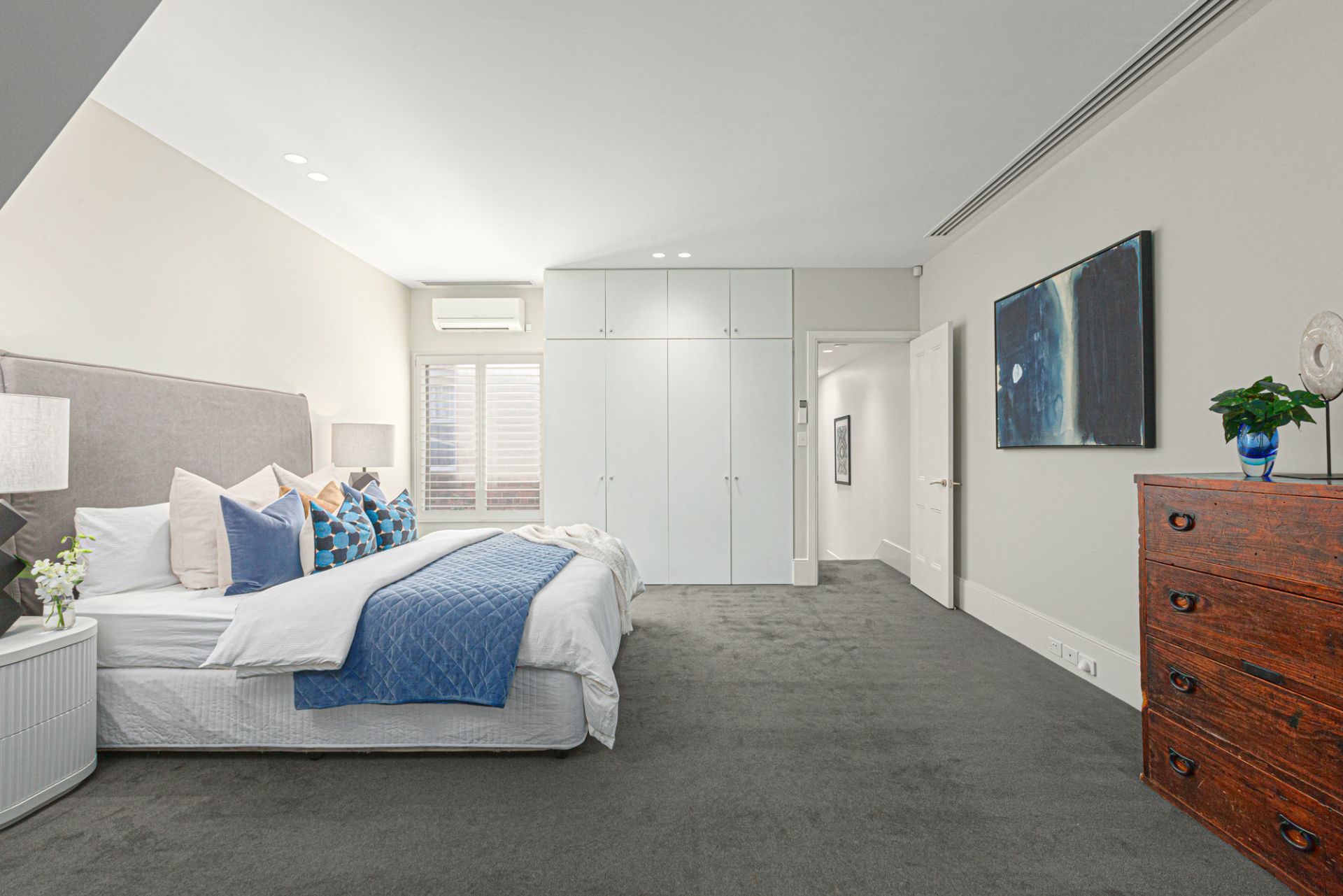 A gentle climb upstairs reveals the upper level with the three bedrooms and two bathrooms. In the exceptionally large main suite light pours in from a north-facing window, and large built-in wardrobes are complemented by a pristine ensuite. The second robed bedroom, with balcony and leafy views over Hotham Street, and the third bedroom share the central bathroom.