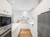 Overlooking the dining and living zone, the light-filled gourmet stone-finished kitchen boasts an array of stainless steel Neff appliances and plentiful storage.