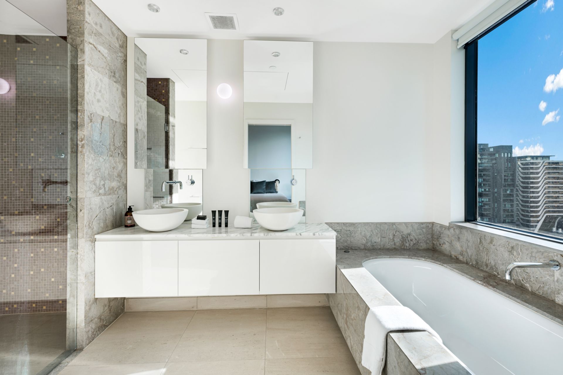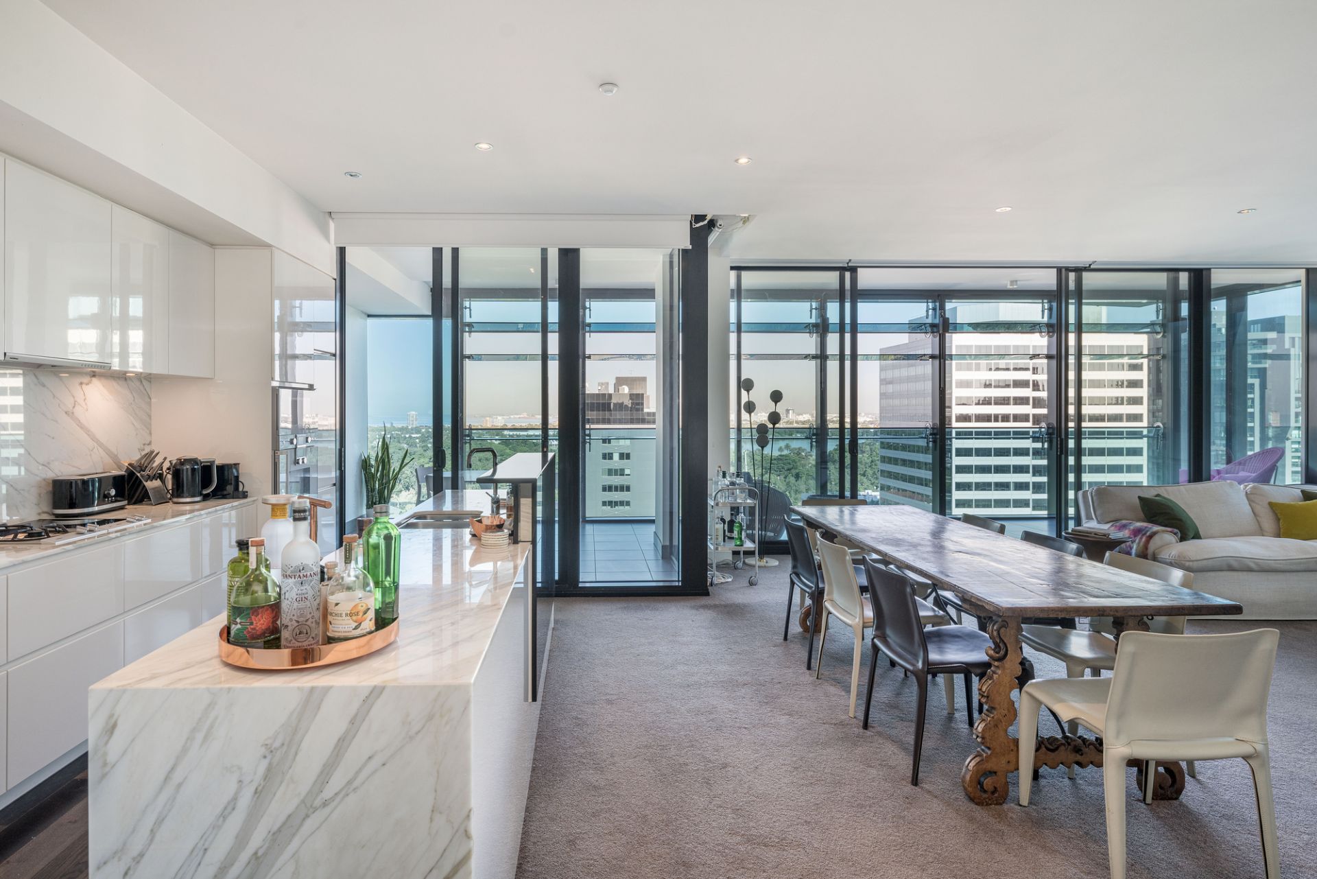 The floor to ceiling windows that wrap all the way around the generous living and dining zone will draw your attention opening onto full width winter garden with electric louvers creating indoor and outdoor living. The gourmet marble kitchen has a sculptural island bench, Gagganau appliances including gas cooking, oven and dishwasher. Both bedrooms have an opulent ensuite with marble finishes, main with bath tub and built-in robes. Other features include separate study, laundry, guest powder room, motorised transparent and block out blinds in all rooms, integrated heating and cooling, two secure car parks and two large storage cages.