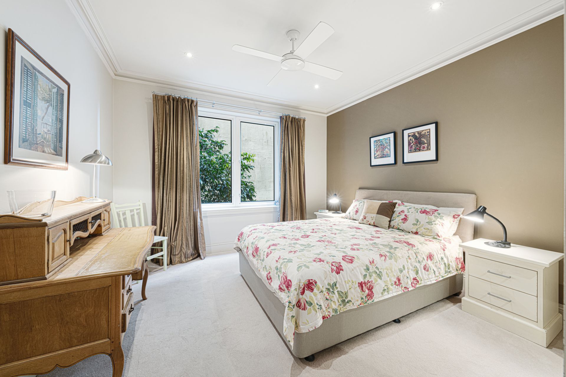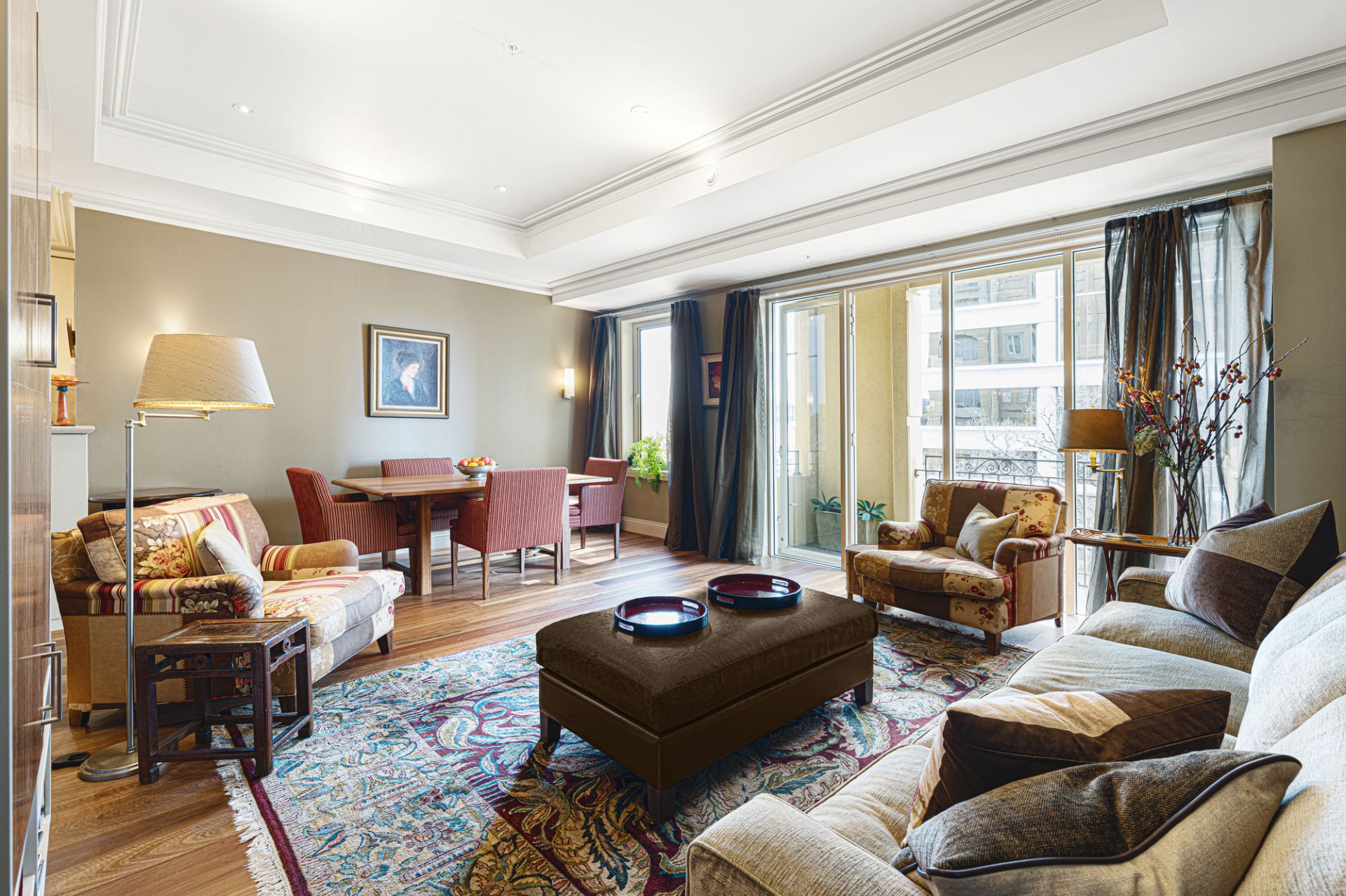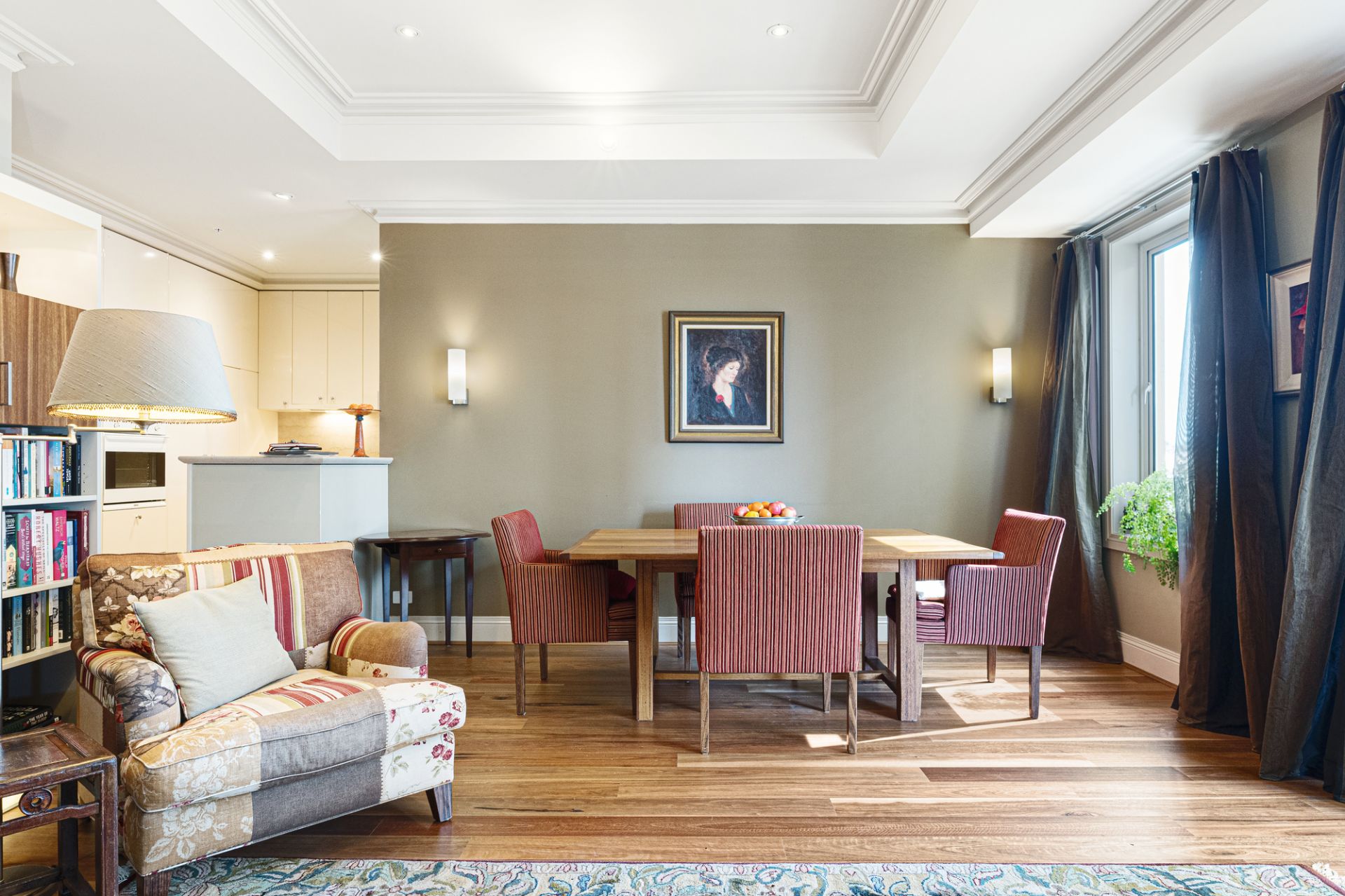 Superb spaces flow with luxurious ease from the entrance hall through to the open-plan living and dining beneath coffered ceilings which deliver elegant entertaining and the ability to spill outside to the terrace with views of the greenery. A custom-made wall unit includes a hidden television cabinet and built-in bar, while dramatic sheer curtains add to the sense of refined opulence that defines this apartment.