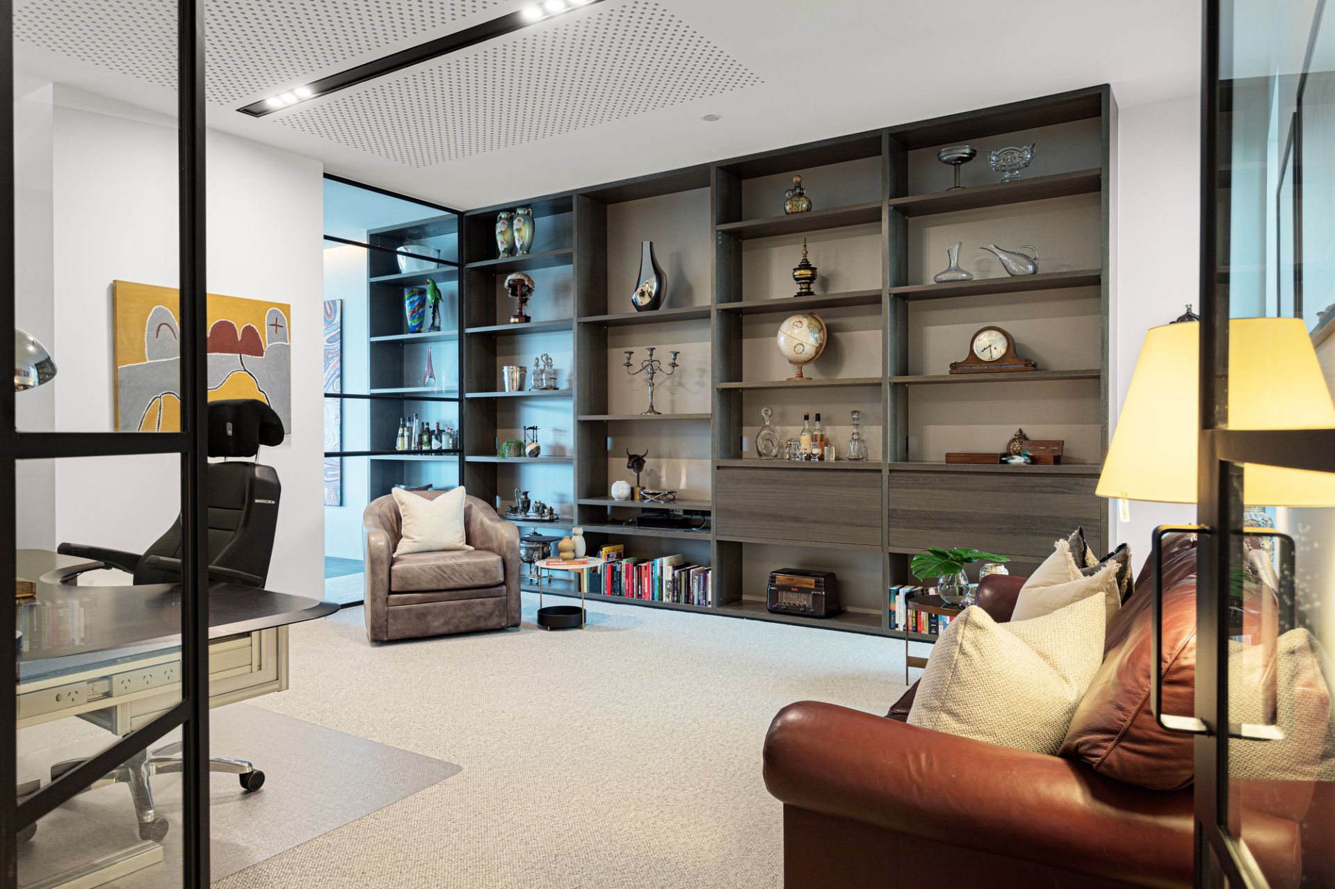 A second living area, ideal as a library or media room, provides additional space for relaxation with extensive built-in shelving.