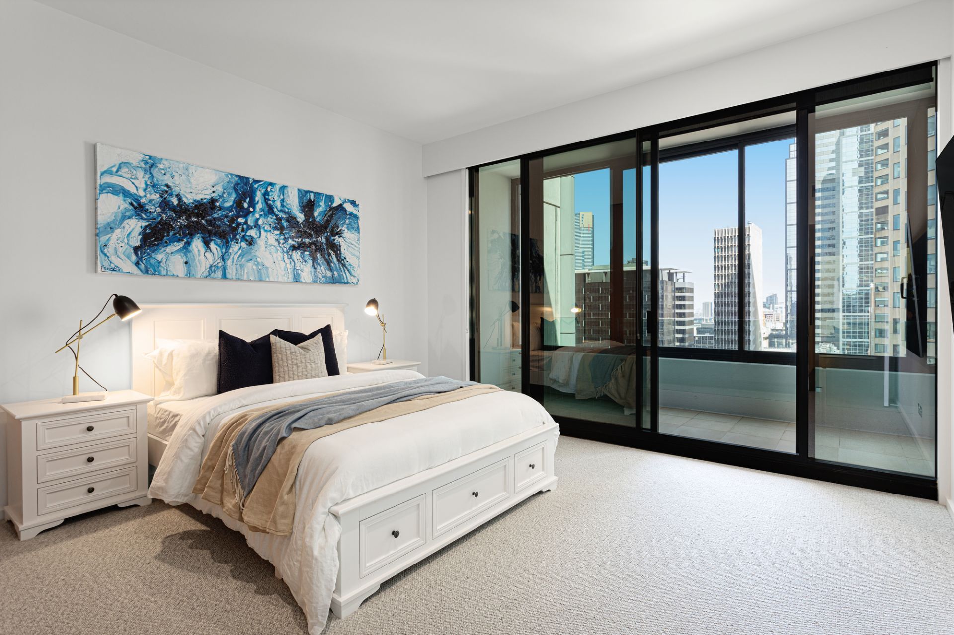 The tranquil master suite offers access to a private balcony with city views, walk-in robe, and a striking granite ensuite with an oversized shower. Two additional bedrooms, each with built-in robes, also enjoy balcony access and share a central bathroom with a double vanity and bath.