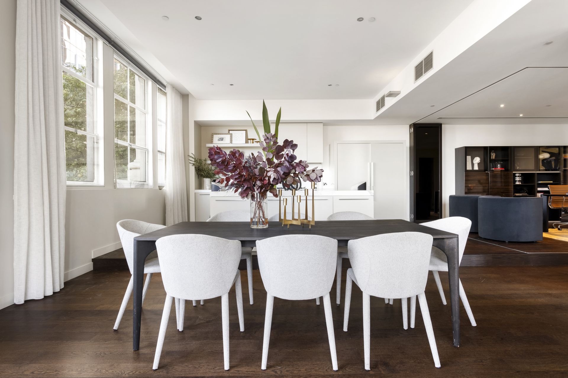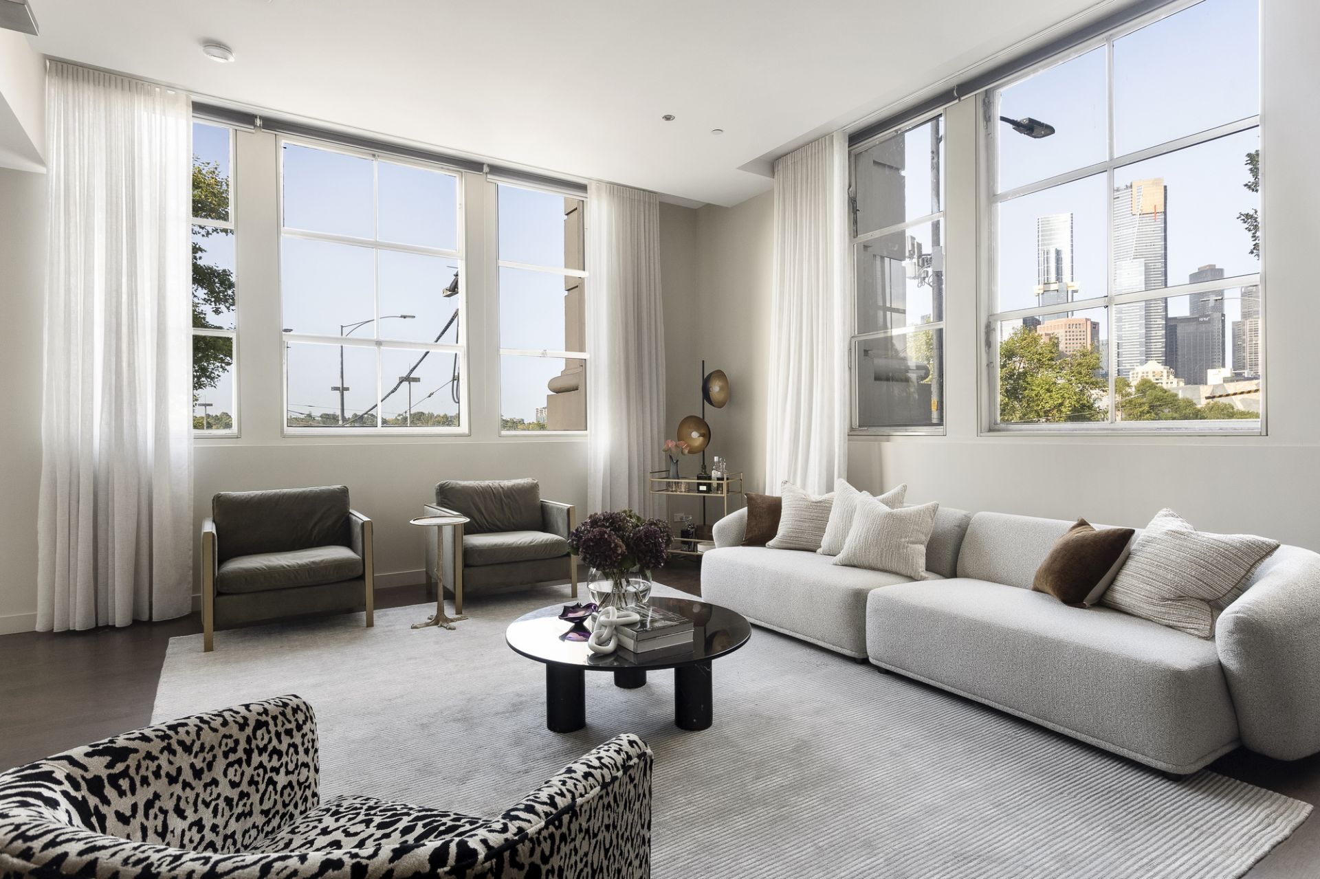 The enormous open-plan living and entertaining space is flooded with natural light thanks to its premium corner position and beautiful dual aspect windows which offer magical views towards the Arts Centre and the Royal Botanic Gardens.
