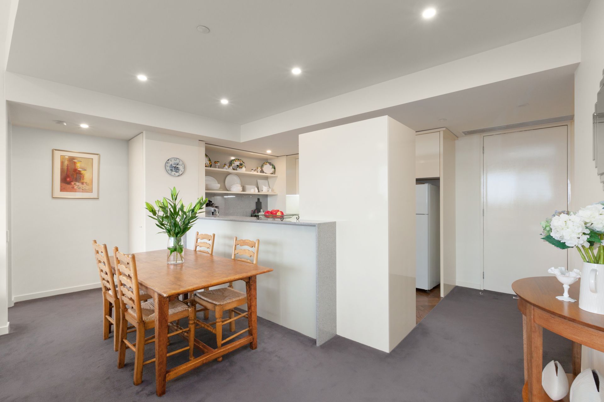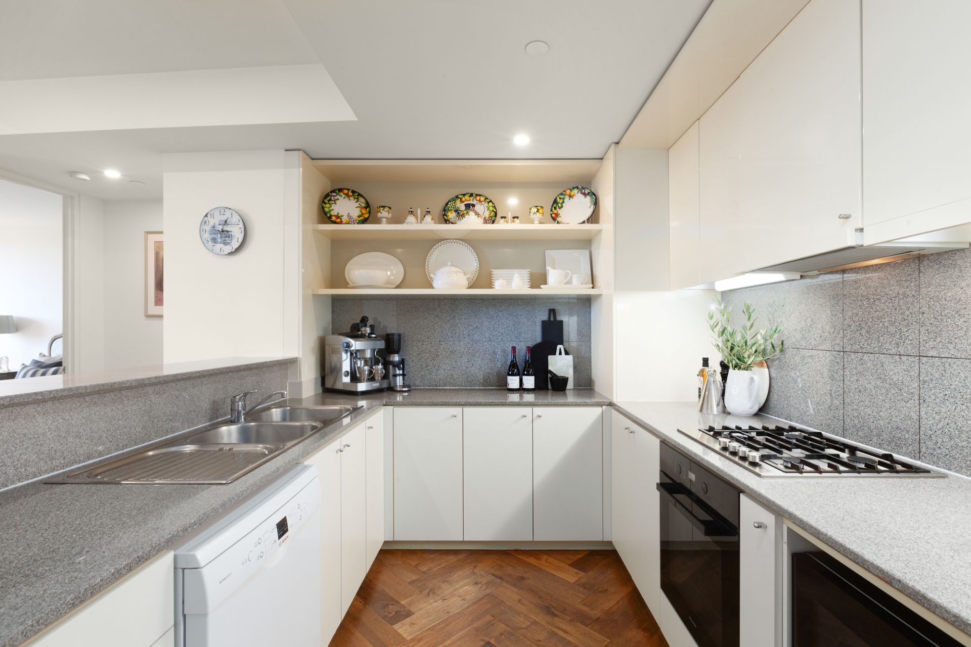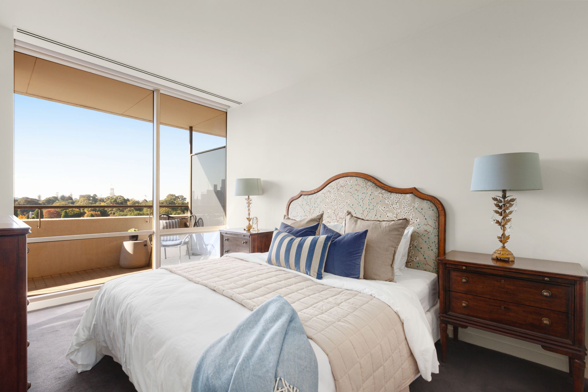Wide dimensions with expansive glazing form the focal point of a spacious open-plan living and dining room, that adjoining a granite-topped kitchen equipped with Miele and AEG appliances, is flanked by a curved, full-width balcony for sun-filled alfresco entertaining while savouring the magnificent north/east-facing outlook. Ducted heating and cooling, LED lighting and high ceilings elevate comfort and convenience throughout as the single-level layout extends to impressive accommodation.