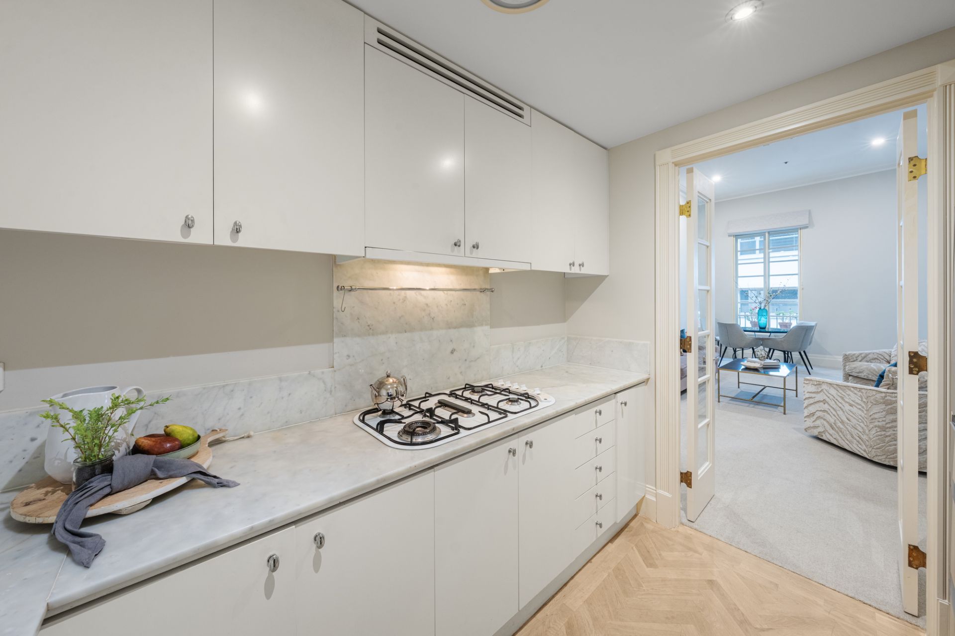 The building’s opulent security foyer, with its grand sweeping staircase awash with natural light, is complemented by both lift and stair access. Inside, the formal entry flows to an expansive living and dining domain with high ceilings, feature gas log fire and classic mantle.