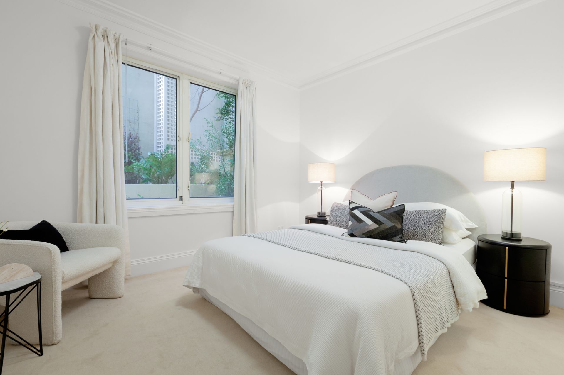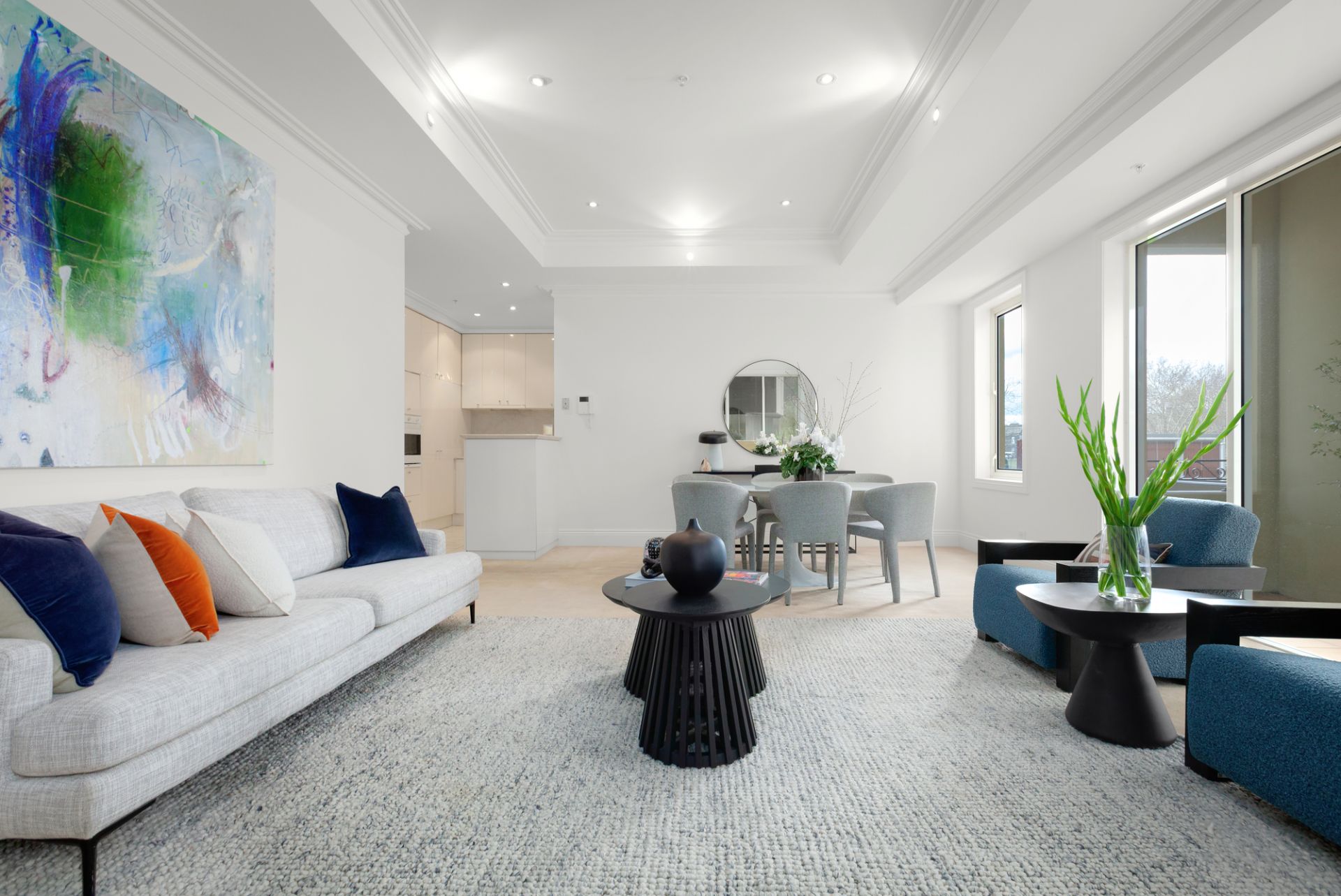Securely set on Level One, the apartment’s flowing floorplan leads from the entrance foyer, through to the spacious living and dining room with attractive coffered ceilings, promising refined entertaining and the opportunity to spill out to a generous, sheltered, and beautiful garden courtyard.
