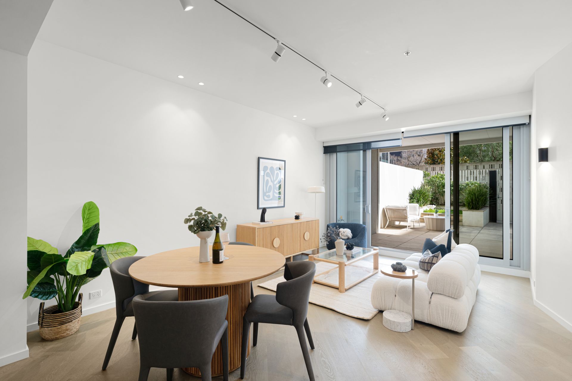 A gourmet kitchen takes centre stage, featuring stone benchtops and premium appliances including an integrated Liebherr fridge/freezer and a Gaggenau oven and cooktop. The open-plan living and dining area is bathed in natural light and opens on to the courtyard for relaxed, outdoor living and entertaining.