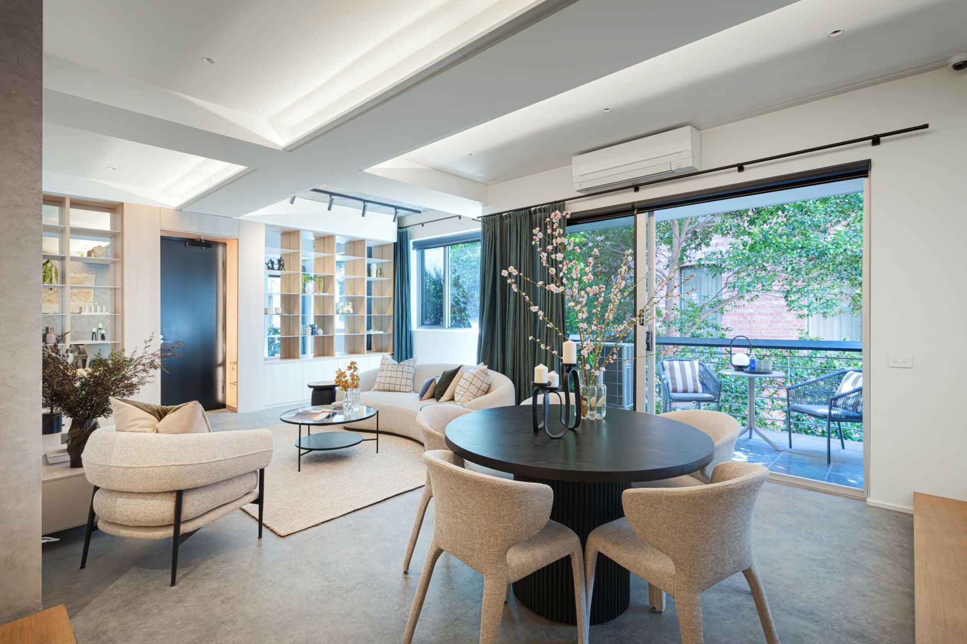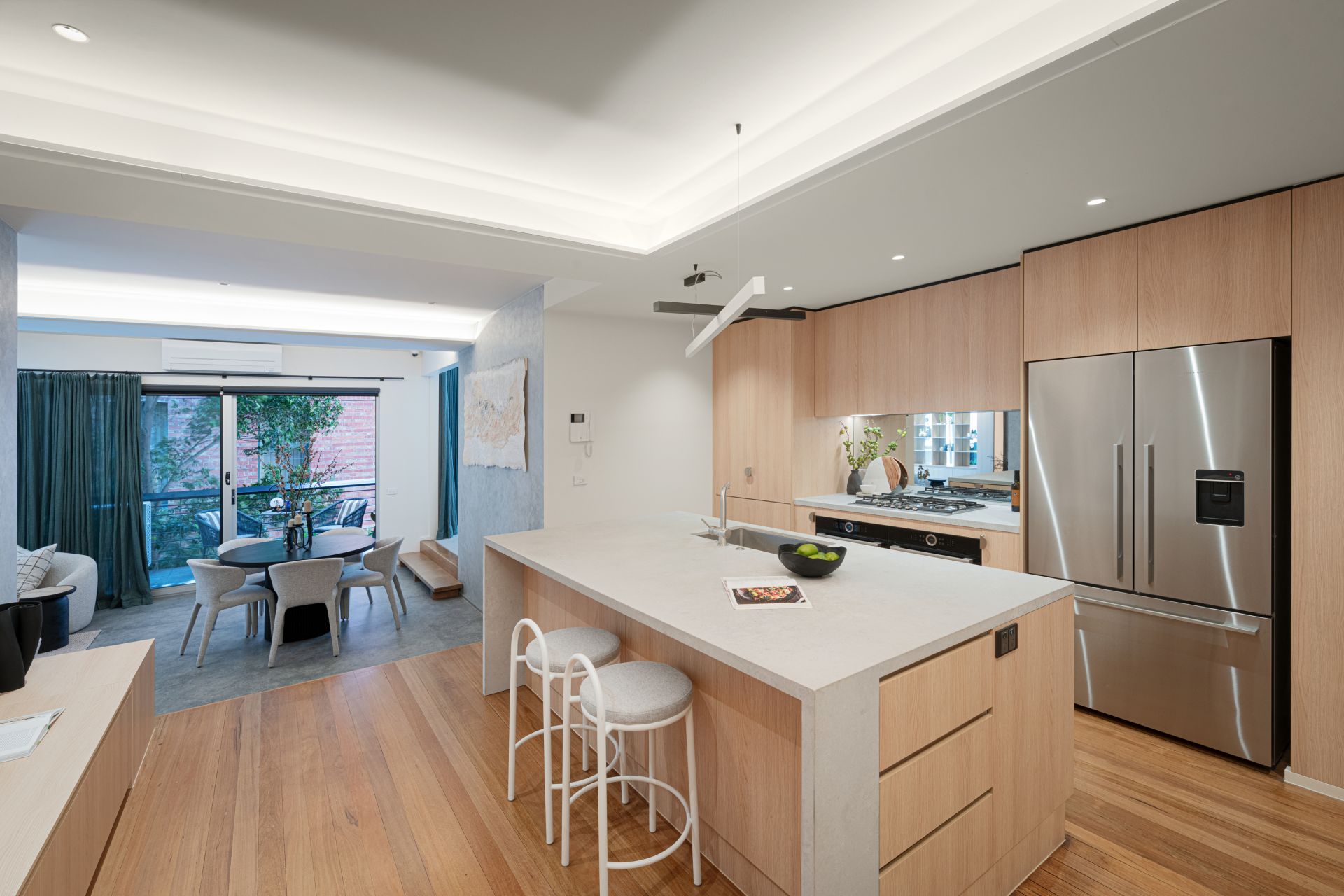 Positioned on the third floor in a boutique block of just nine, the residence showcases brand-new finishes throughout, including wide timber floors, a sleek modern kitchen with an island bench, high-end European appliances, and a spacious dining zone that sets the stage for effortless entertaining. The light-filled living room extends through full-height glass doors to a private balcony, seamlessly blending indoor and outdoor living.