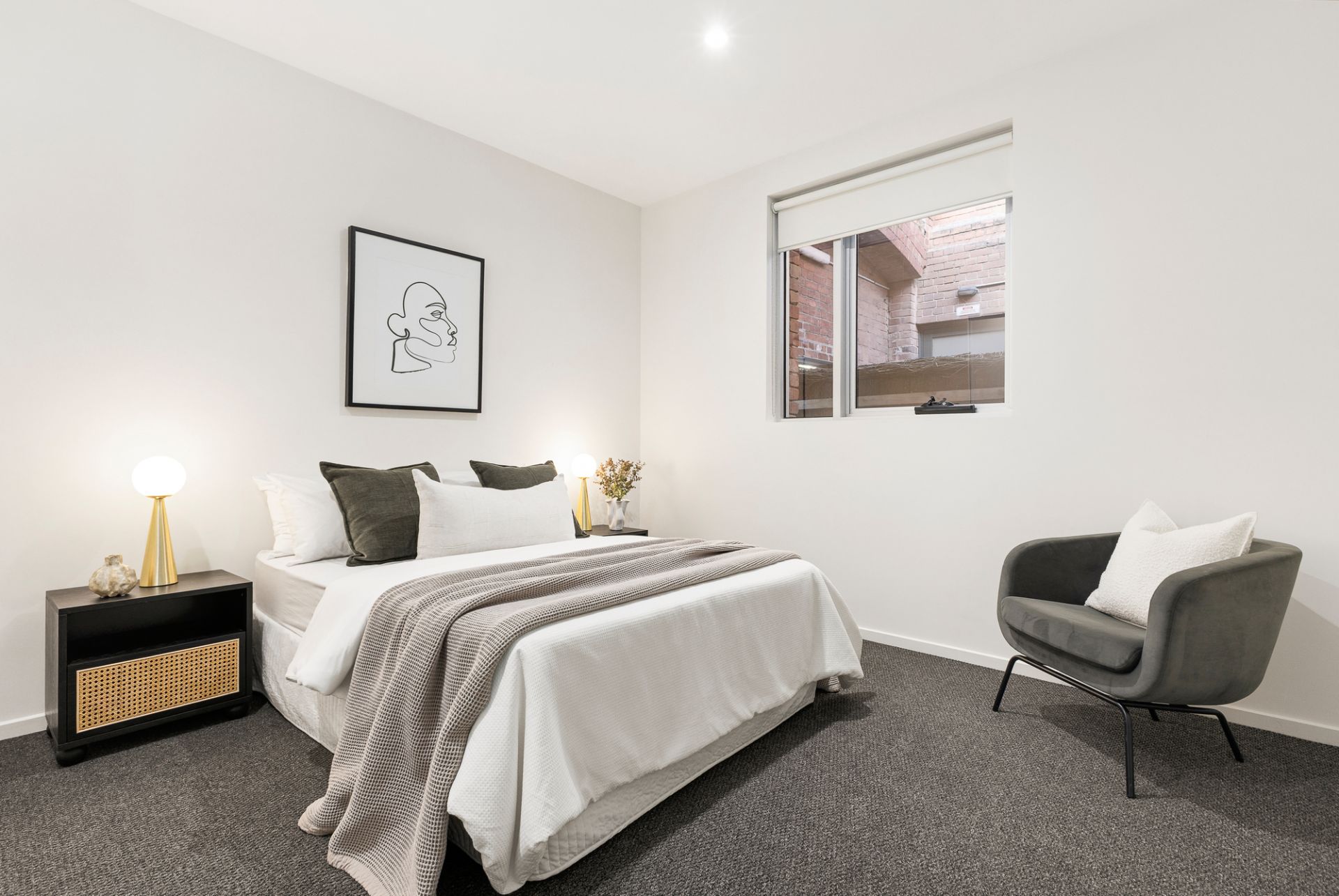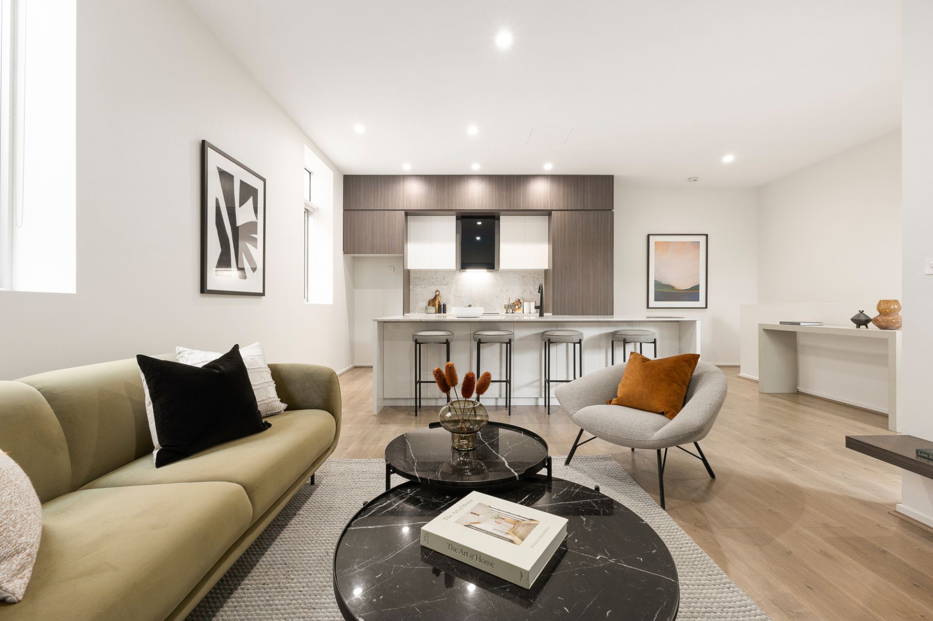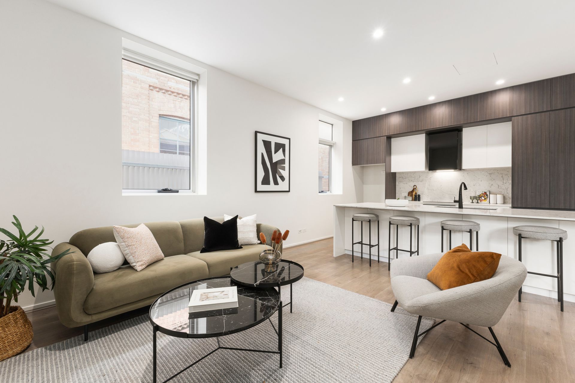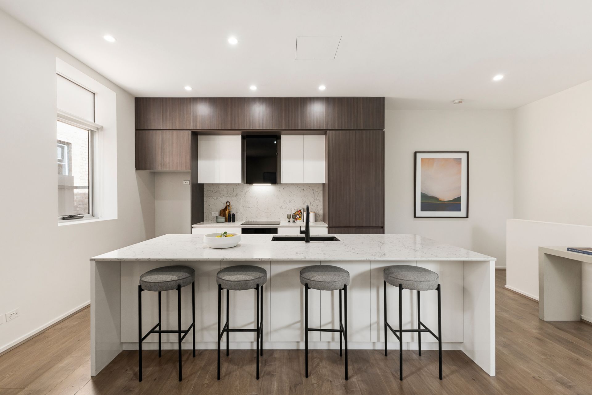 Upstairs, open plan living and dining flow to a sun-soaked balcony, complemented by a sleek kitchen with island bench and newly installed appliances. Downstairs, two generous bedrooms with fitted robes are served by a sparkling bathroom and separate powder room.