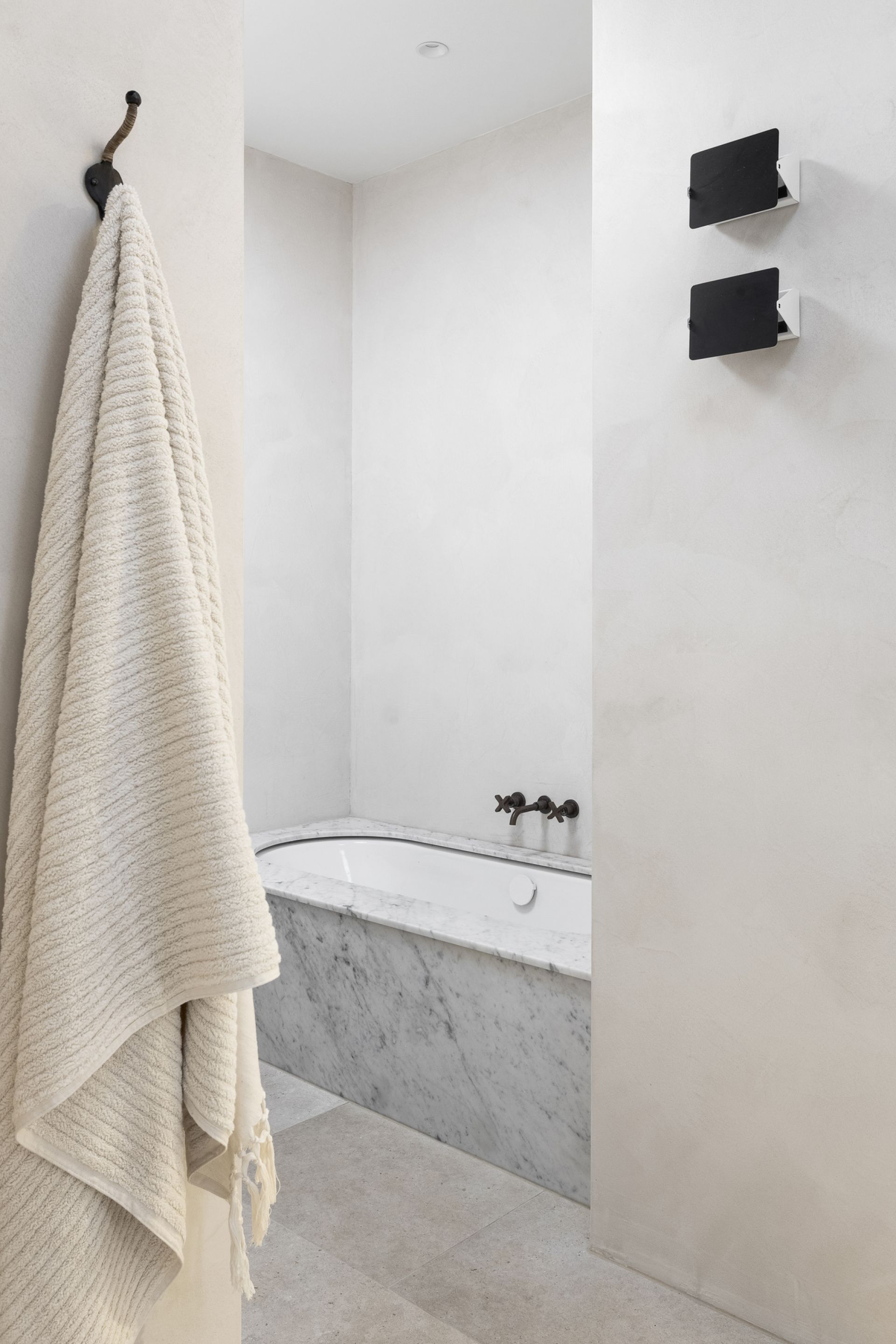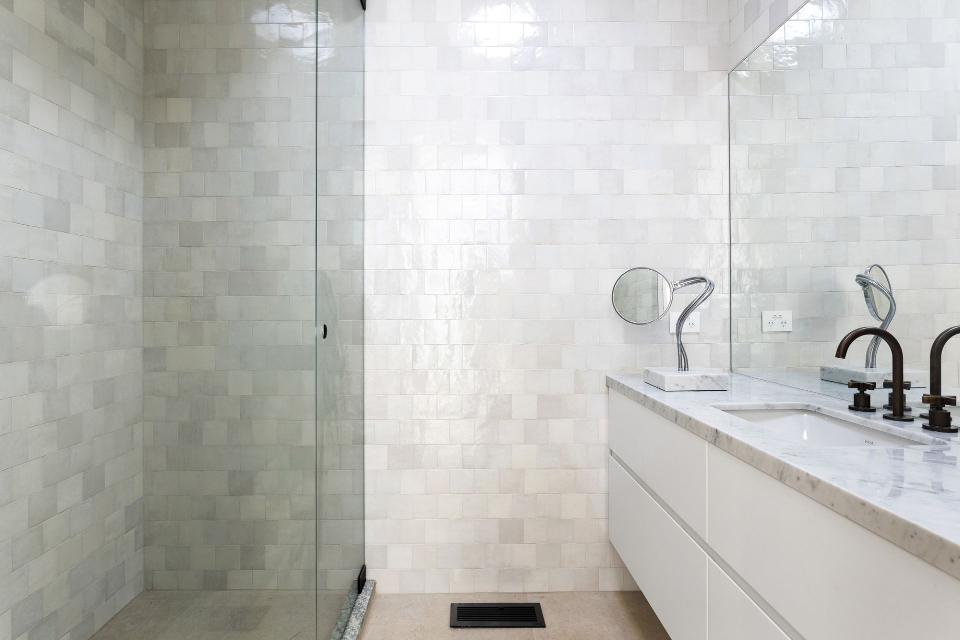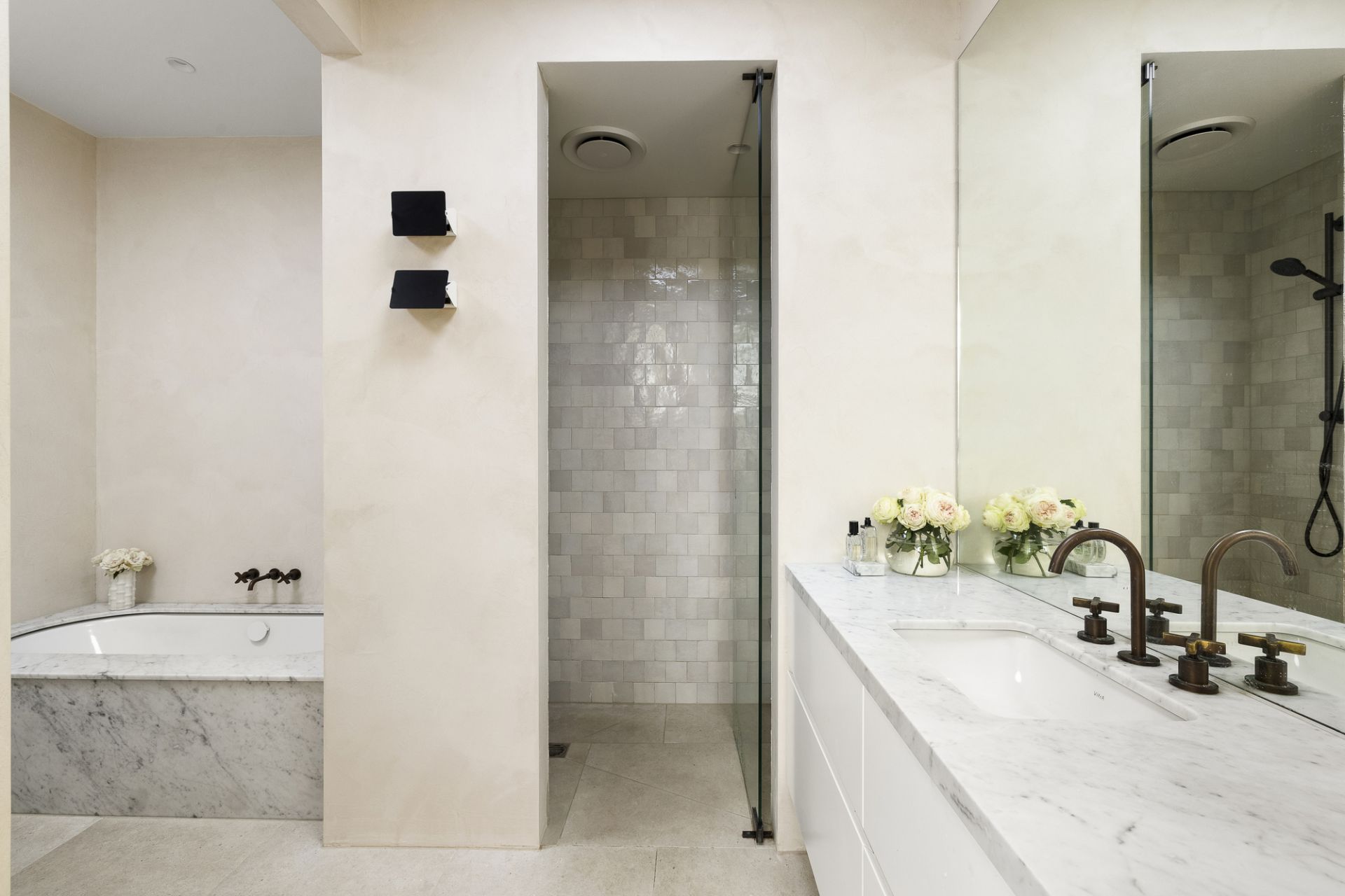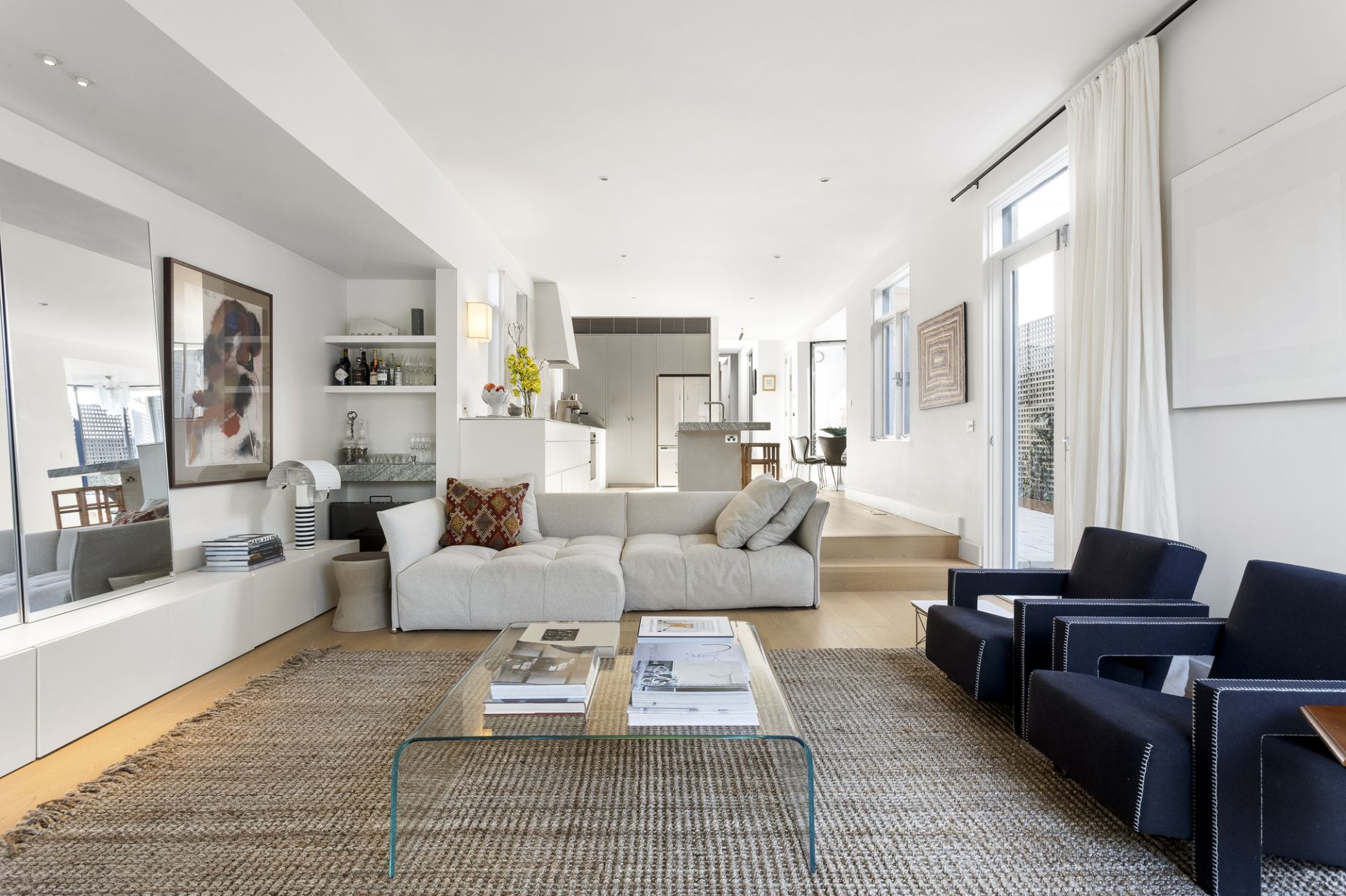 With glazed ceramic tiles, large-format porcelain floors, and Carrara marble adorning a chic central bathroom and main ensuite, extensive robe storage lines three considerable bedrooms, while a generous fourth doubles as an ideal base for today's home professional. With an array of luxuries spread across a single, exceptional level, further highlights include ducted heating, refrigerated cooling, premium French oak floors, Ivory crushed linen curtains, Brodware and Rogerseller tapware, an Italian Murano pendant light to dining, Charlotte Perriand wall light to main bathroom, custom-created wall sconce to kitchen, large laundry, mud room, and three secure driveway spaces.