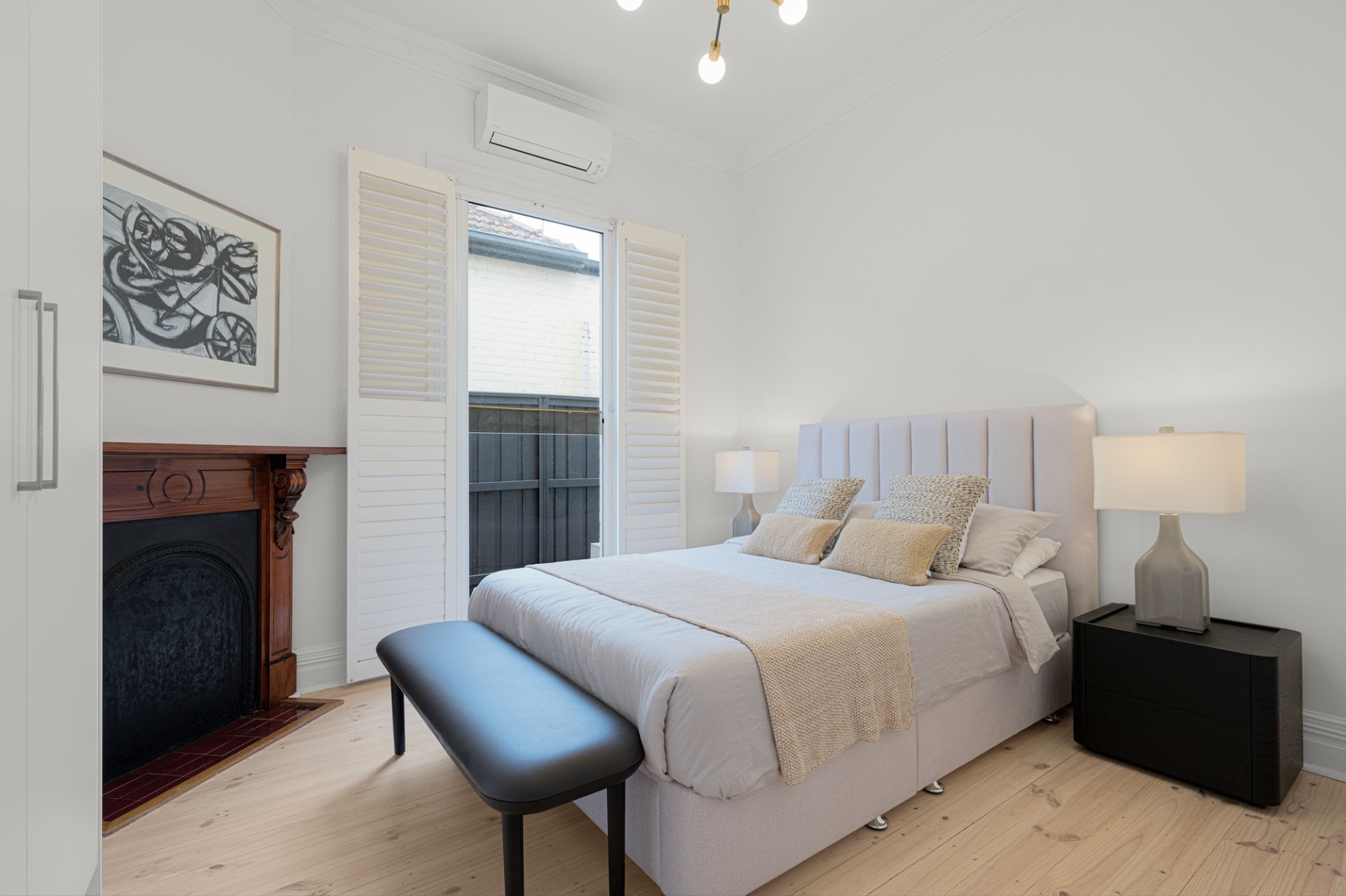 Three spacious bedrooms, two with extensive built-in robes, all feature gorgeous original fireplaces and ceiling roses and are serviced by two elegant marble bathrooms, including one with a freestanding bath.