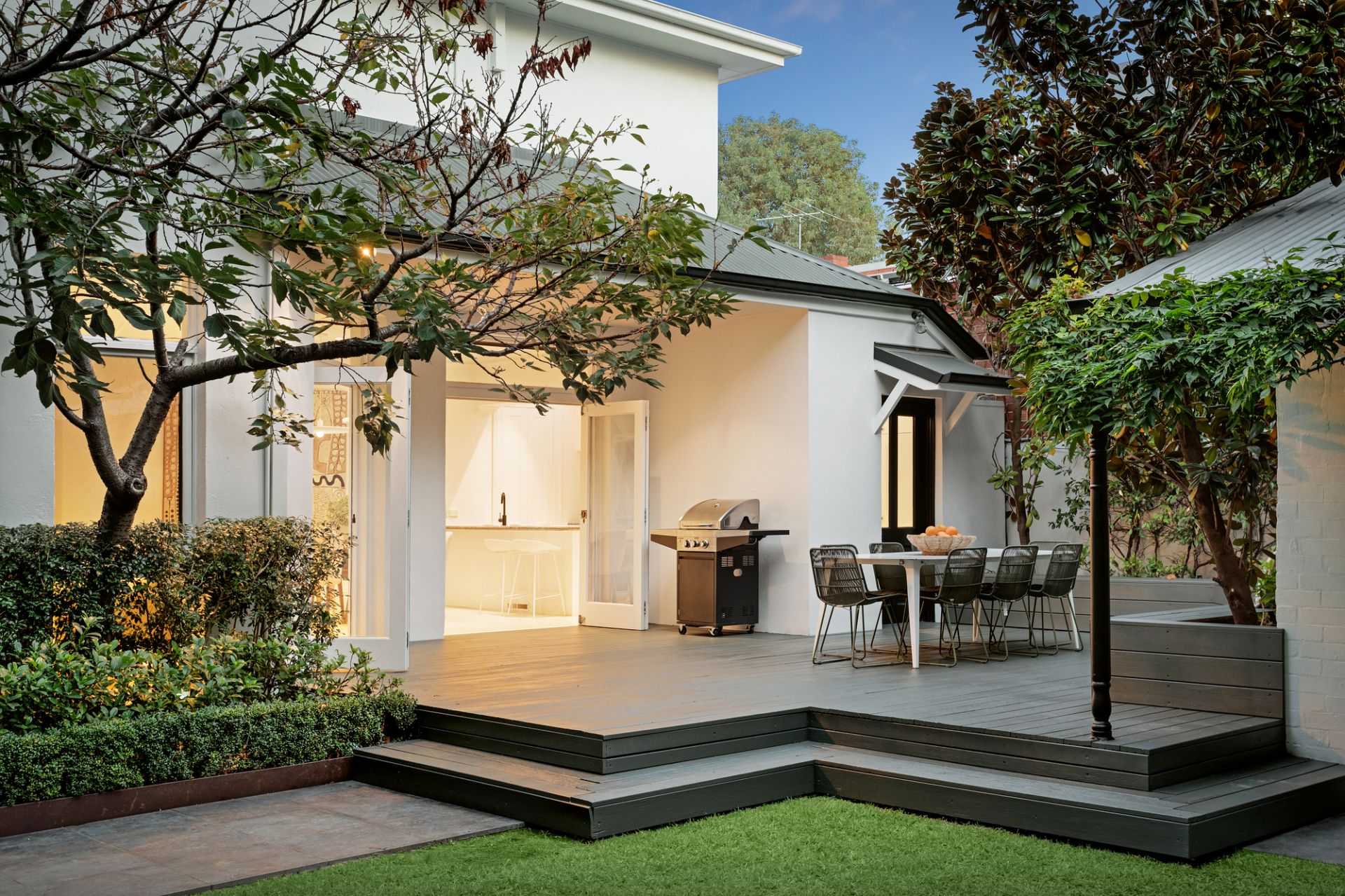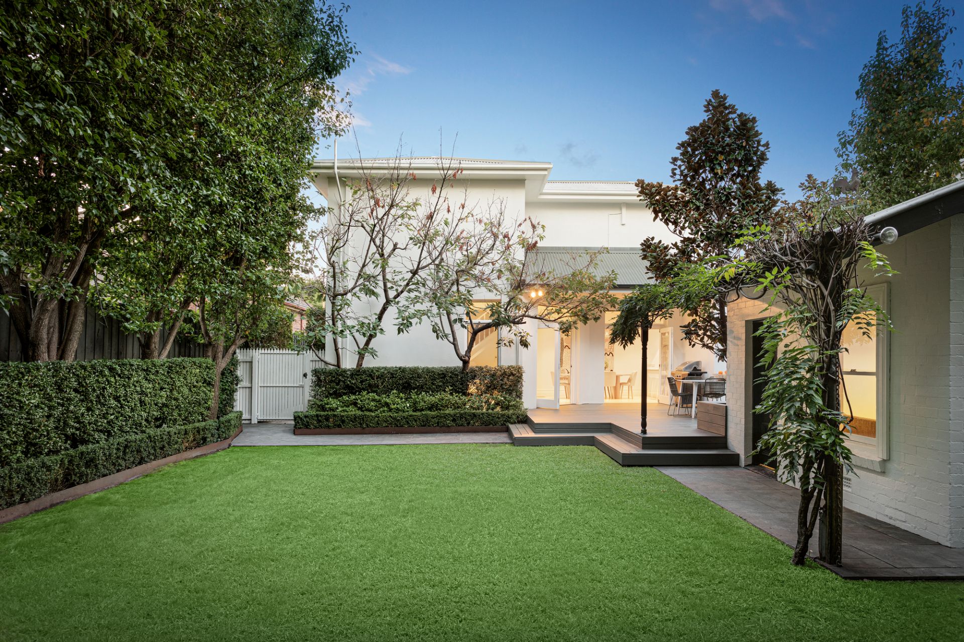 Bi-fold doors open the living spaces to the deep private landscaped northwest garden with a large entertaining deck and freestanding studio or home office all surrounded by established Manchurian pear trees.