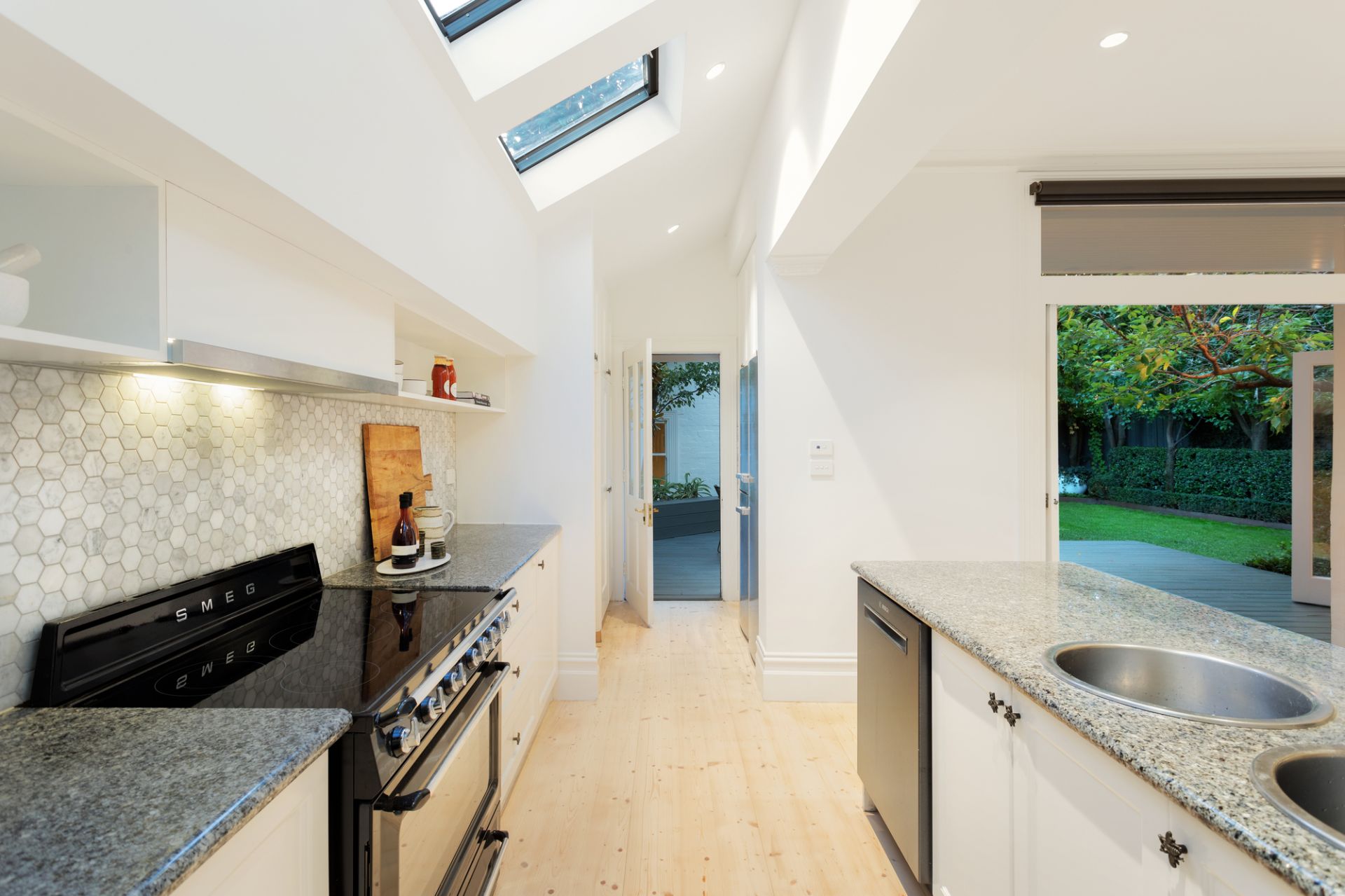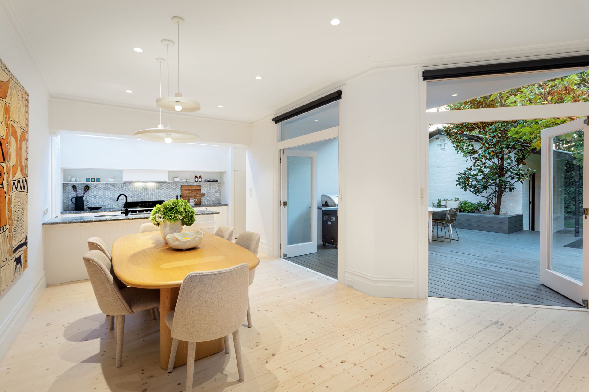 Natural Baltic pine floors accentuate the sense of light in the wide arched central hall, gracious sitting room with fireplace, superb granite kitchen, spacious open plan living and dining room.