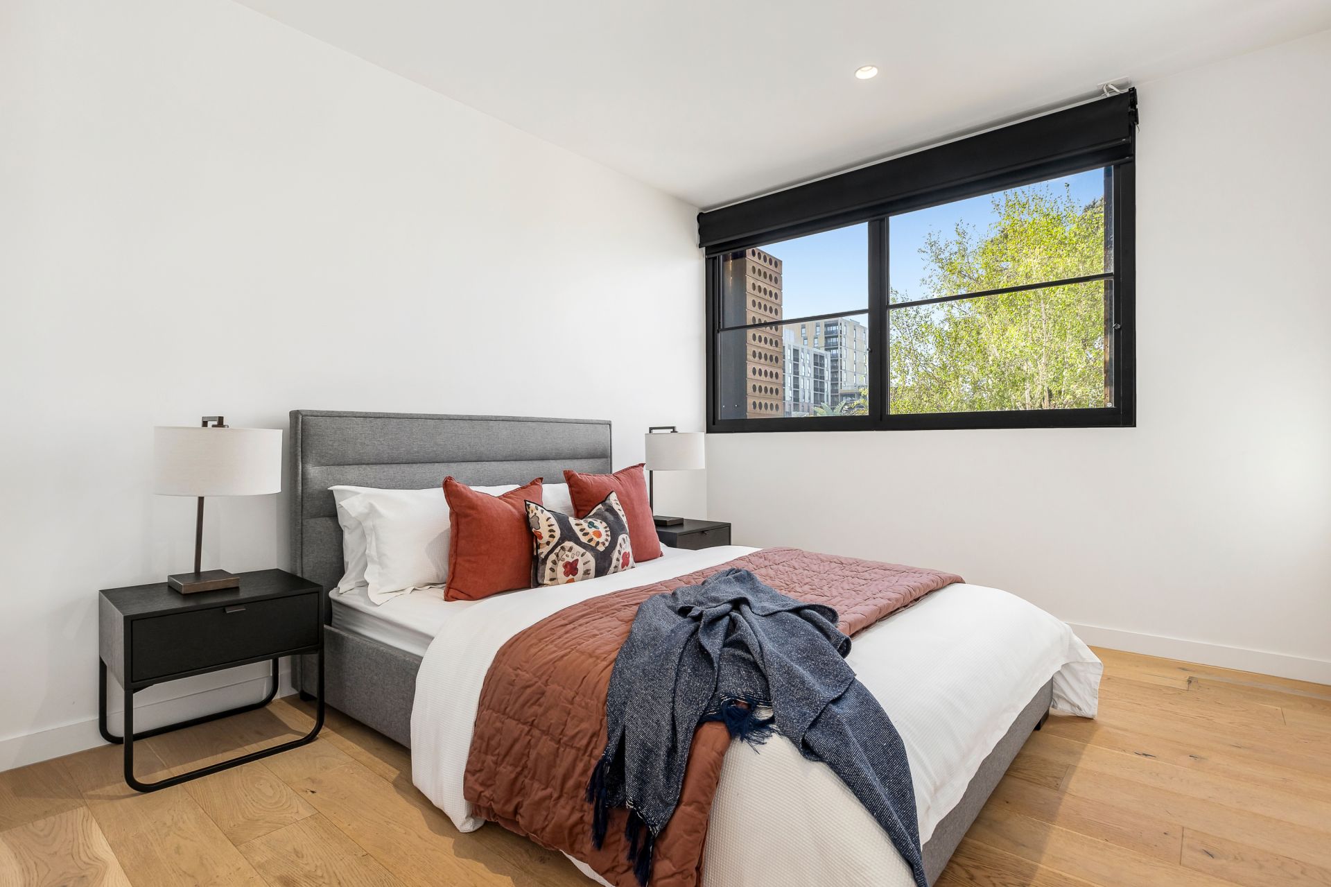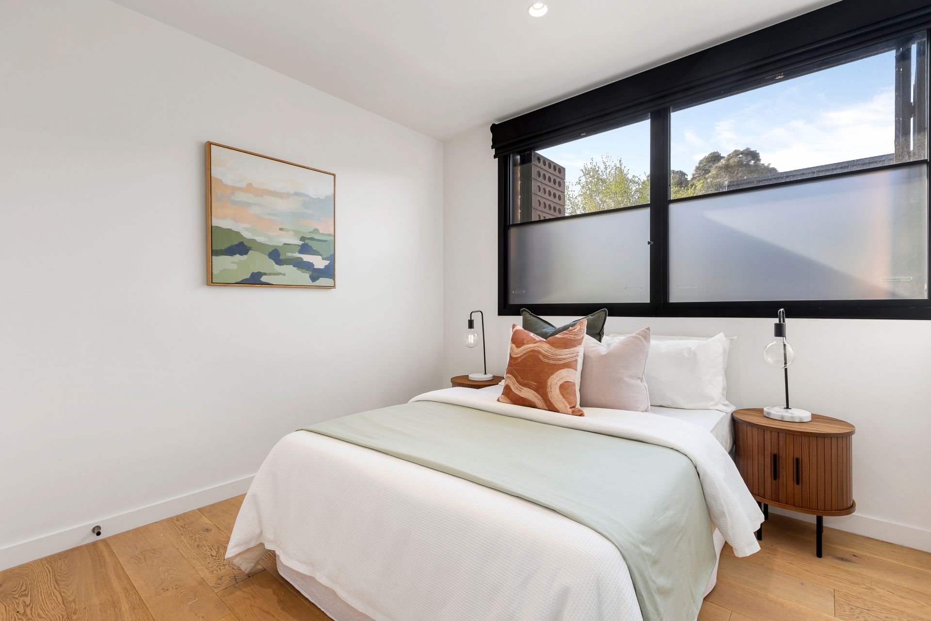 Other features include central heating and cooling and double-glazed windows throughout, polished timber boards, video intercom entry, powder room with laundry, motorised blinds, two secure basement car parks, and a large storage cage.