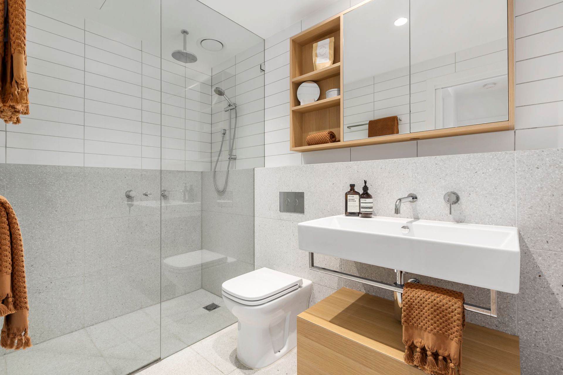 Upstairs, the north-facing master bedroom boasts a walk-in robe, accompanied by a luxurious ensuite bathroom featuring finishes and fittings by Roger Seller and floor heating, while the equally spacious 2nd and 3rd bedrooms share the central luxurious bathroom with a bathtub.