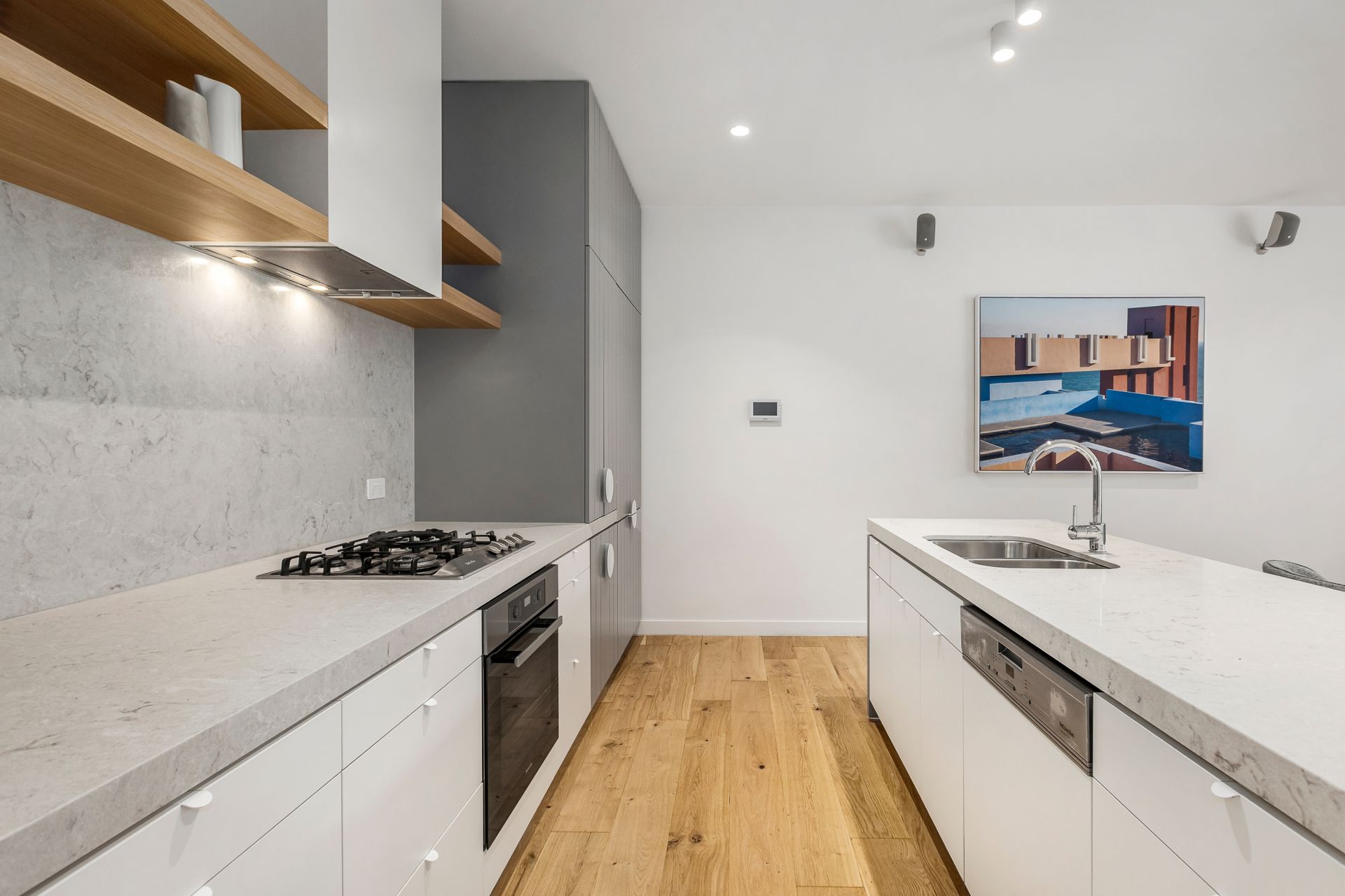 Step inside to discover immaculate interiors with a high-quality material palette, including an attractive kitchen with Caesar stone island bench, Miele appliances, an integrated fridge, and beautiful timber flooring, whilst the spacious lounge and dining room with high ceilings and floor-to-ceiling windows seamlessly flow onto a manicured courtyard garden.