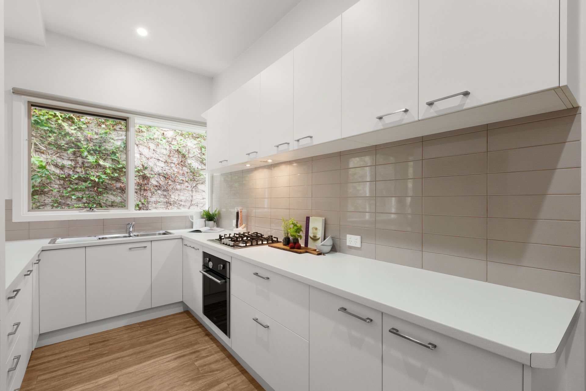 A large kitchen is thoughtfully designed with three-sided bench space and soft-close cabinetry along with a stainless-steel gas cooktop, under-bench oven and an integrated dishwasher, before opening to a spacious rear living and dining area. French doors then offer a seamless connection to a tranquil courtyard garden fringed in greenery that integrates a covered storage area and direct rear access to laneway right of way.