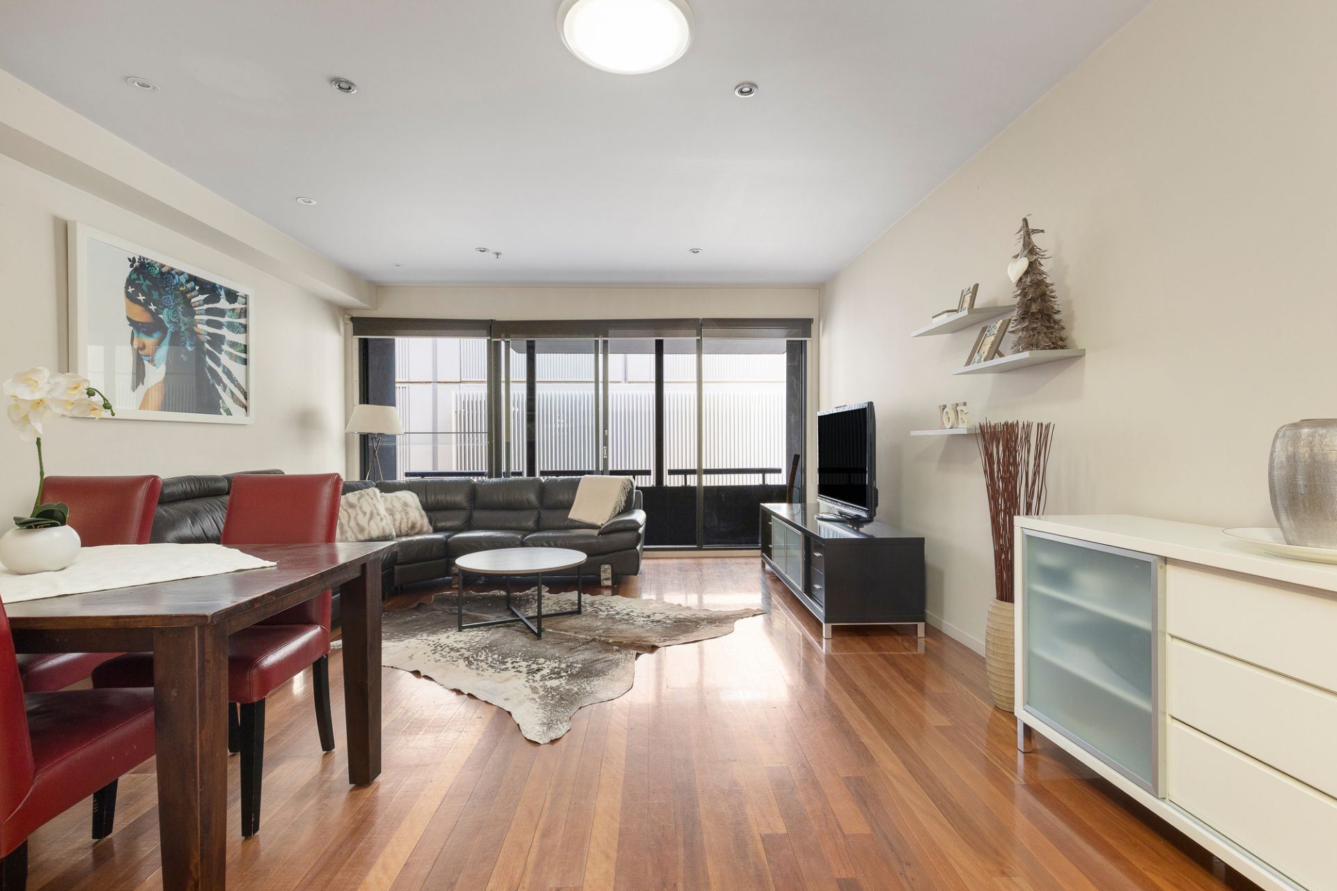 Generous proportions define the open-plan living and dining zone, where full-height glazing and timber floors create a natural sense of scale. Extending to a balcony, the home immediately invites entertaining, while a modern kitchen with ample storage sets the stage for everyday living.