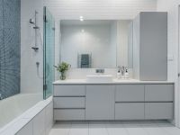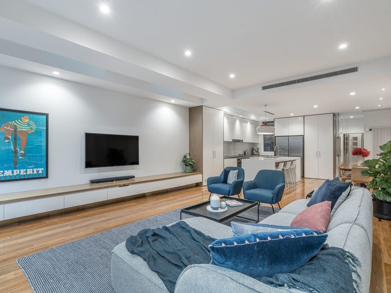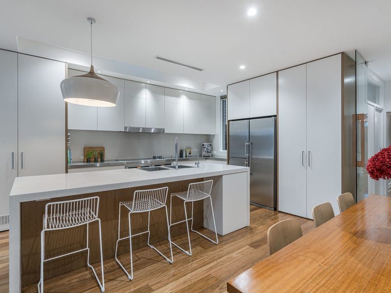 Both practical and stylish, the gourmet kitchen features a long stone island bench complemented by stainless steel benchtops with German De Dietrich ovens, induction cooktop and Miele dishwasher. The skylit kitchen overlooks the meals area and the family living room with built-in storage on one wall and views to the back garden. Glass sliders open the living room to the sun-drenched garden which has direct access to the double garage with rear access.