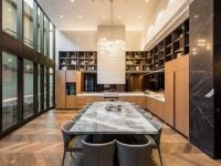 Both attractive and practical, the entertainer's kitchen with stone benchtops, smoky mirrored glass splash back and Miele ovens, induction cooktop and dishwasher, overlooks the dining and living area.