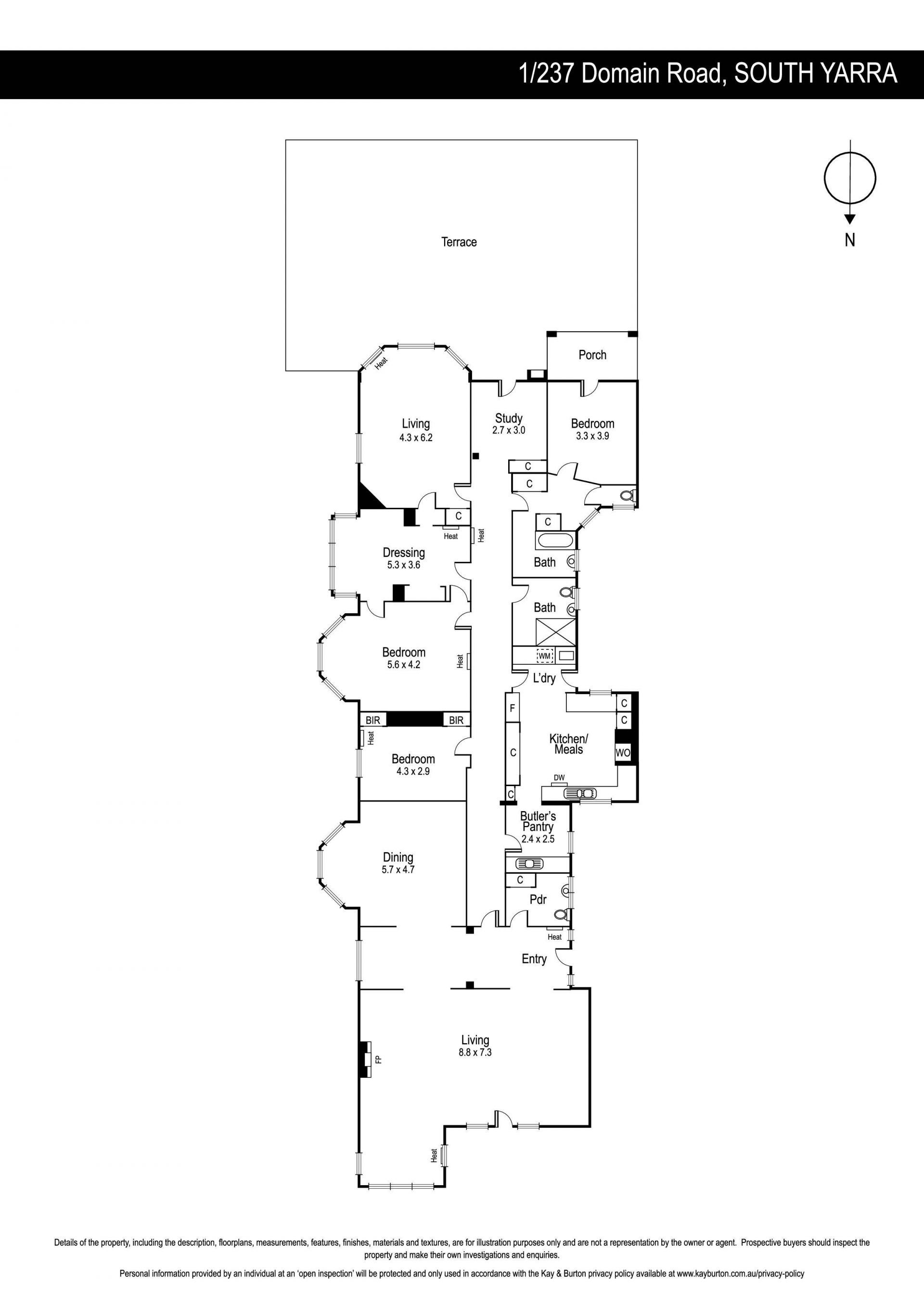 A flexible floorplan provides three to four bedrooms, an expansive living room, formal dining, contemporary bathrooms, study, second living room overlooking the terrace and a powder room. Sophisticated interiors with timber, stone and marble finishes are designed for gracious entertaining and everyday living. The living room, with a gas fireplace, has a study nook with views to Domain Road, while the kitchen, with granite benchtops and Smeg appliances, has an adjoining butlers pantry.