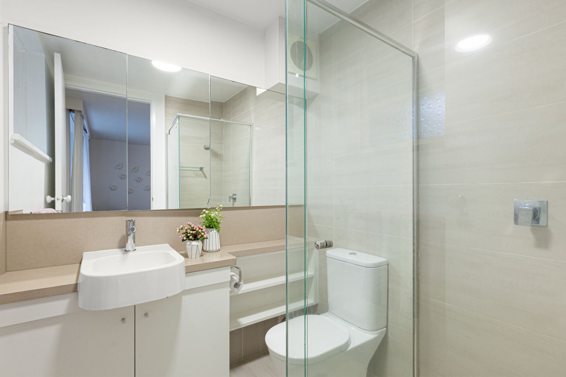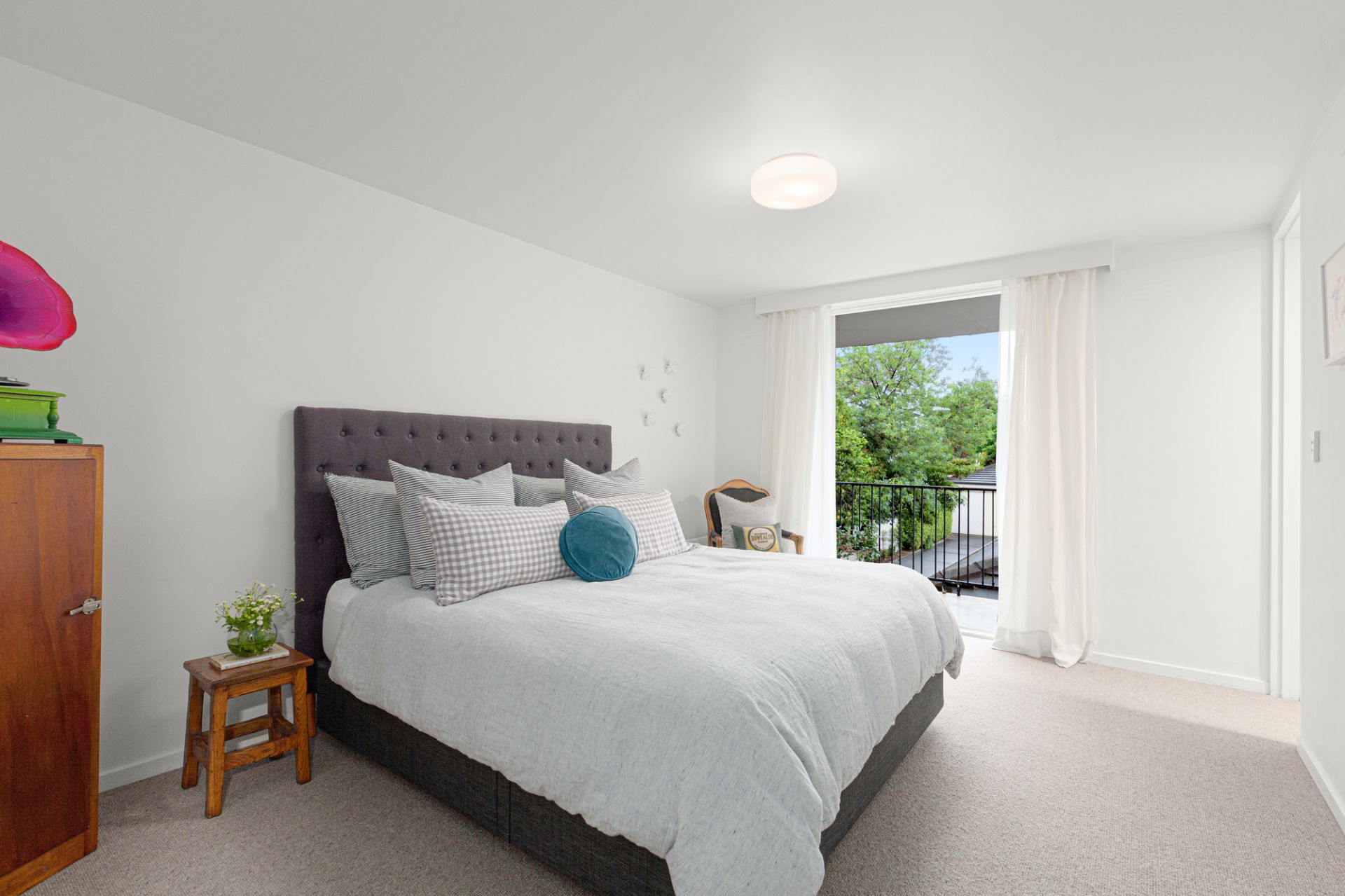Past the powder room and central bathroom, the main bedroom has generous storage, an ensuite and French doors to a private balcony. The second robed bedroom, with built-in robes, accesses the central bathroom.