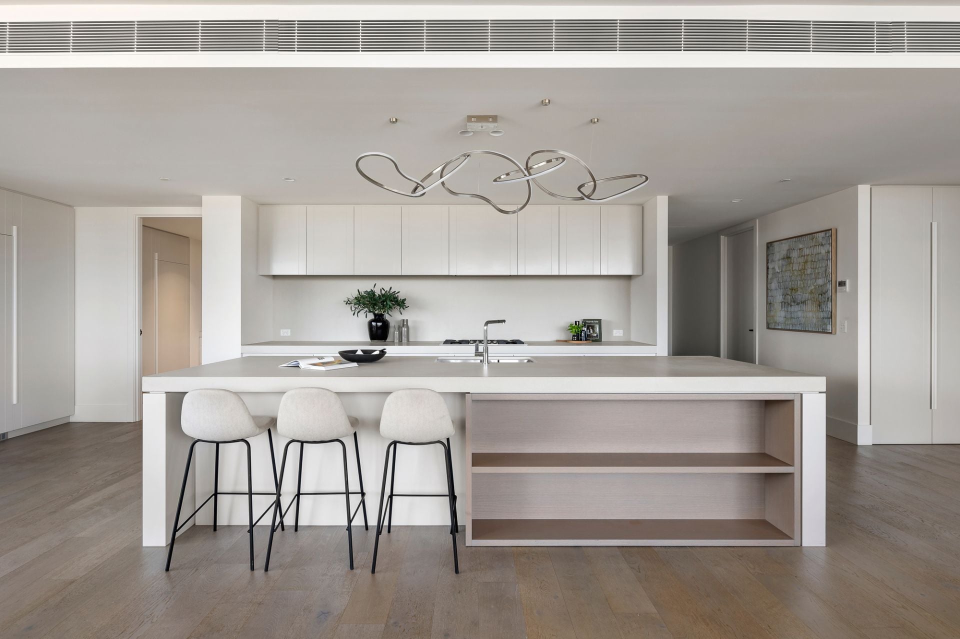 Additional conveniences include a powder room, a separate laundry, a third terrace, and zoned heating and cooling for year-round comfort. The apartment also comes with three secure undercover car spaces and three generous storage cages.