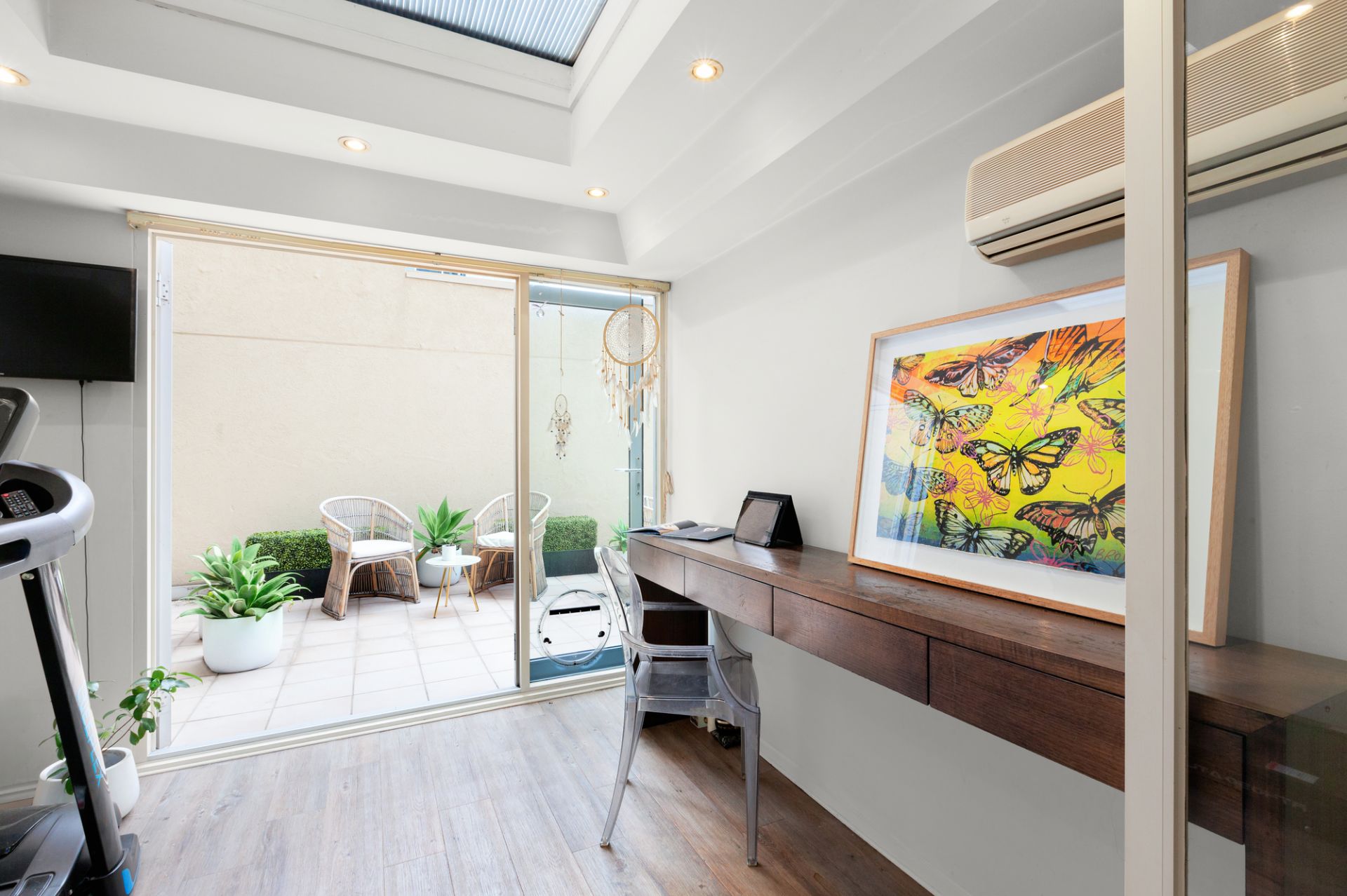 You will be pleasantly surprised by the entry hallway leading to a spacious living and dining area with bespoke cabinetry, views of the urban lifestyle and opening onto an undercover terrace area with fantastic vibrant surroundings. The fully appointed kitchen has ample cupboard space and servery into the lounge area. Both bedrooms have built in robes, main bedroom with adjoining large study with skylight and large entertainers’ terrace to entertain. The central bathroom services both bedrooms, and a separate large laundry which could be converted into another bathroom down the track.