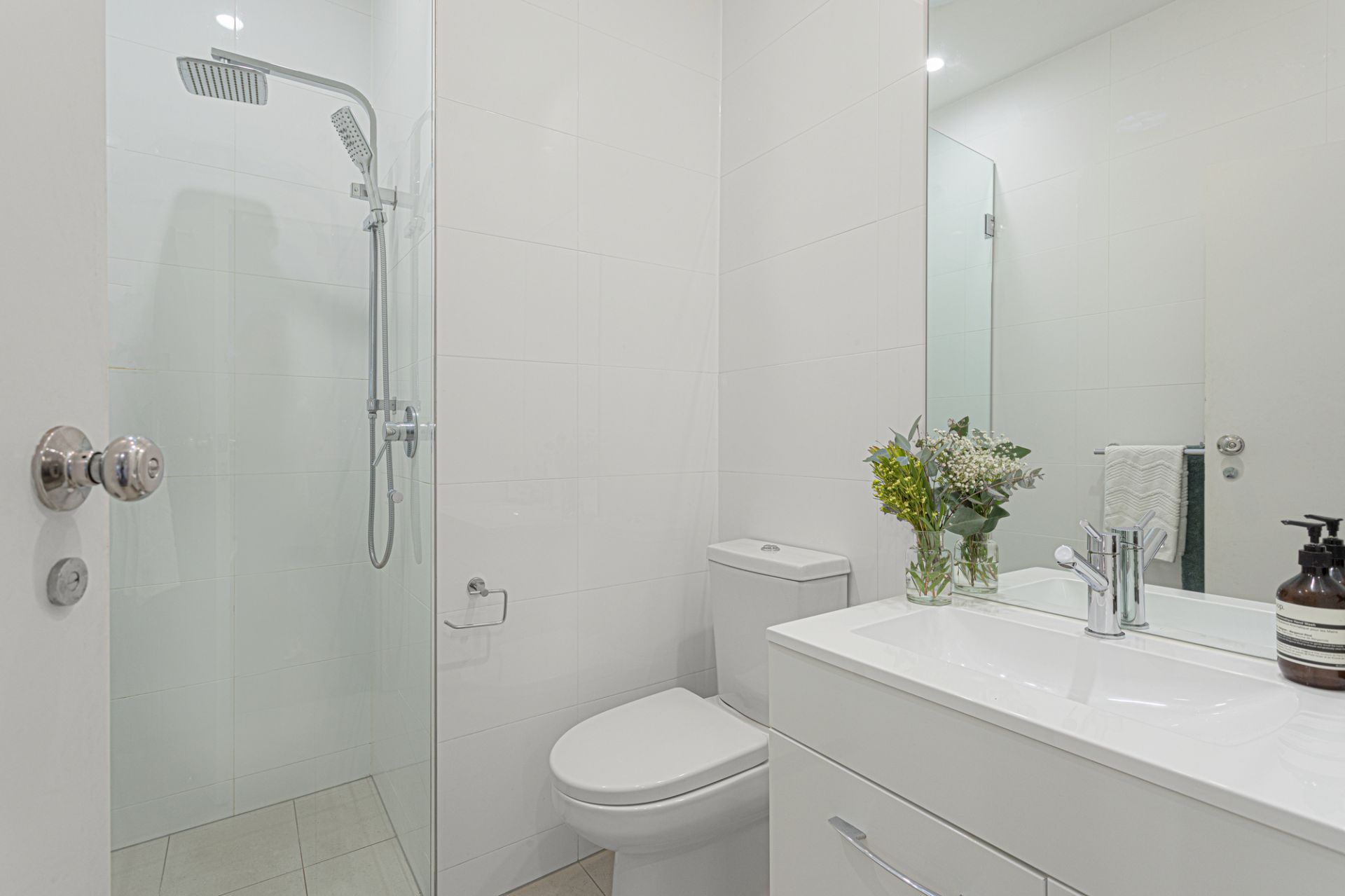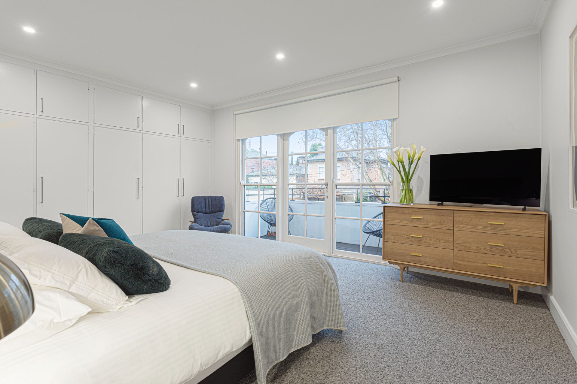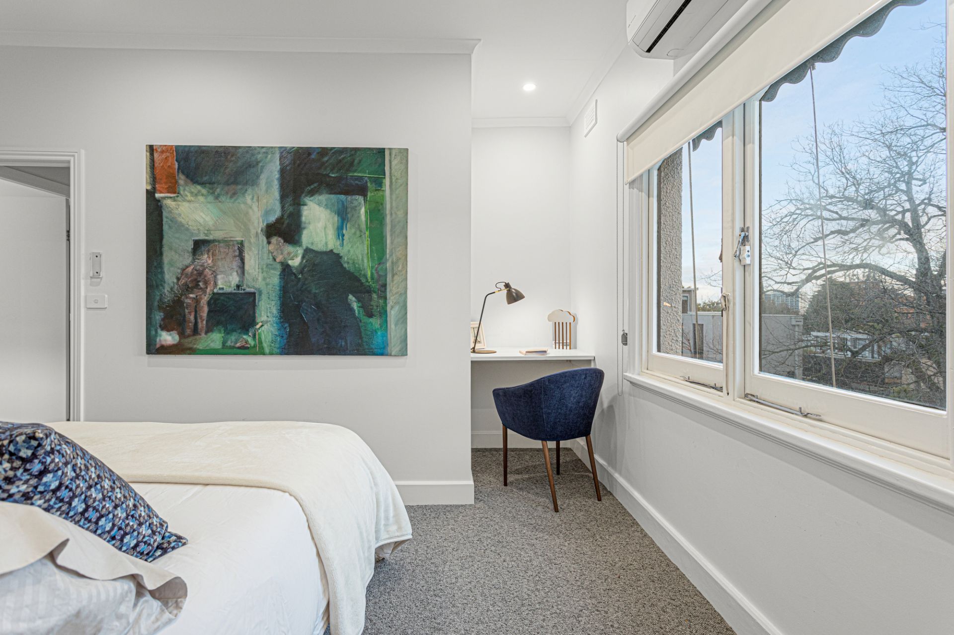 Two upstairs bedrooms are contemporary to the max. The main bedroom features an impressive wall of full-height robes, balcony with leafy views over Caroline Street and a pristine ensuite. The second robed bedroom with a study nook and ensuite, has rooftop views, including the spire of Christ Church.