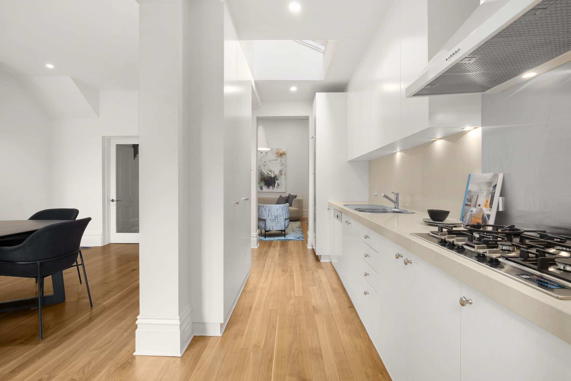 The sleek galley kitchen benefits from Bosch stainless appliances including a five burner gas hob, stone benchtops and extensive cabinetry. Three bedrooms include the magnificent master which is set at the front of the house and features two sets of French doors with shutters which open to a charming balcony, a walk-in robe and a pristine ensuite with bath. A second bedroom on this middle floor also benefits from a built-in robe and balcony access while another bedroom on the top floor offers panoramic city views and the flexibility to be used as a home office if needed. Other features of this tranquil city oasis include a powder room, double garage with laneway access, soaring ceilings, hardwood flooring, decorative ceiling roses, ducted heating, reverse cycle air conditioning and storage.
