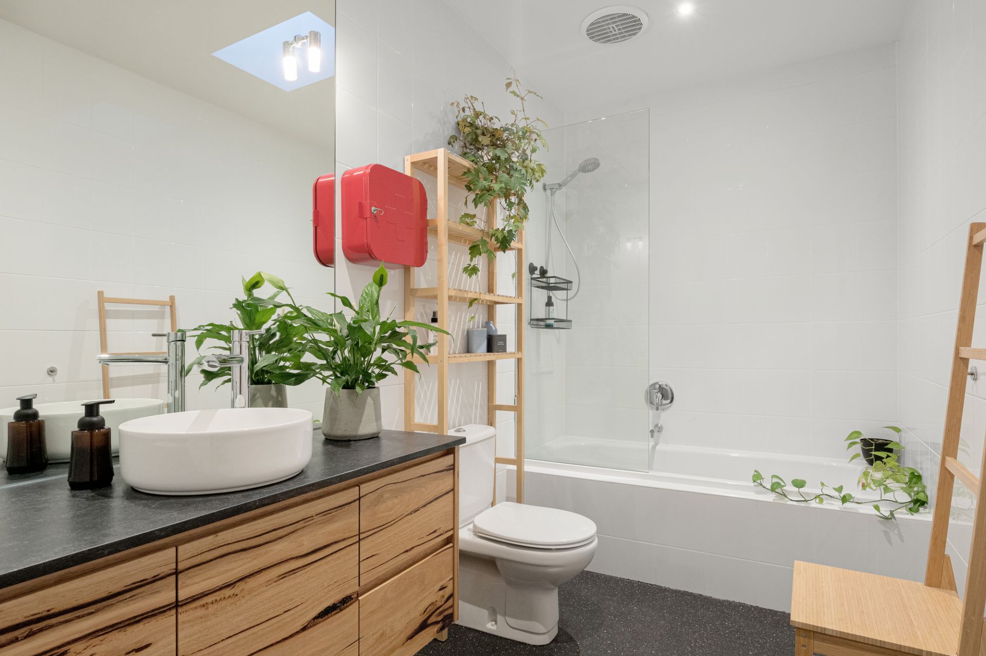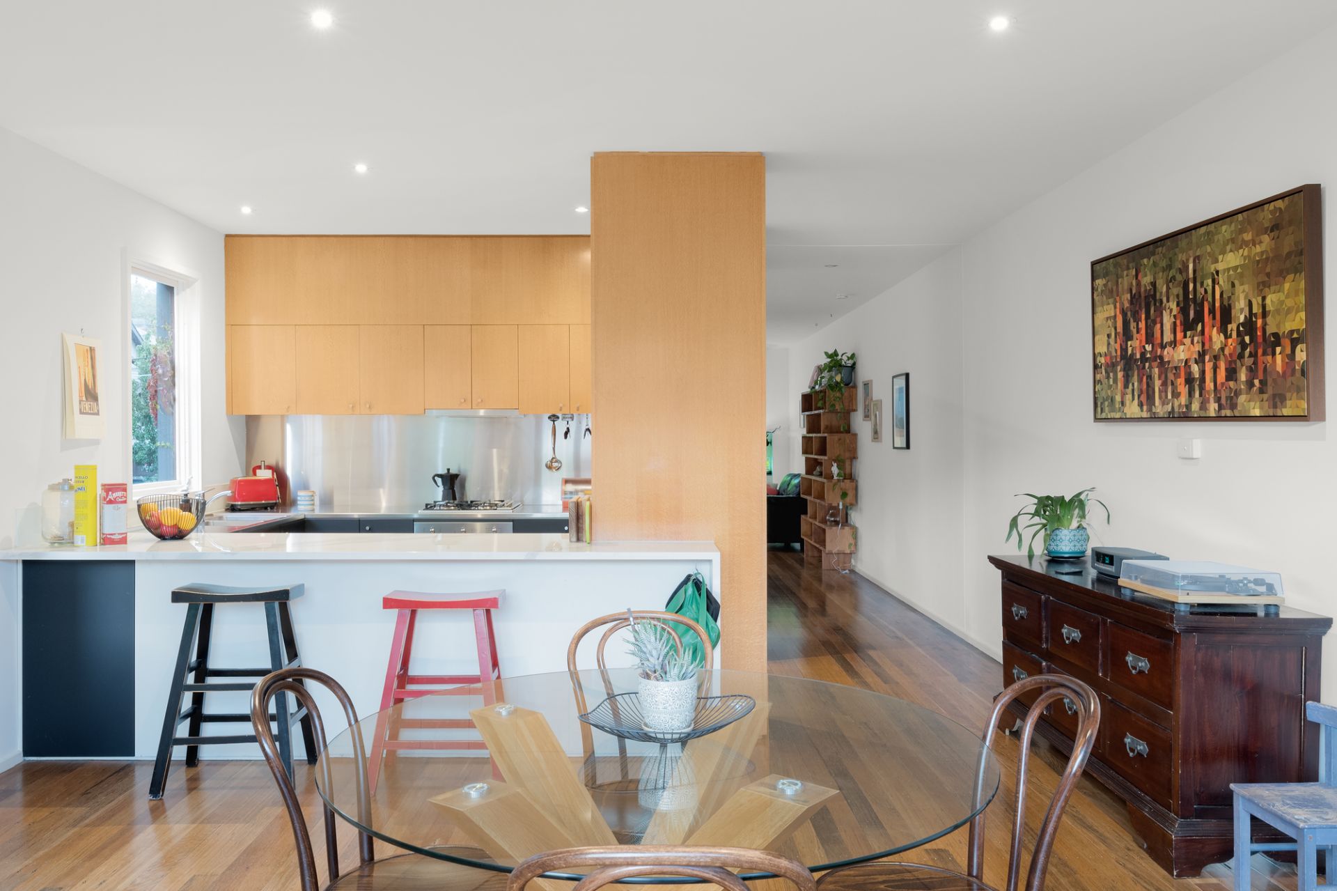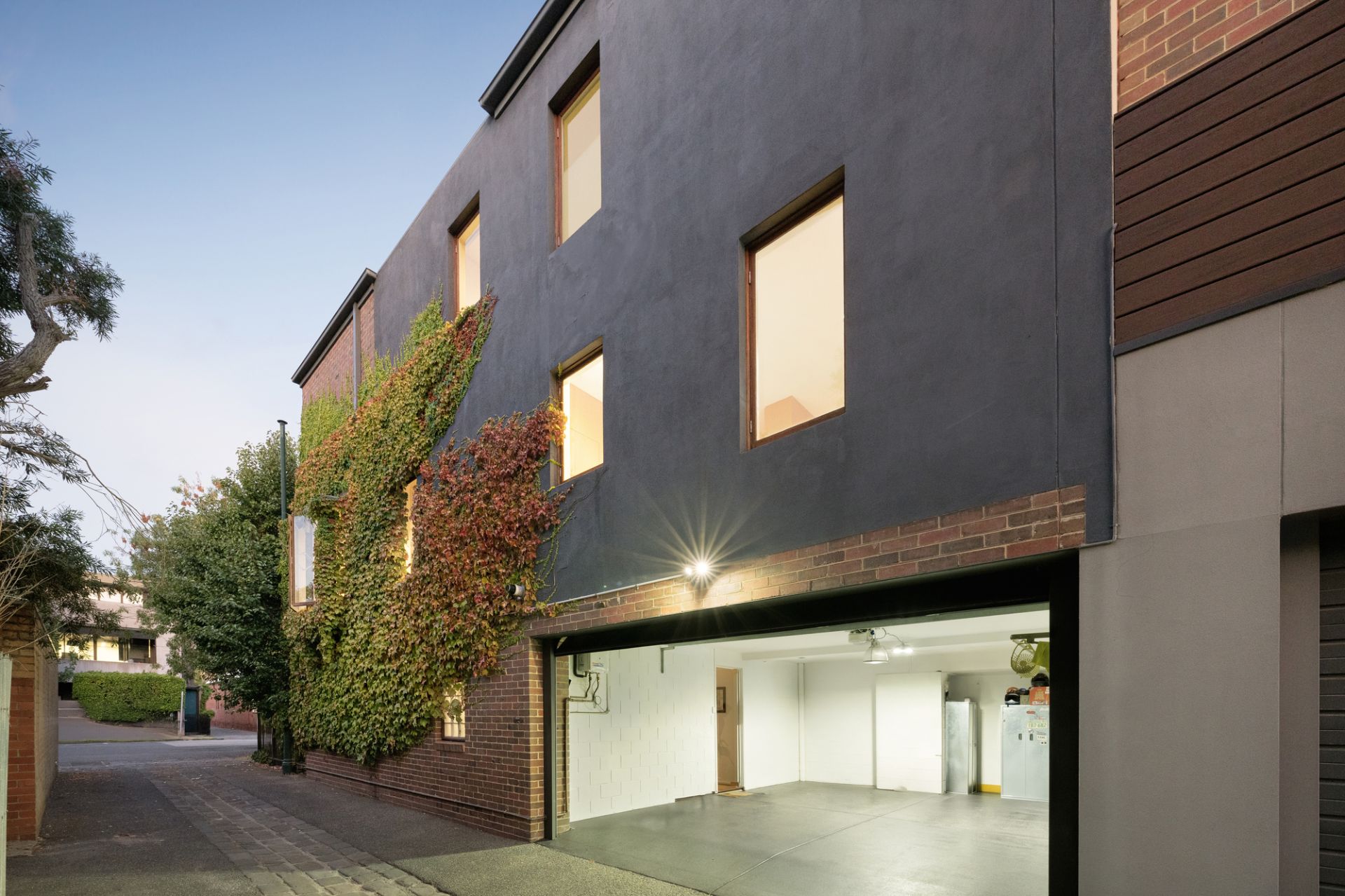Benefiting from second frontage to wide Felix Lane, the exceptional home lies beyond a peaceful front courtyard and sculpted ivy wall, with a ground-level bathroom/office pairing ideal as a guest’s suite and professional’s base. With top-floor accommodation both scenic and sumptuous, a walk-in robe, ensuite, and tranquil balcony enhance a sizeable main bedroom, while built-in robes and a trendy bathroom with bath service two impressive, added bedrooms. With a cherry-wood feature wall lining the staircase from ground to roof, a brilliant middle storey acts as the plan’s focal point, relishing ribbons of sunlight and calming vistas through oversized northern windows.