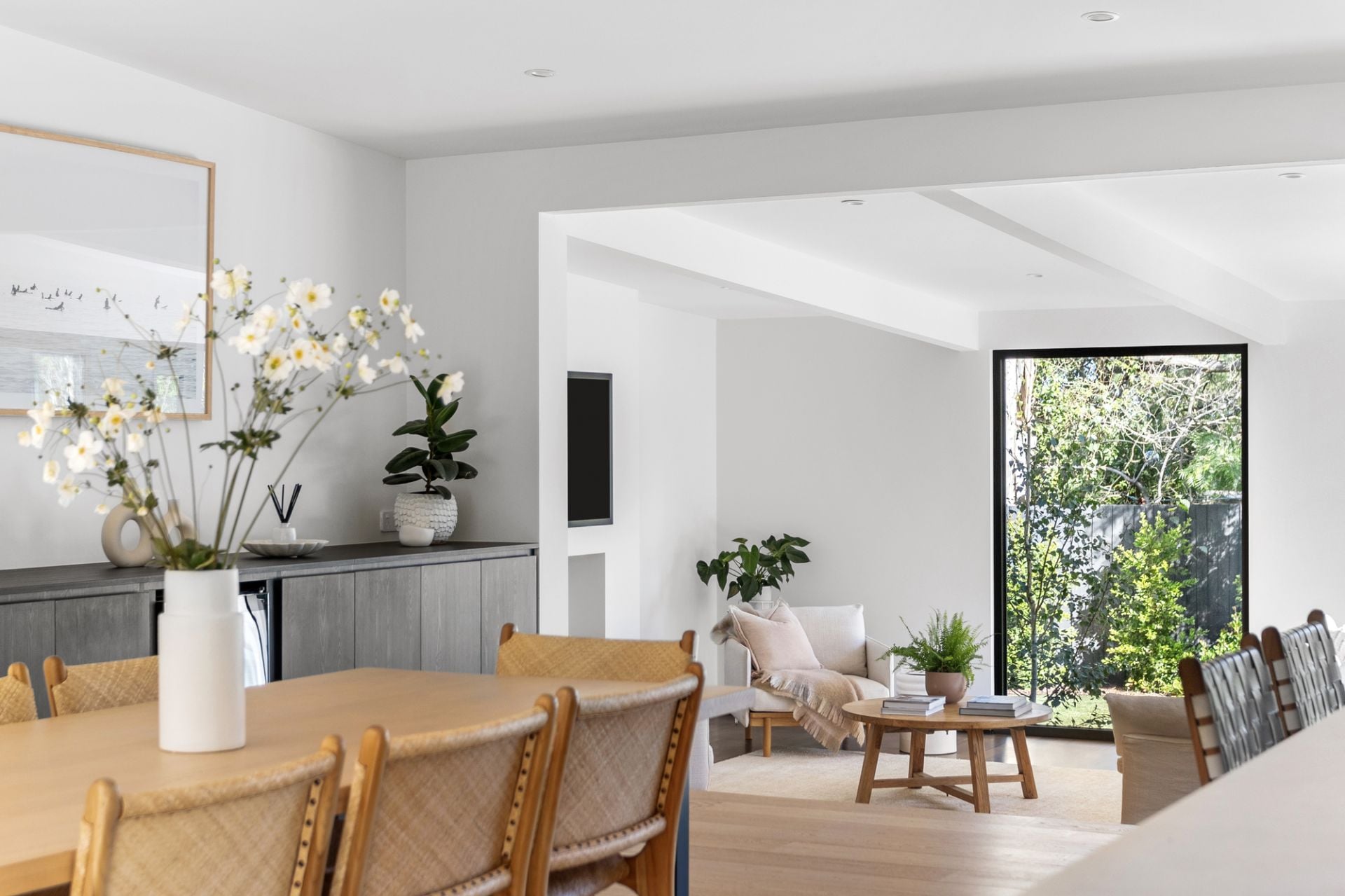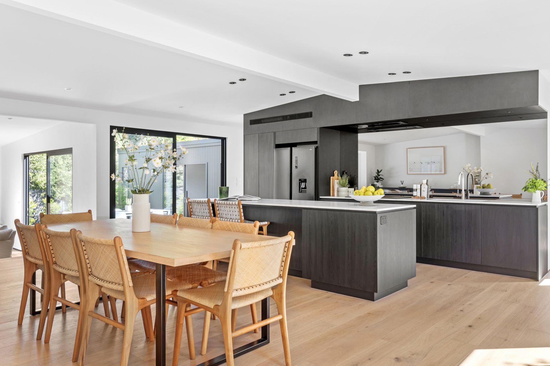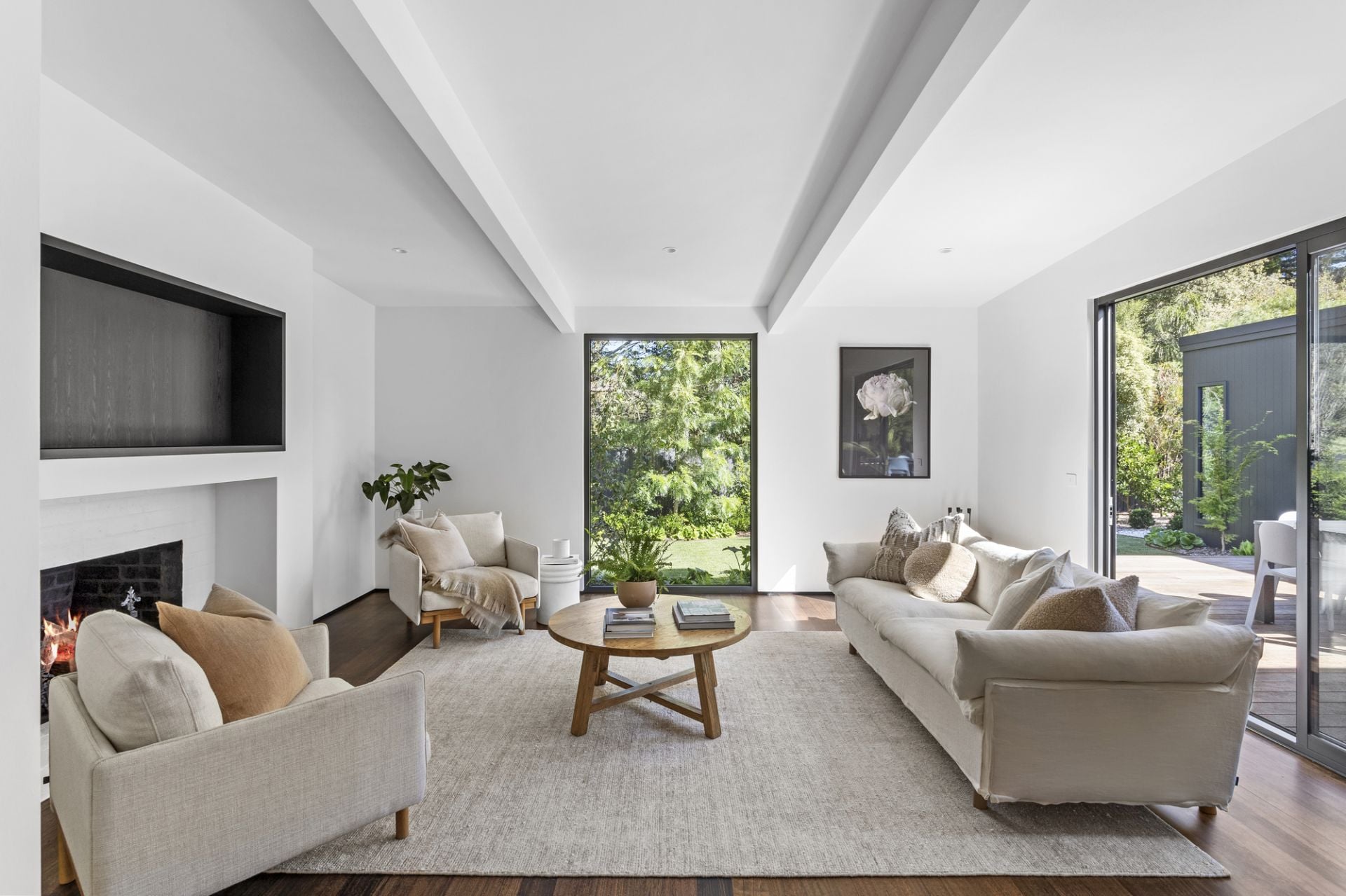 A strong sense of arrival captivates, leading to an intuitive floor plan that reveals a stunning kitchen with Lavistone benchtops, Italian-designed Artusi appliances, and an induction cooktop. The spacious dining area flows effortlessly into the inviting living space, where a large picture window frames an exquisite garden view, and an open fireplace adds relaxed comfort.