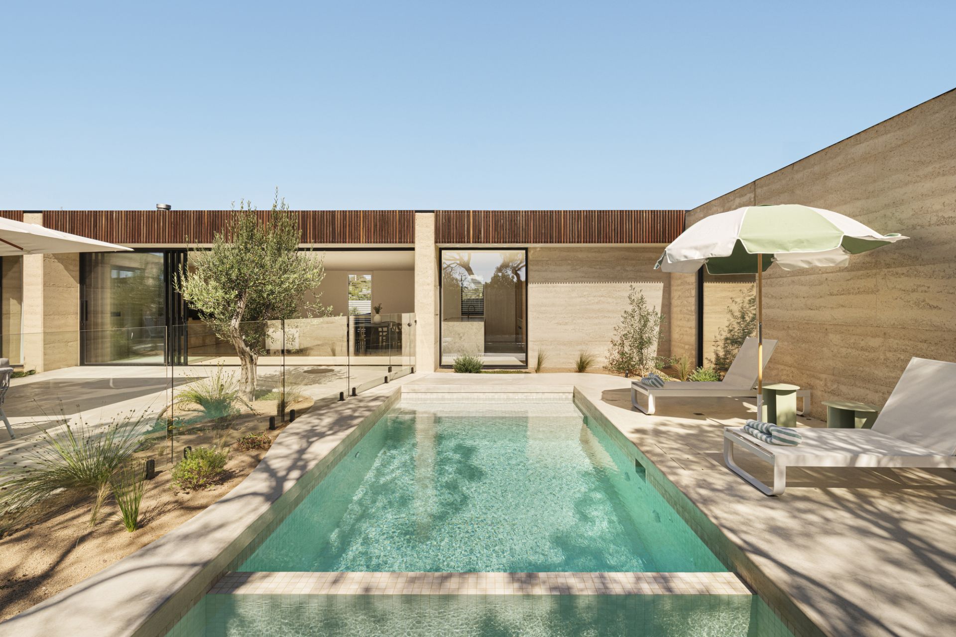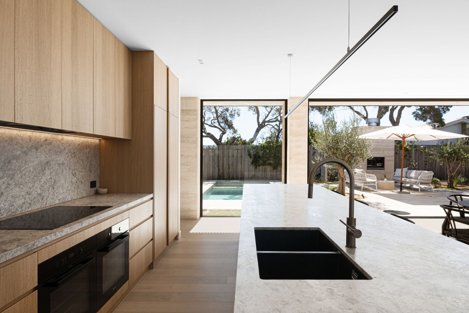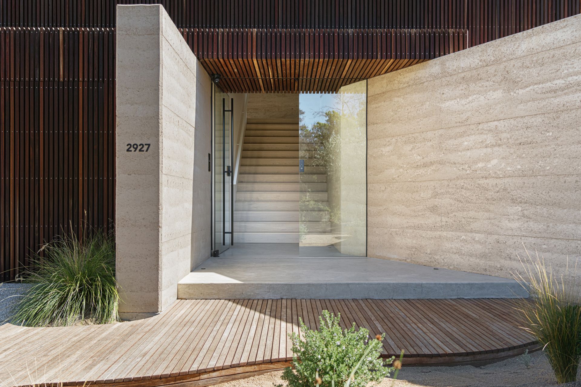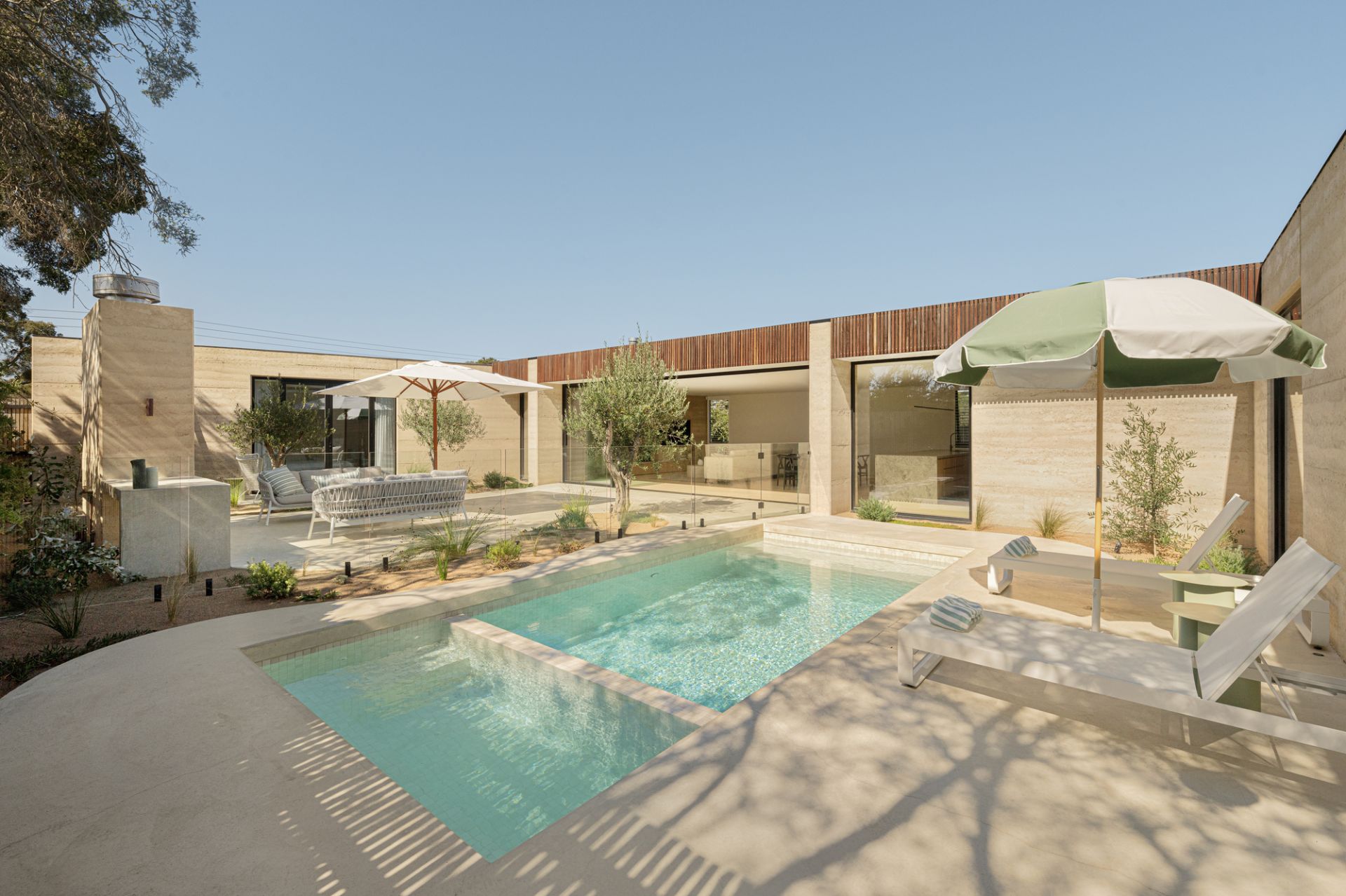 This prime coastal site is perfectly located opposite the beach, marina and yacht club, only a few minutes walk to the thriving village, and is a beautiful place to experience nature, and the house in nature. A minimal palette of warm Rammed Earth walls slice and frame the protected garden and gallery spaces. In complete contrast, Ironbark timber battens act as the softening element, creating screening, shadow and a porous opposition to the mass and solidity of the Rammed Earth.