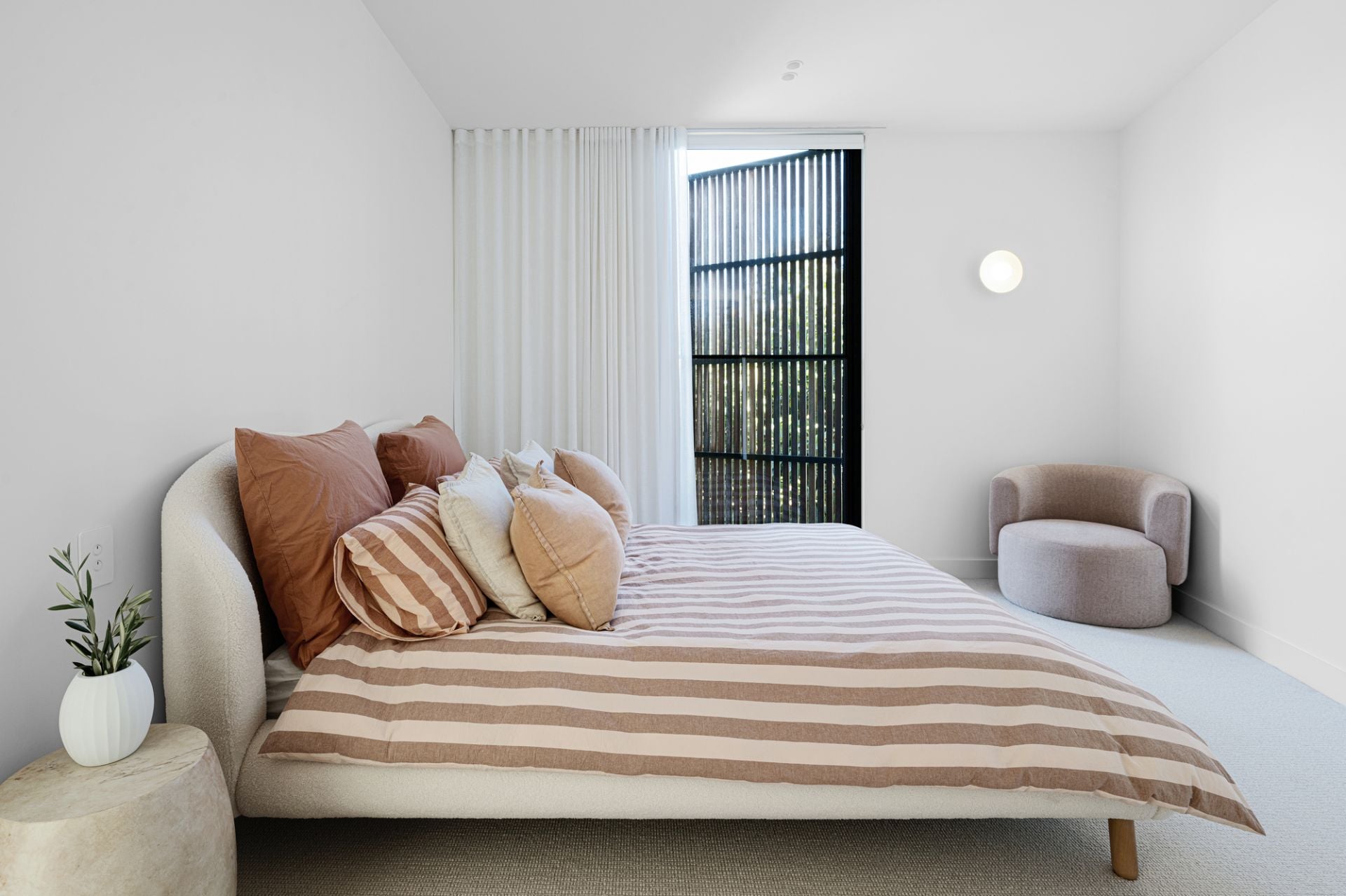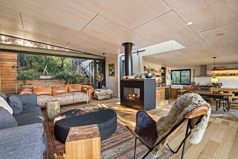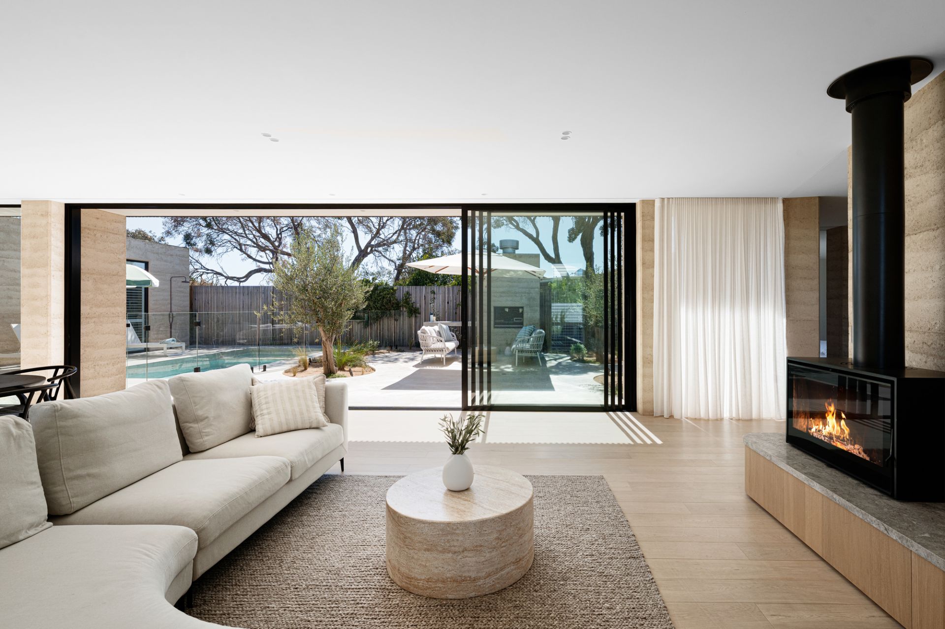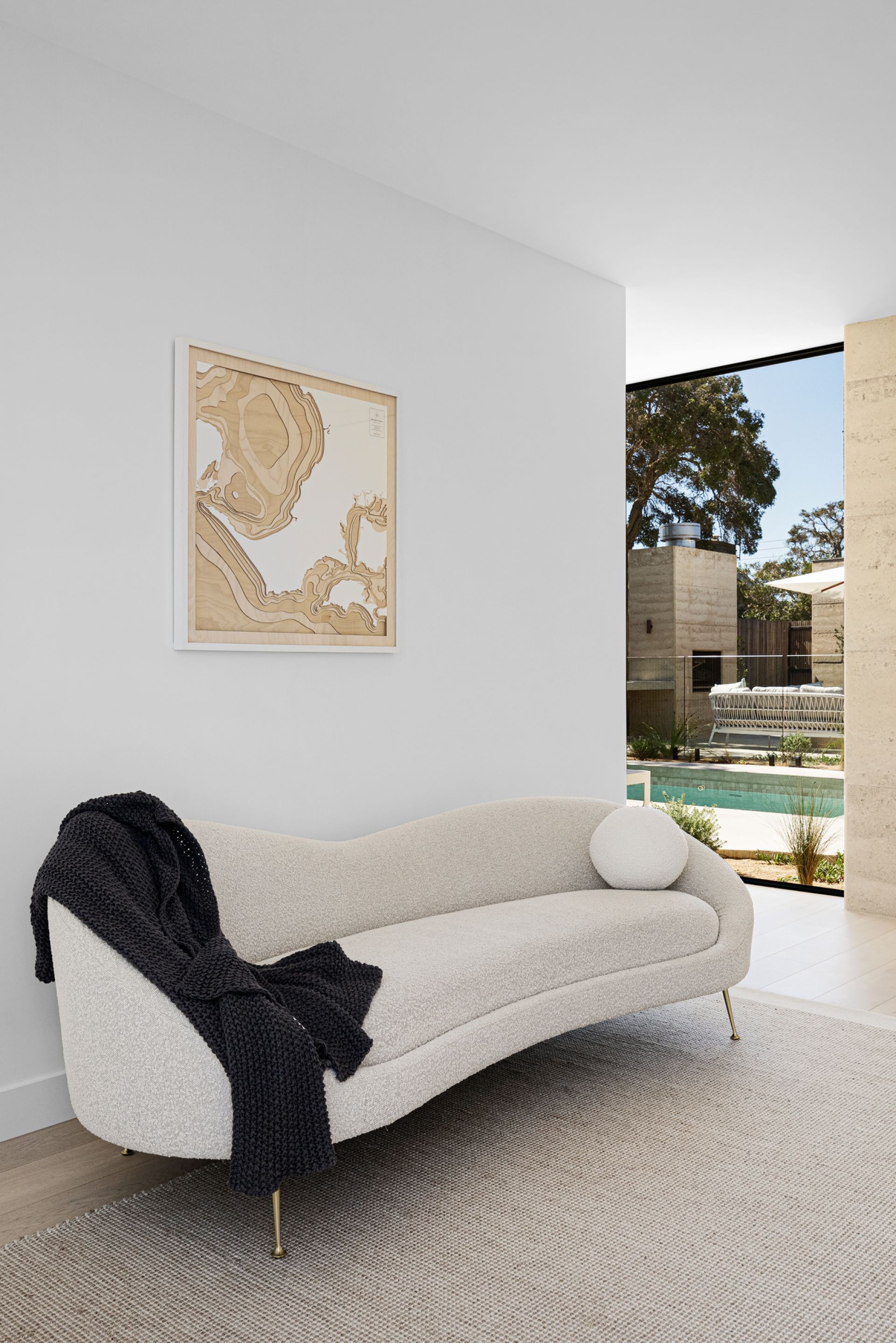 This prime coastal site is perfectly located opposite the beach, marina and yacht club, only a few minutes walk to the thriving village, and is a beautiful place to experience nature, and the house in nature. A minimal palette of warm Rammed Earth walls slice and frame the protected garden and gallery spaces. In complete contrast, Ironbark timber battens act as the softening element, creating screening, shadow and a porous opposition to the mass and solidity of the Rammed Earth.