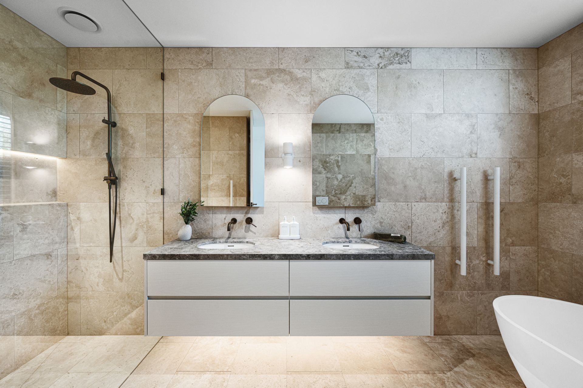 - Master suite with luxury bathroom, walk in robe and discreet ceiling mounted TV