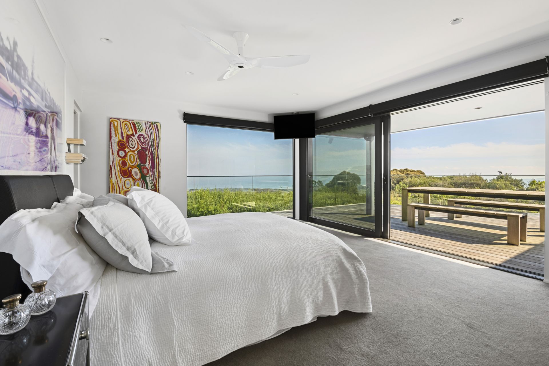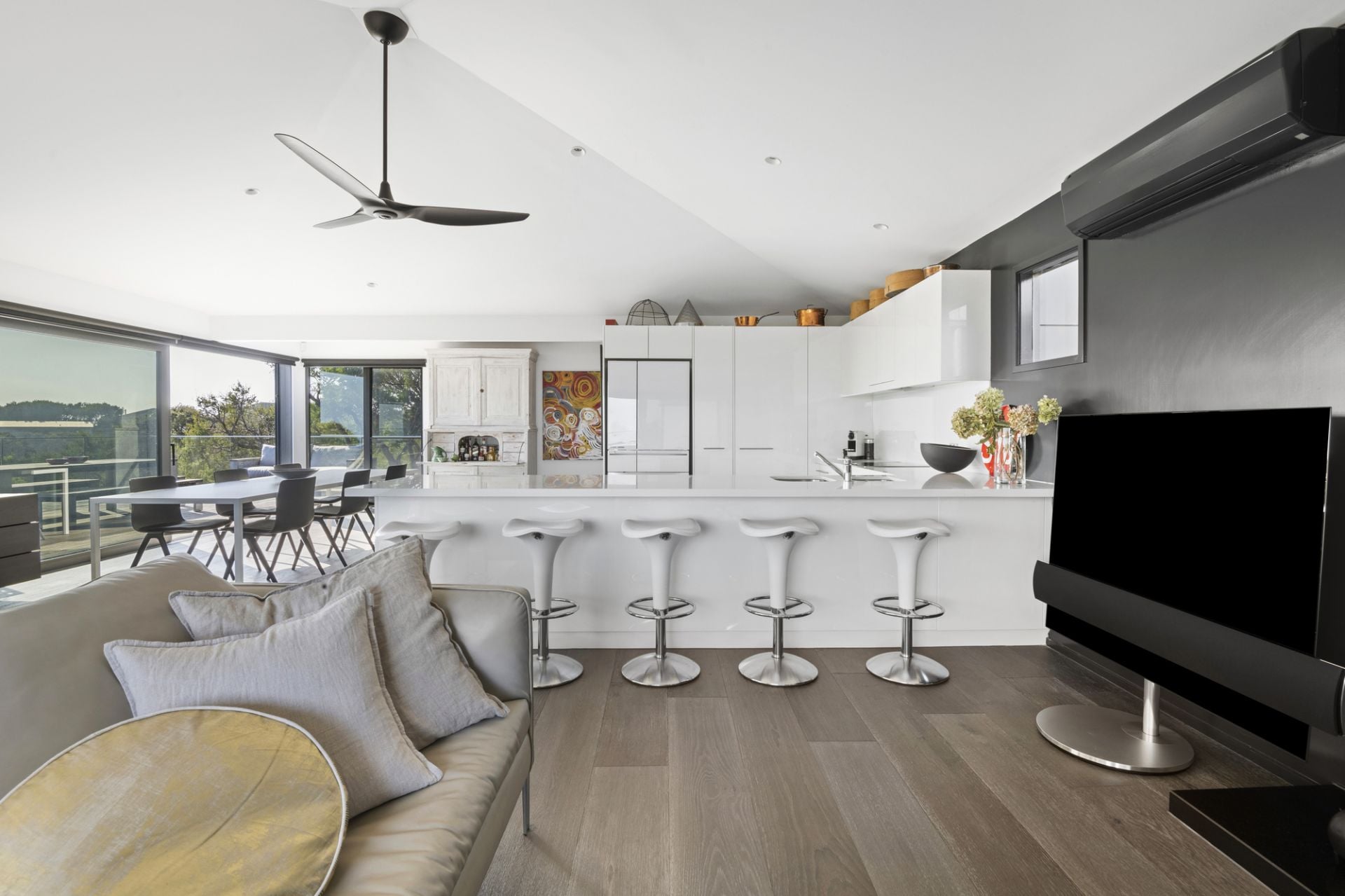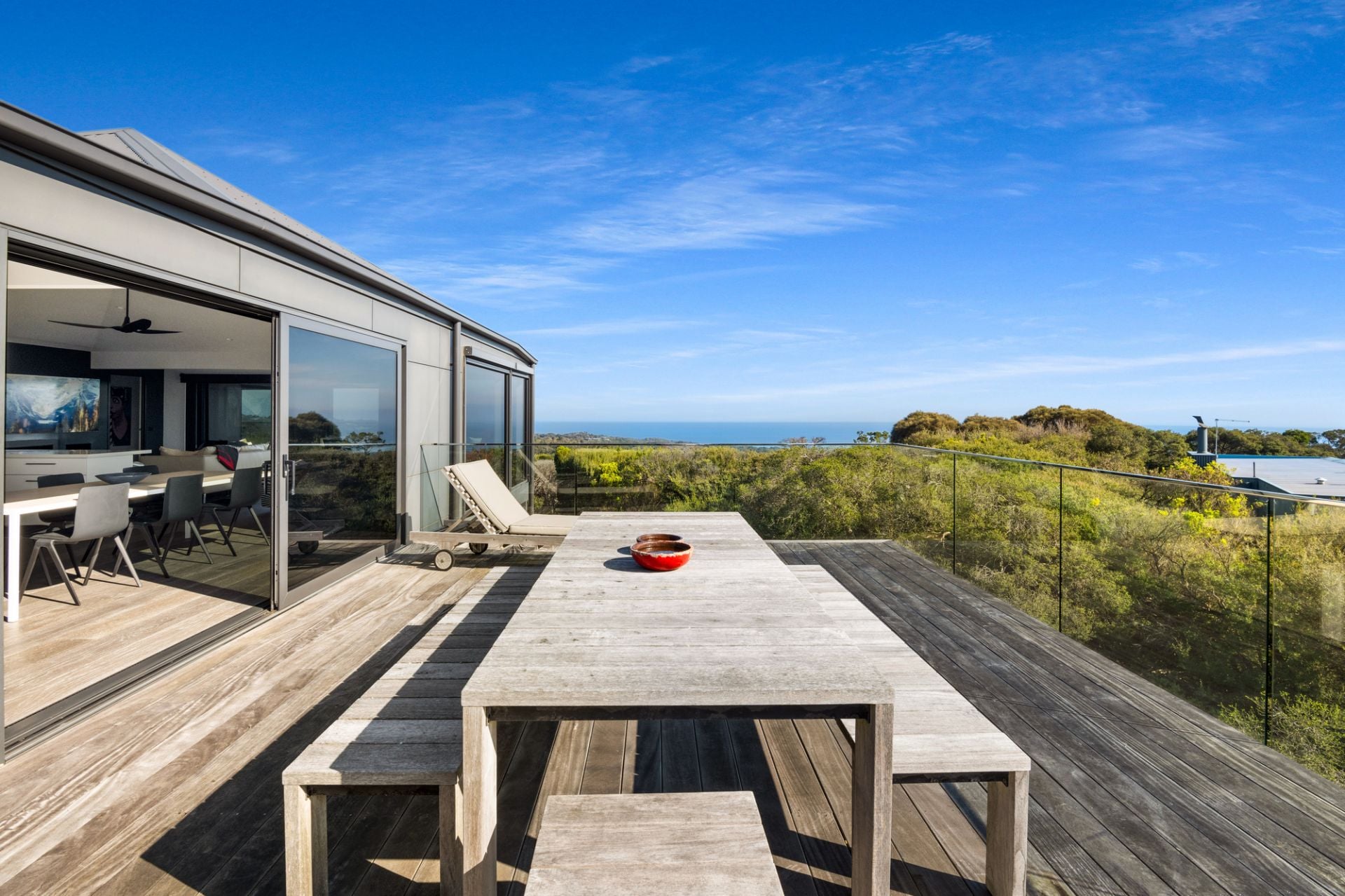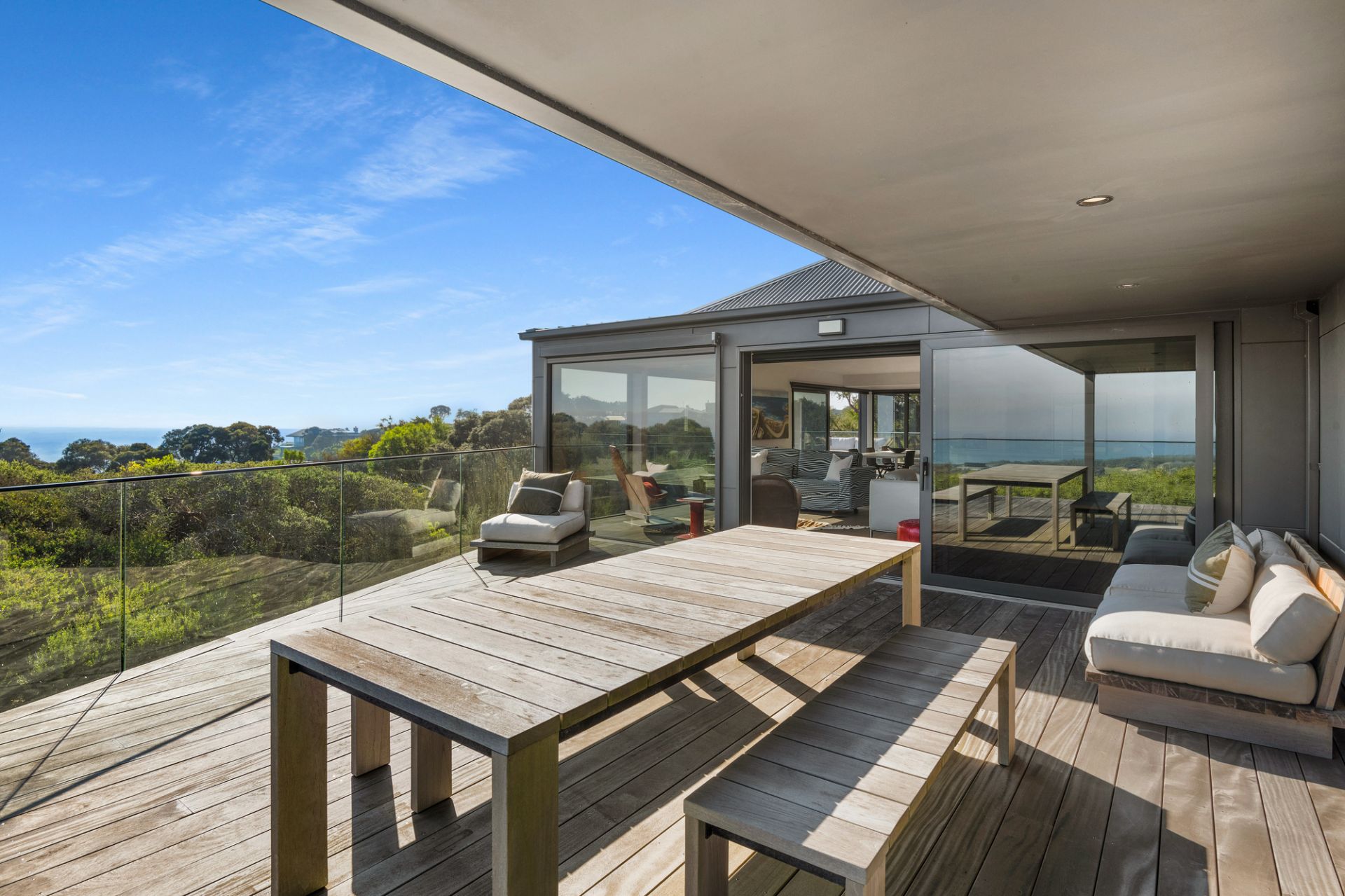 Hidden within native gardens, the expansive open-plan living and dining area with underfloor electric heating forms an irresistible connection to the environment and surrounding decked alfresco zones through walls of stacked glass that frame the ever-changing ocean panorama. An open fireplace adds warmth, while the sleek all-white kitchen, complete with stone benchtops and premium appliances, is designed for effortless entertaining.