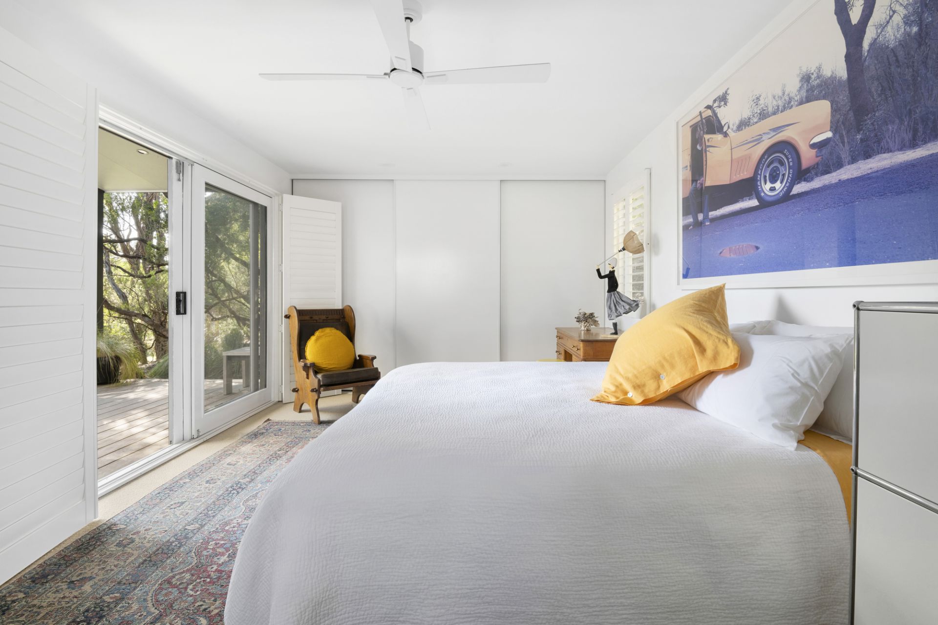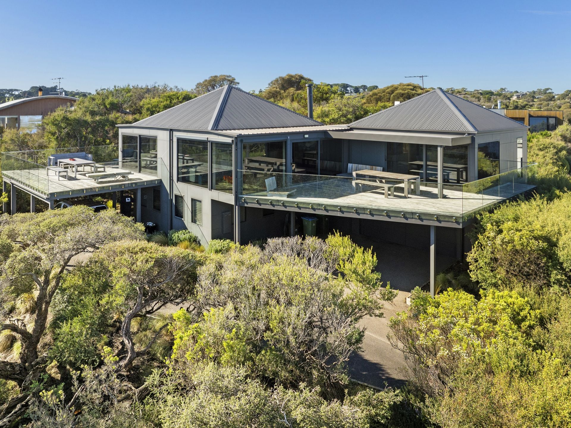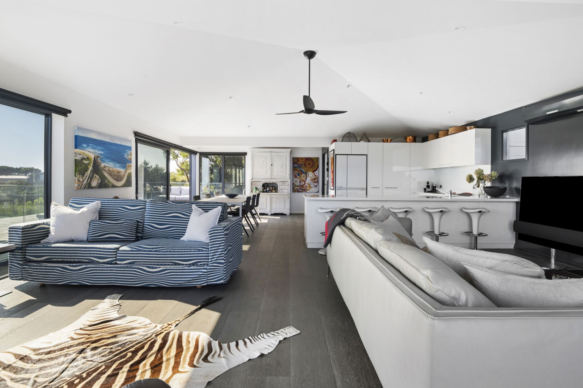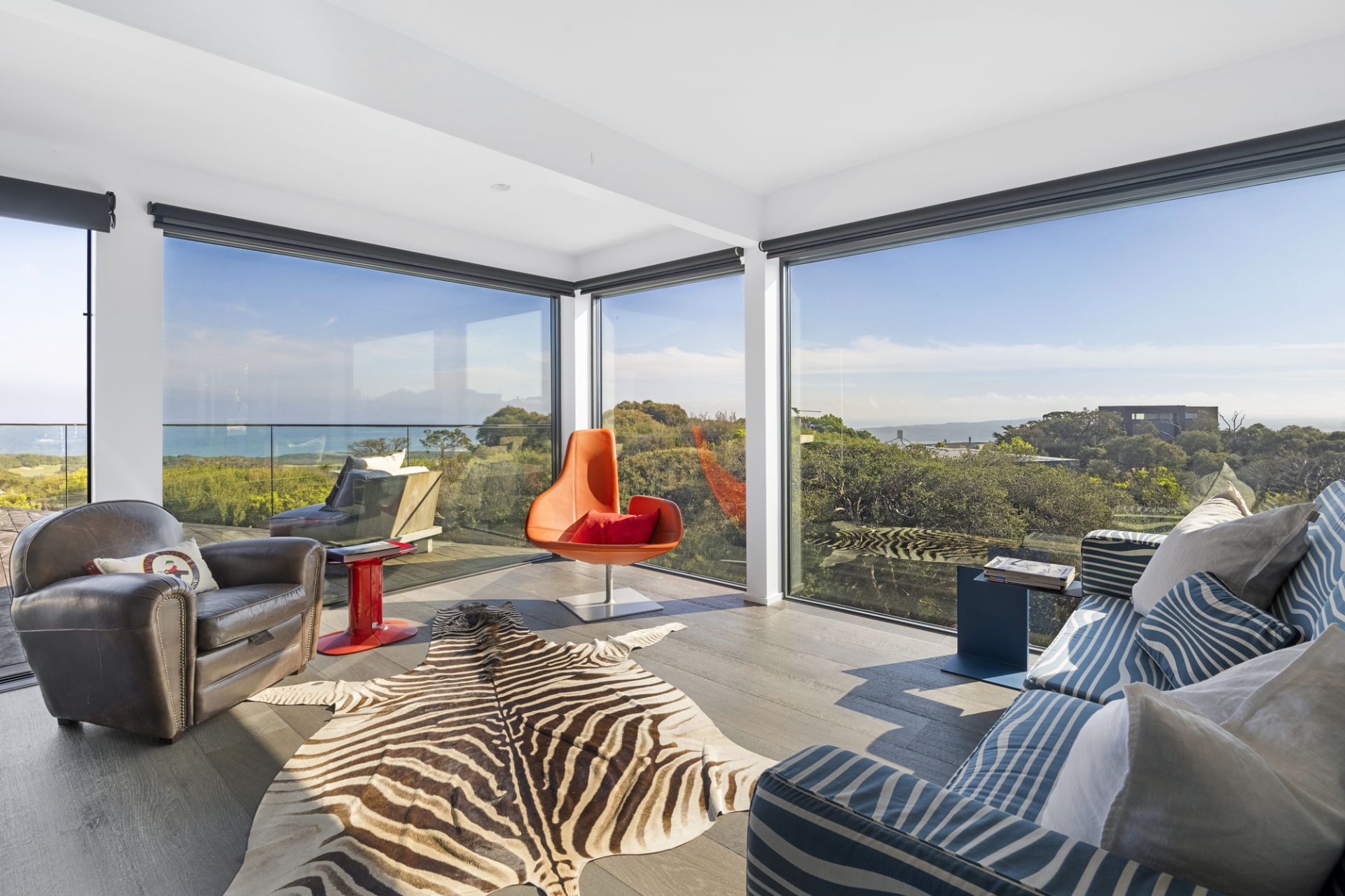 Hidden within native gardens, the expansive open-plan living and dining area with underfloor electric heating forms an irresistible connection to the environment and surrounding decked alfresco zones through walls of stacked glass that frame the ever-changing ocean panorama. An open fireplace adds warmth, while the sleek all-white kitchen, complete with stone benchtops and premium appliances, is designed for effortless entertaining.