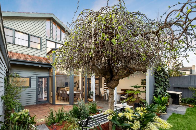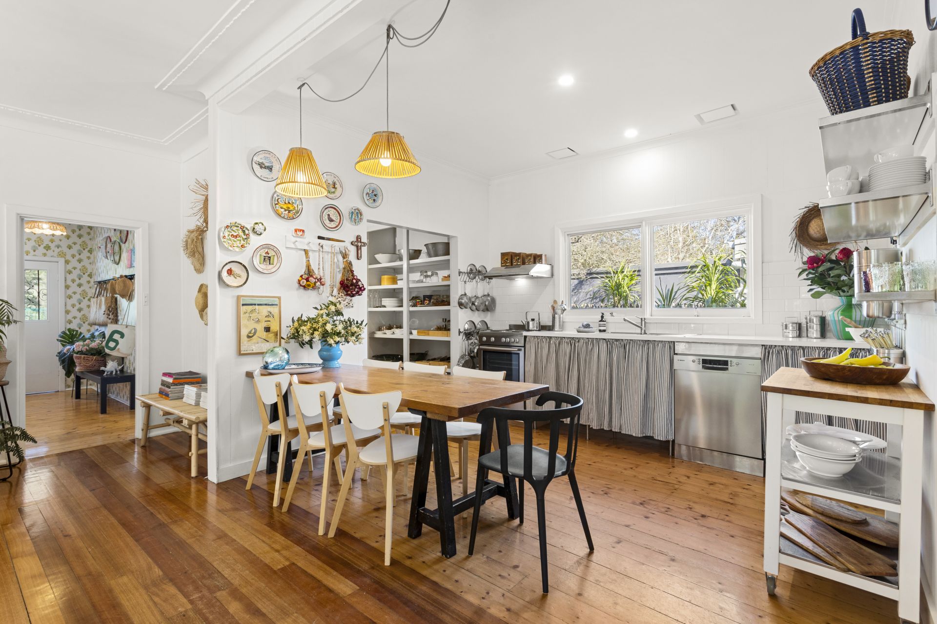 Introduced by French doors, the home’s indelible first impression is highlighted by rustic timber floors throughout an open plan family domain, where a generous living space is warmed by gas, wood fire with a split system air conditioning. An intimate dining zone sits adjacent to a character rich chef’s kitchen and adjoining Butler’s pantry. Quality European appliances and abundant storage enhance the appeal of effortless entertaining, while a leafy outlook introduces lashings of natural light.