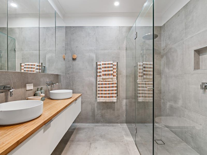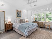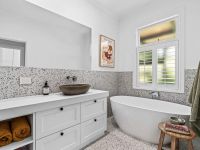 The master suite evokes the lavishness of a high-end hotel, boasting bay windows dressed with plantation shutters and sliding barn doors that conceal a commodious walk-in robe. The ensuite is a true masterpiece, featuring a frameless-glass rain shower. Further down the hall, you'll discover a full second bathroom, adorned with a freestanding soaker tub, to serve the two junior bedrooms.
